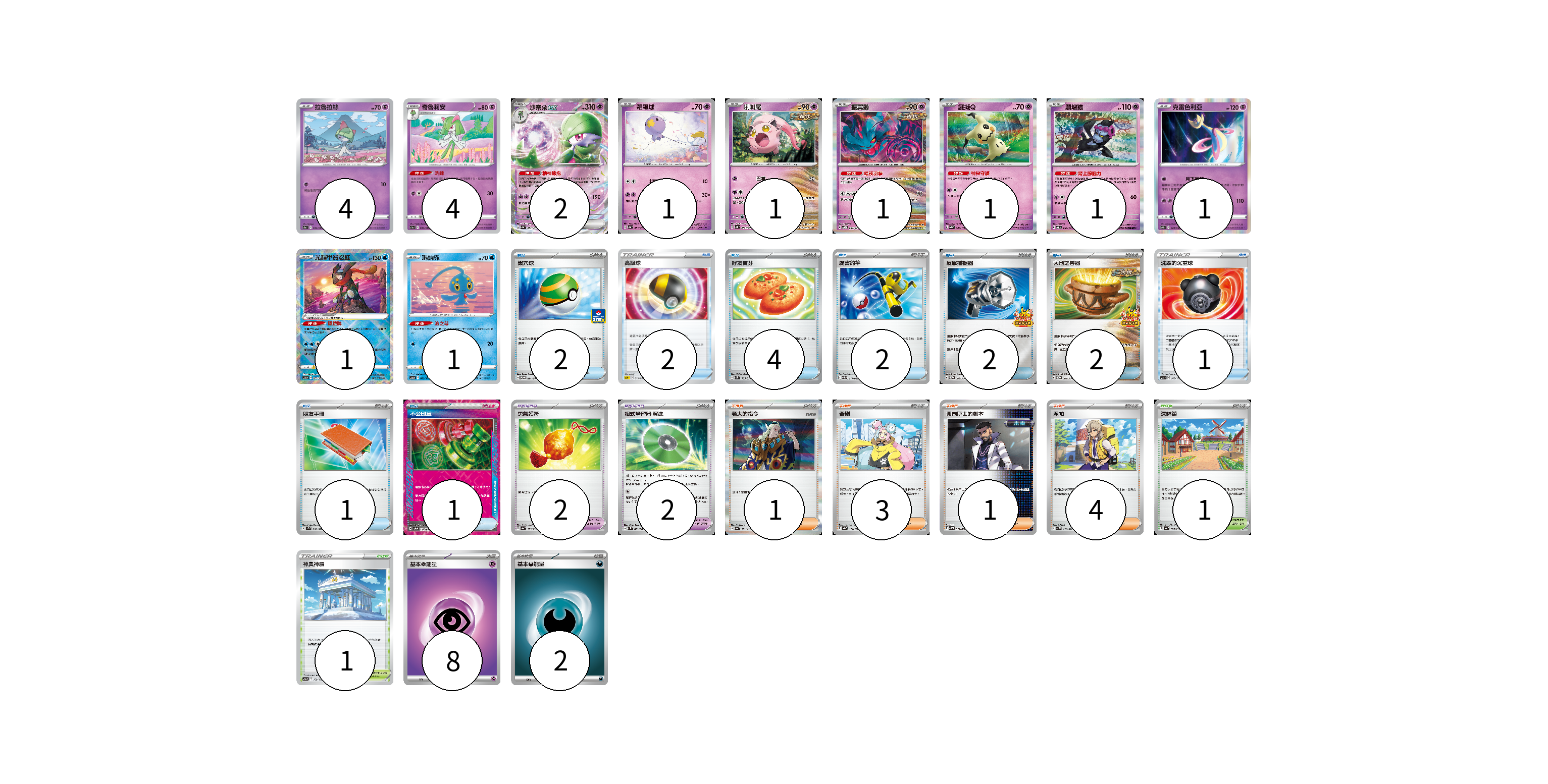 牌組構築方案 以此牌組為基礎新構築牌組 顯示卡面 顯示列表 寶可夢卡(18) 4 4 2 1 1 1 1 1 1 1 1 寶可夢道具(4) 2 2 物品卡(17) 2 2 4 2 2 2 1 1 1 支援者卡(9) 1 3 1 4 競技場卡(2) 1 1 能量卡(10) 8 2 寶可夢卡(18) 卡牌名稱 張數 卡牌名稱 張數 拉魯拉絲 S9a 032/067 04 奇魯莉安 S11a 037/068 04 沙奈朵ex SV4a 082/190 02 飄飄球 SV4a 083/190 01 吼叫尾 SV4K 032/066 01 振翼髮 SV5K 033/071 01 謎擬Q SV4a 088/190 01 願增猿 SV6 055/101 01 克雷色利亞 S10D 028/067 01 光輝甲賀忍蛙 S12a 033/172 01 瑪納霏 S12a 029/172 01 寶可夢道具(4) 卡牌名稱 張數 卡牌名稱 張數 勇氣護符 SV4a 169/190 02 招式學習器 演進 SV4M 063/066 02 物品卡(17) 卡牌名稱 張數 卡牌名稱 張數 巢穴球 SV-P 091/SV-P 02 高級球 SDP 015/022 02 好友寶芬 SV5K 063/071 04 厲害釣竿 SVEM 011/020 02 反擊捕捉器 SV-P 083/SV-P 02 大地之容器 SV-P 084/SV-P 02 洗翠的沉重球 S12a 140/172 01 朋友手冊 SV1S 069/078 01 不公印章 SV5a 053/066 01 支援者卡(9) 卡牌名稱 張數 卡牌名稱 張數 老大的指令 SV4a 181/190 01 奇樹 SV4a 174/190 03 弗圖博士的劇本 SVHM 021/022 01 派帕 SV1V 076/078 04 競技場卡(2) 卡牌名稱 張數 卡牌名稱 張數 深缽鎮 SV4a 185/190 01 神奧神殿 S12a 169/172 01 能量卡(10) 卡牌名稱 張數 卡牌名稱 張數 基本【超】能量 SVHM PSY 08 基本【惡】能量 SVF DAR 02 以此牌組為基礎新構築牌組 牌組編碼 MuFiaZ-DoymRP-JwaPfP copy 列印牌組單 牌組編碼已複製 分享至SNS