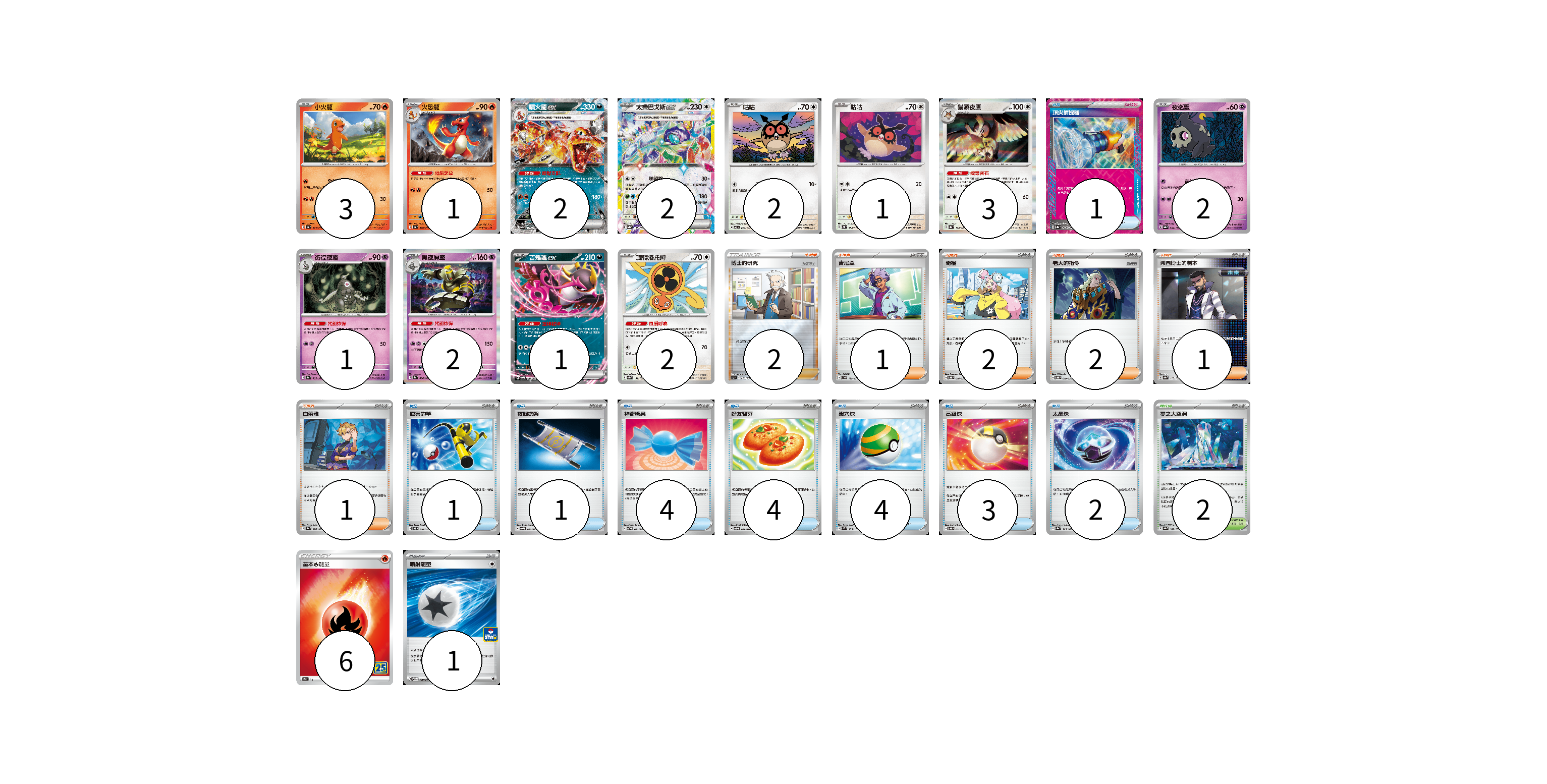 牌組構築方案 以此牌組為基礎新構築牌組 顯示卡面 顯示列表 寶可夢卡(22) 3 1 2 2 2 1 3 2 1 2 1 2 物品卡(20) 1 1 1 4 4 4 3 2 支援者卡(9) 2 1 2 2 1 1 競技場卡(2) 2 能量卡(7) 6 1 寶可夢卡(22) 卡牌名稱 張數 卡牌名稱 張數 小火龍 SV4a 025/190 03 火恐龍 SV4a 026/190 01 噴火龍ex SV4a 115/190 02 太樂巴戈斯ex SV8a 136/187 02 咕咕 SV7 076/102 02 咕咕 SV5K 054/071 01 貓頭夜鷹 SV8a 128/187 03 夜巡靈 SV8a 064/187 02 彷徨夜靈 SV8a 065/187 01 黑夜魔靈 SV8a 066/187 02 吉雉雞ex SVOM 009/021 01 旋轉洛托姆 SV8a 131/187 02 物品卡(20) 卡牌名稱 張數 卡牌名稱 張數 頂尖捕捉器 SV8a 148/187 01 厲害釣竿 SVOD 010/020 01 夜間擔架 SVOM 016/021 01 神奇糖果 SVTG 014/019 04 好友寶芬 SVOD 011/020 04 巢穴球 SVM 133/175 04 高級球 SVOD 012/020 03 太晶珠 SV8a 145/187 02 支援者卡(9) 卡牌名稱 張數 卡牌名稱 張數 博士的研究(山梨博士) SO 026/030 02 吉尼亞 SVD 129/139 01 奇樹 SVOD 016/020 02 老大的指令 SVOD 019/020 02 弗圖博士的劇本 SV8a 175/187 01 白蕾雅 SV8a 176/187 01 競技場卡(2) 卡牌名稱 張數 卡牌名稱 張數 零之大空洞 SV8a 182/187 02 能量卡(7) 卡牌名稱 張數 卡牌名稱 張數 基本火能量 S8a FIR 06 噴射能量 SV-P 180/SV-P 01 以此牌組為基礎新構築牌組 牌組編碼 MuKbyz-uZKYTB-TXwXhh copy 列印牌組單 牌組編碼已複製 分享至SNS