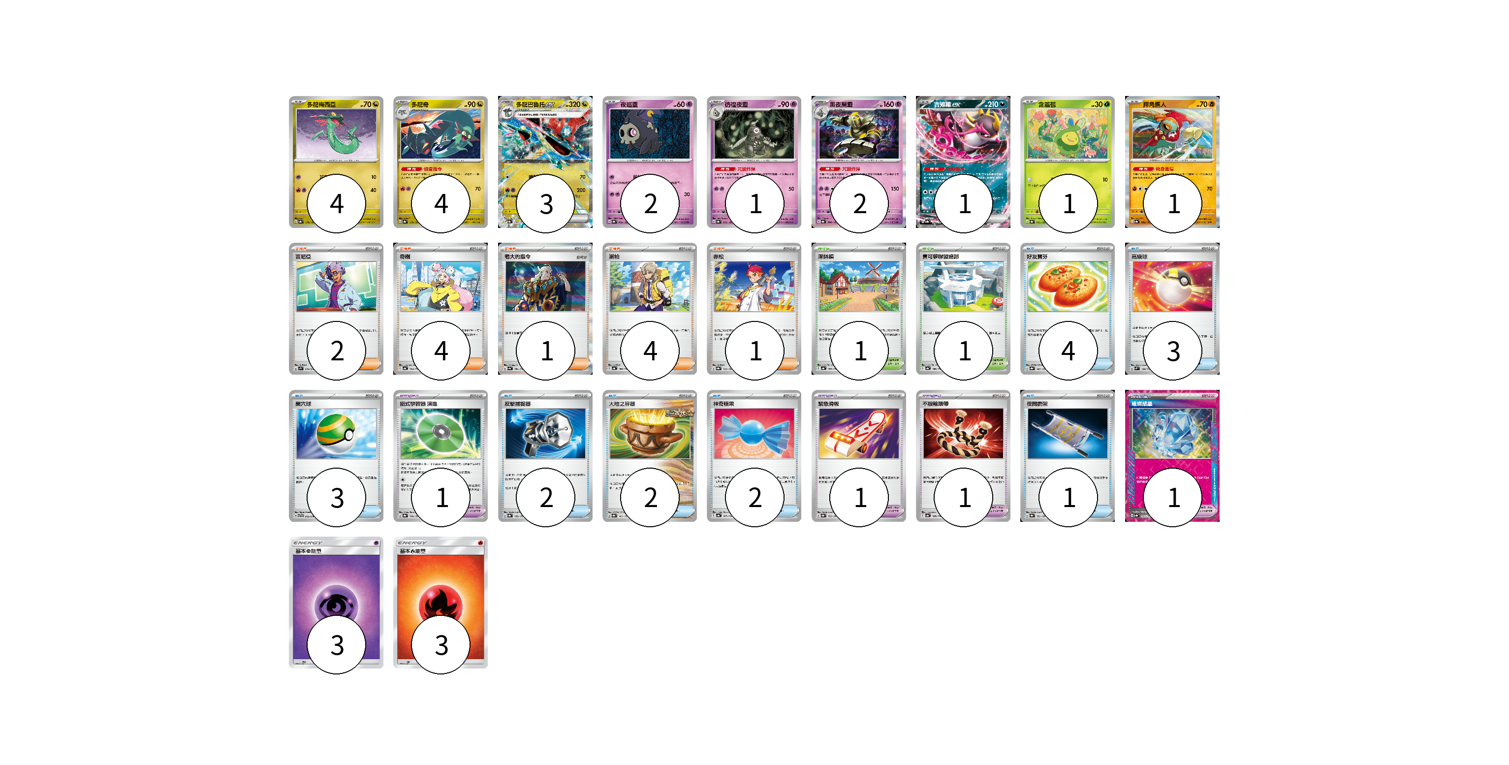 牌組構築方案 以此牌組為基礎新構築牌組 顯示卡面 顯示列表 寶可夢卡(19) 4 4 3 2 1 2 1 1 1 寶可夢道具(4) 1 1 1 1 物品卡(17) 4 3 3 2 2 2 1 支援者卡(12) 2 4 1 4 1 競技場卡(2) 1 1 能量卡(6) 3 3 寶可夢卡(19) 卡牌名稱 張數 卡牌名稱 張數 多龍梅西亞 SV8a 118/187 04 多龍奇 SV8a 119/187 04 多龍巴魯托ex SV8a 120/187 03 夜巡靈 SV8a 064/187 02 彷徨夜靈 SV8a 065/187 01 黑夜魔靈 SV8a 066/187 02 吉雉雞ex SV8a 104/187 01 含羞苞 SV8a 001/187 01 摔角鷹人 SV8a 084/187 01 寶可夢道具(4) 卡牌名稱 張數 卡牌名稱 張數 招式學習器 演進 SV8a 160/187 01 緊急滑板 SV8a 153/187 01 不服輸頭帶 SV4a 168/190 01 璀璨結晶 SV8a 152/187 01 物品卡(17) 卡牌名稱 張數 卡牌名稱 張數 好友寶芬 SV8a 147/187 04 高級球 SVM 134/175 03 巢穴球 SVTG 012/019 03 反擊捕捉器 SV8a 139/187 02 大地之容器 SV8a 143/187 02 神奇糖果 SV4a 163/190 02 夜間擔架 SV8a 151/187 01 支援者卡(12) 卡牌名稱 張數 卡牌名稱 張數 吉尼亞 SV1S 074/078 02 奇樹 SV4a 174/190 04 老大的指令 SV4a 181/190 01 派帕 SV4a 180/190 04 赤松 SV8a 163/187 01 競技場卡(2) 卡牌名稱 張數 卡牌名稱 張數 深缽鎮 SV4a 185/190 01 寶可夢聯盟總部 SV4a 186/190 01 能量卡(6) 卡牌名稱 張數 卡牌名稱 張數 基本超能量 AS6D PSY 03 基本火能量 AS6D FIR 03 以此牌組為基礎新構築牌組 牌組編碼 MuKdcd-srgHBz-bYpZiz copy 列印牌組單 牌組編碼已複製 分享至SNS