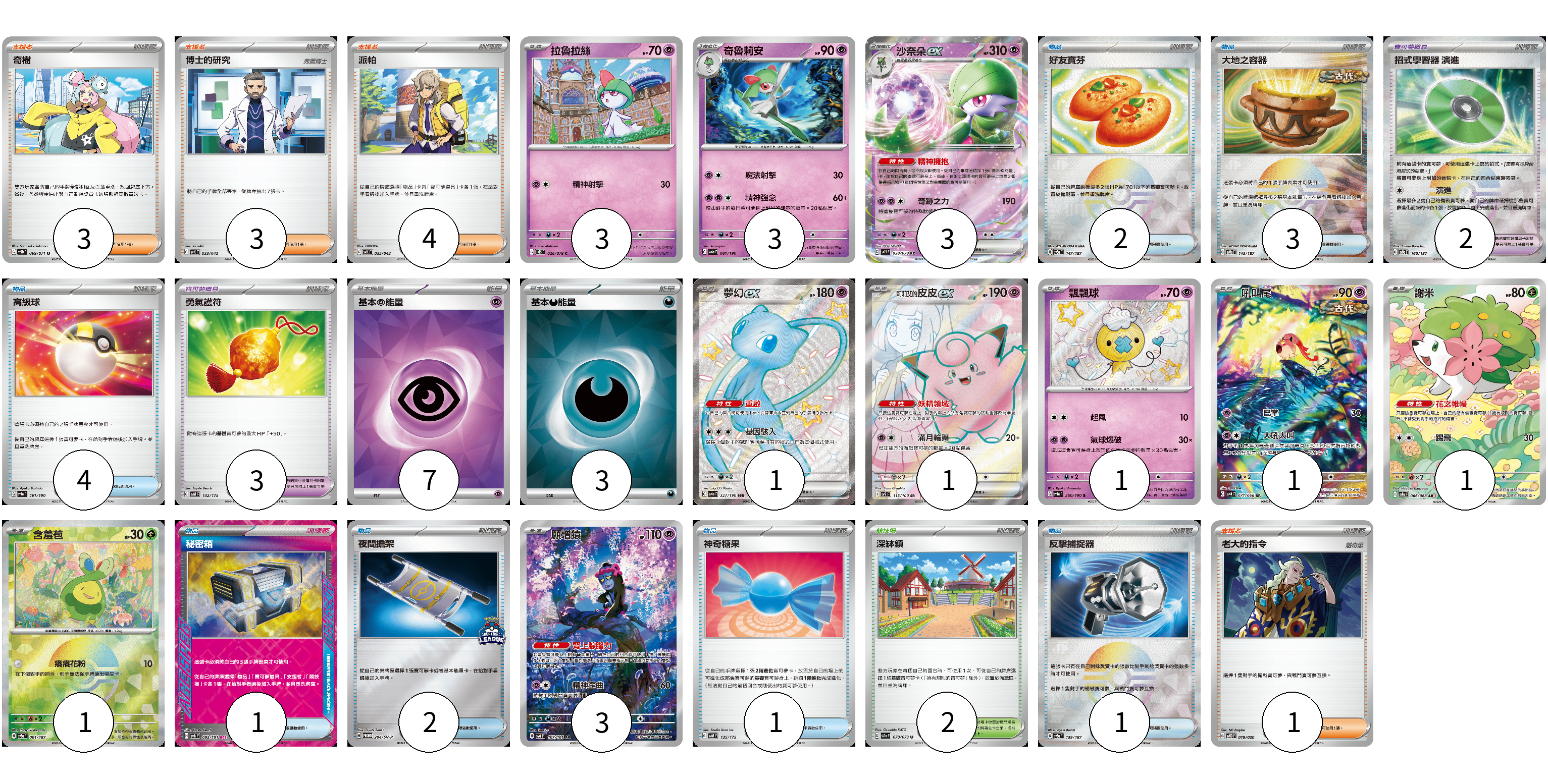 牌組構築方案 以此牌組為基礎新構築牌組 顯示卡面 顯示列表 寶可夢卡(18) 3 3 3 1 1 1 1 1 1 3 寶可夢道具(5) 2 3 物品卡(14) 2 3 4 1 2 1 1 支援者卡(11) 3 3 4 1 競技場卡(2) 2 能量卡(10) 7 3 寶可夢卡(18) 卡牌名稱 張數 卡牌名稱 張數 拉魯拉絲 SV1S 026/078 03 奇魯莉安 SV4a 081/190 03 沙奈朵ex SV1S 028/078 03 夢幻ex SV4a 327/190 01 莉莉艾的皮皮ex SV9 115/100 01 飄飄球 SV4a 260/190 01 吼叫尾 SV4K 071/066 01 謝米 SV9a 066/063 01 含羞苞 SV8a 001/187 01 願增猿 SV6 107/101 03 寶可夢道具(5) 卡牌名稱 張數 卡牌名稱 張數 招式學習器 演進 SV8a 160/187 02 勇氣護符 SVM 142/175 03 物品卡(14) 卡牌名稱 張數 卡牌名稱 張數 好友寶芬 SV8a 147/187 02 大地之容器 SV8a 143/187 03 高級球 SV4a 161/190 04 秘密箱 SV6 092/101 01 夜間擔架 SV-P 204/SV-P 02 神奇糖果 SVM 135/175 01 反擊捕捉器 SV8a 139/187 01 支援者卡(11) 卡牌名稱 張數 卡牌名稱 張數 奇樹 SV2D 069/071 03 博士的研究 SVK 033/042 03 派帕 SVK 035/042 04 老大的指令 SVOD 019/020 01 競技場卡(2) 卡牌名稱 張數 卡牌名稱 張數 深缽鎮 SV1a 070/073 02 能量卡(10) 卡牌名稱 張數 卡牌名稱 張數 基本【超】能量 SVOD PSY 07 基本【惡】能量 SVOM DAR 03 以此牌組為基礎新構築牌組 牌組編碼 MuQVxH-NCssKx-sLtuXF copy 列印牌組單 牌組編碼已複製 分享至SNS