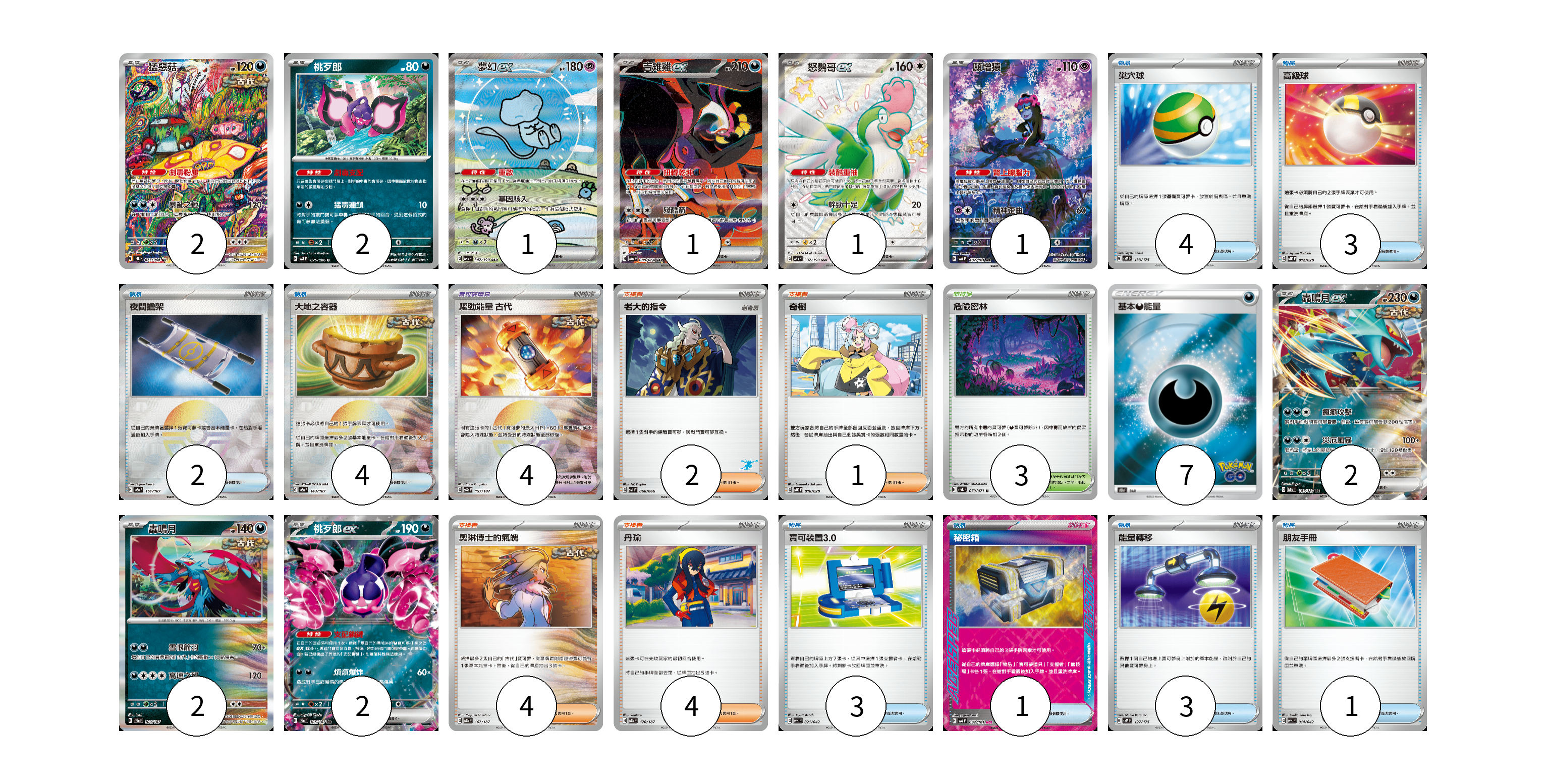 牌組構築方案 以此牌組為基礎新構築牌組 顯示卡面 顯示列表 寶可夢卡(14) 2 2 1 1 1 1 2 2 2 寶可夢道具(4) 4 物品卡(21) 4 3 2 4 3 1 3 1 支援者卡(11) 2 1 4 4 競技場卡(3) 3 能量卡(7) 7 寶可夢卡(14) 卡牌名稱 張數 卡牌名稱 張數 猛惡菇 SV4K 077/066 02 桃歹郎 SV8 075/106 02 夢幻ex SV4a 347/190 01 吉雉雞ex SV6a 089/064 01 怒鸚哥ex SV4a 337/190 01 願增猿 SV6 107/101 01 轟鳴月ex SV8a 101/187 02 轟鳴月 SV8a 100/187 02 桃歹郎ex SV8a 105/187 02 寶可夢道具(4) 卡牌名稱 張數 卡牌名稱 張數 驅勁能量 古代 SV8a 157/187 04 物品卡(21) 卡牌名稱 張數 卡牌名稱 張數 巢穴球 SVM 133/175 04 高級球 SVOD 012/020 03 夜間擔架 SV8a 151/187 02 大地之容器 SV8a 143/187 04 寶可裝置3.0 SVK 021/042 03 秘密箱 SV6 092/101 01 能量轉移 SVM 127/175 03 朋友手冊 SVK 014/042 01 支援者卡(11) 卡牌名稱 張數 卡牌名稱 張數 老大的指令 SVI 066/066 02 奇樹 SVOD 016/020 01 奧琳博士的氣魄 SV8a 167/187 04 丹瑜 SV8a 170/187 04 競技場卡(3) 卡牌名稱 張數 卡牌名稱 張數 危險密林 SV5K 070/071 03 能量卡(7) 卡牌名稱 張數 卡牌名稱 張數 基本惡能量 S10b DAR 07 以此牌組為基礎新構築牌組 牌組編碼 MvQojs-qpPVFt-zYNYfY copy 列印牌組單 牌組編碼已複製 分享至SNS