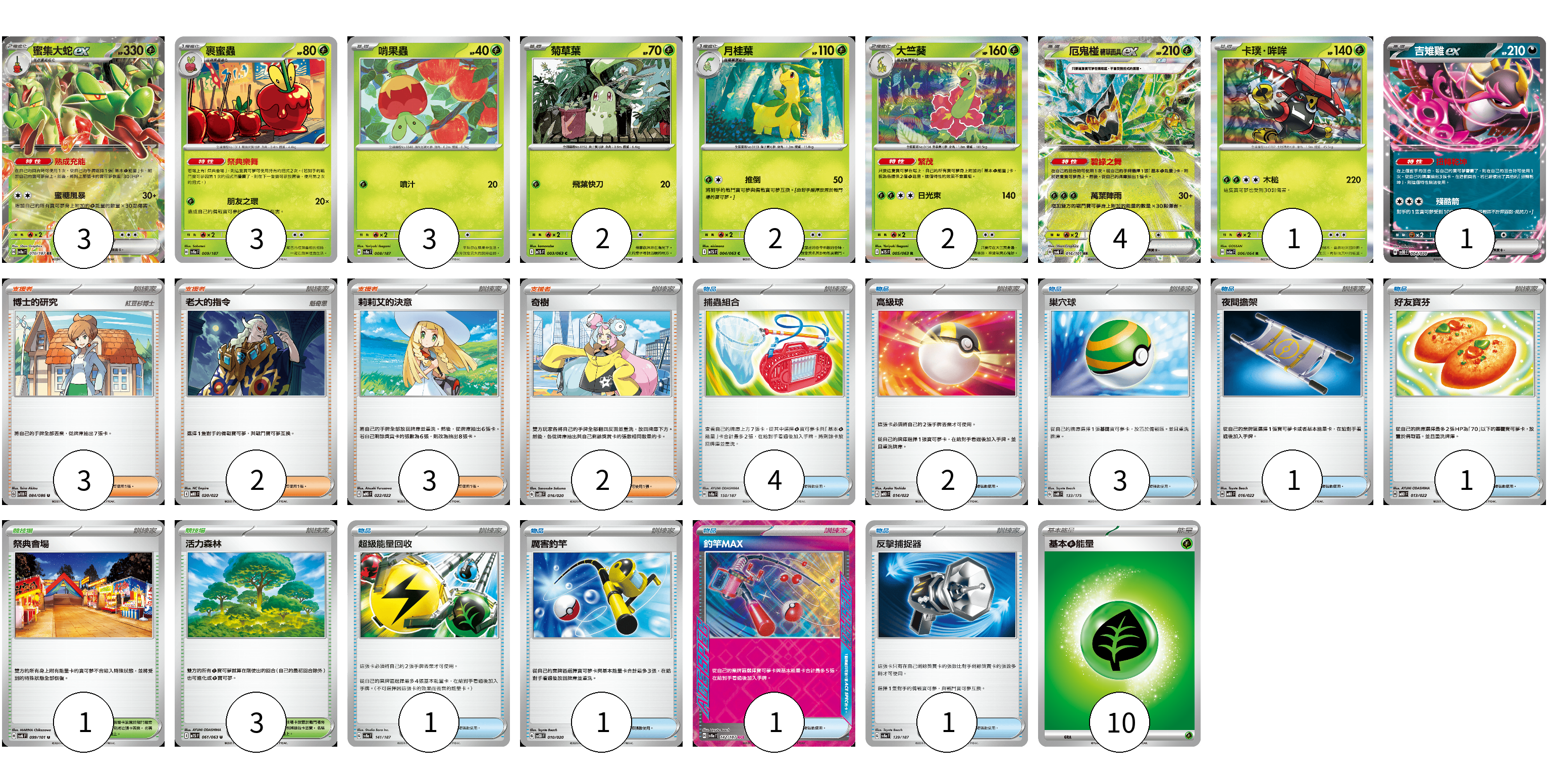 牌組構築方案 以此牌組為基礎新構築牌組 顯示卡面 顯示列表 寶可夢卡(21) 3 3 3 2 2 2 4 1 1 物品卡(15) 4 2 3 1 1 1 1 1 1 支援者卡(10) 3 2 3 2 競技場卡(4) 1 3 能量卡(10) 10 寶可夢卡(21) 卡牌名稱 張數 卡牌名稱 張數 蜜集大蛇ex SV8a 010/187 03 裹蜜蟲 SV8a 009/187 03 啃果蟲 SV8a 008/187 03 菊草葉 M1S 003/063 02 月桂葉 M1S 004/063 02 大竺葵 M1S 005/063 02 厄鬼椪 碧草面具ex SV6 016/101 04 卡璞・哞哞 SV6a 006/064 01 吉雉雞ex SVOD 004/020 01 物品卡(15) 卡牌名稱 張數 卡牌名稱 張數 捕蟲組合 SV8a 150/187 04 高級球 MBD 014/022 02 巢穴球 SVM 133/175 03 夜間擔架 MBD 016/022 01 好友寶芬 MBD 013/022 01 超級能量回收 SV8a 141/187 01 厲害釣竿 SVOD 010/020 01 釣竿MAX SV8a 142/187 01 反擊捕捉器 SV8a 139/187 01 支援者卡(10) 卡牌名稱 張數 卡牌名稱 張數 博士的研究 SV11B 084/086 03 老大的指令 MBD 020/022 02 莉莉艾的決意 MBG 022/022 03 奇樹 SVOD 016/020 02 競技場卡(4) 卡牌名稱 張數 卡牌名稱 張數 祭典會場 SV6 099/101 01 活力森林 M1S 061/063 03 能量卡(10) 卡牌名稱 張數 卡牌名稱 張數 基本【草】能量 M-P GRA 10 以此牌組為基礎新構築牌組 牌組編碼 MvSfJK-ldwHGA-pjuMtX copy 列印牌組單 牌組編碼已複製 分享至SNS