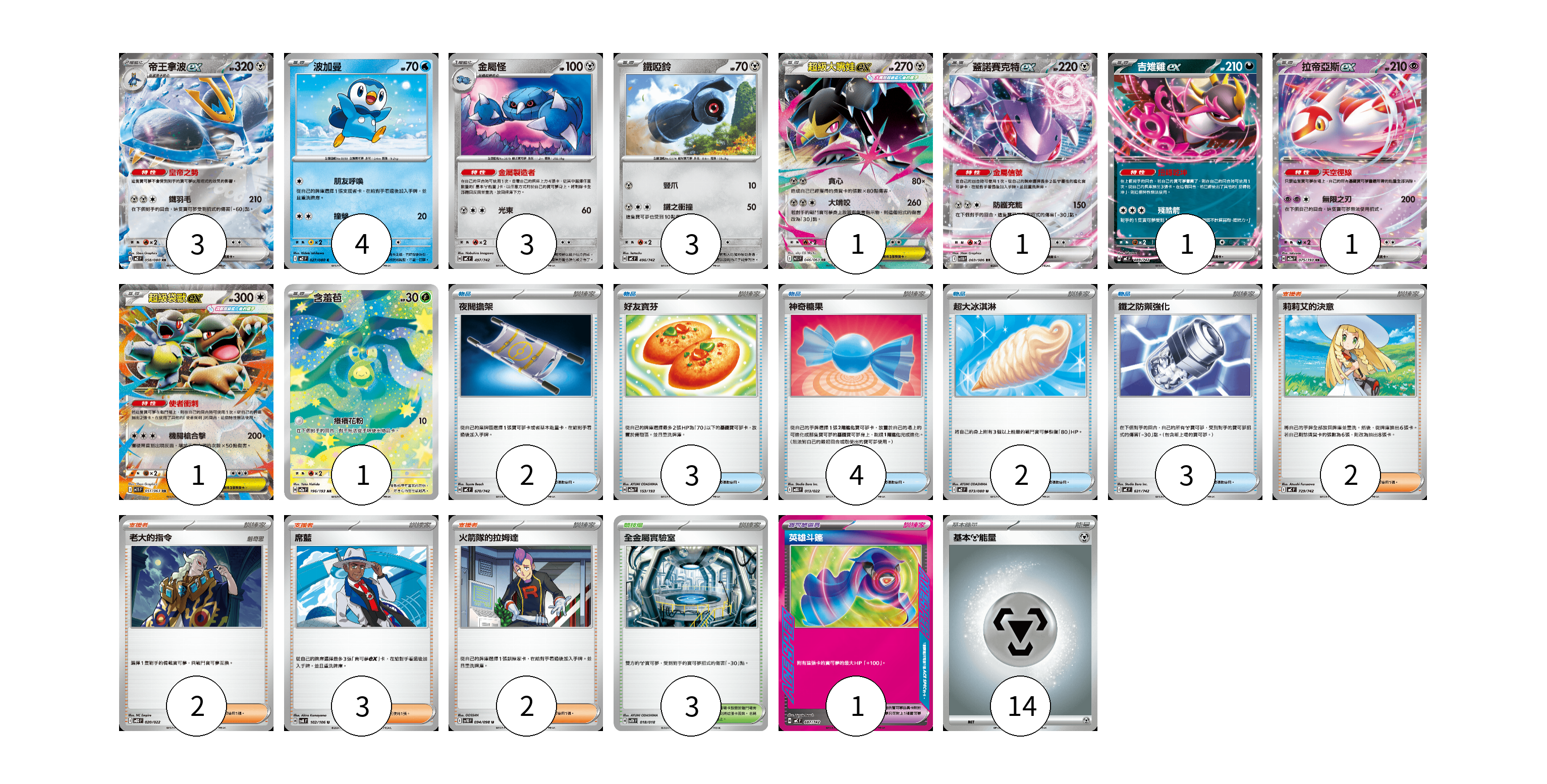 牌組構築方案 以此牌組為基礎新構築牌組 顯示卡面 顯示列表 寶可夢卡(19) 3 4 3 3 1 1 1 1 1 1 寶可夢道具(1) 1 物品卡(14) 2 3 4 2 3 支援者卡(9) 2 2 3 2 競技場卡(3) 3 能量卡(14) 14 寶可夢卡(19) 卡牌名稱 張數 卡牌名稱 張數 帝王拿波ex M2 058/080 03 波加曼 M2 027/080 04 金屬怪 MC 497/742 03 鐵啞鈴 MC 496/742 03 超級大嘴娃ex M1L 046/063 01 蓋諾賽克特ex SV11B 069/086 01 吉雉雞ex MC 489/742 01 拉帝亞斯ex M2a 075/193 01 超級袋獸ex M1S 051/063 01 含羞苞 M2a 196/193 01 寶可夢道具(1) 卡牌名稱 張數 卡牌名稱 張數 英雄斗篷 MC 687/742 01 物品卡(14) 卡牌名稱 張數 卡牌名稱 張數 夜間擔架 MC 670/742 02 好友寶芬 M2a 153/193 03 神奇糖果 MBG 013/022 04 超大冰淇淋 M2 073/080 02 鐵之防禦強化 MC 631/742 03 支援者卡(9) 卡牌名稱 張數 卡牌名稱 張數 莉莉艾的決意 MC 729/742 02 老大的指令 MBD 020/022 02 席藍 SV8 102/106 03 火箭隊的拉姆達 SV10 094/098 02 競技場卡(3) 卡牌名稱 張數 卡牌名稱 張數 全金屬實驗室 SVTH 018/018 03 能量卡(14) 卡牌名稱 張數 卡牌名稱 張數 基本【鋼】能量 MC MET 14 以此牌組為基礎新構築牌組 牌組編碼 MxUmkt-drLkdU-oVziGh copy 列印牌組單 牌組編碼已複製 分享至SNS