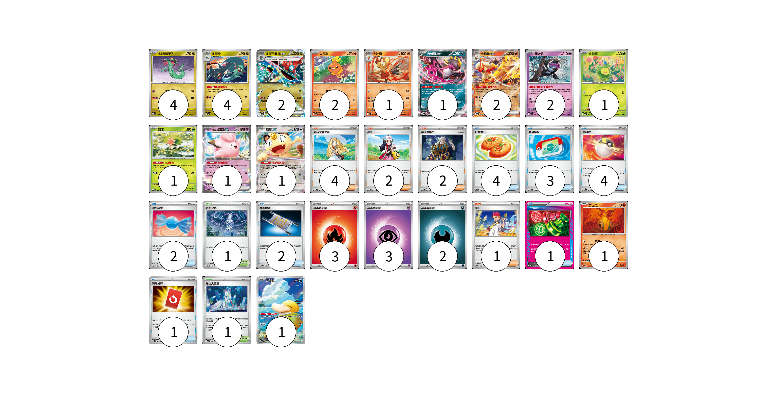 牌組構築方案 以此牌組為基礎新構築牌組 顯示卡面 顯示列表 寶可夢卡(24) 4 4 2 2 1 1 2 2 1 1 1 1 1 1 物品卡(17) 4 3 4 2 2 1 1 支援者卡(9) 4 2 2 1 競技場卡(2) 1 1 能量卡(8) 3 3 2 寶可夢卡(24) 卡牌名稱 張數 卡牌名稱 張數 多龍梅西亞 MC 546/742 04 多龍奇 MC 547/742 04 多龍巴魯托ex MC 548/742 02 火稚雞 SV10 018/098 02 力壯雞 SV10 019/098 01 吉雉雞ex SV8a 104/187 01 火焰雞ex SVM 016/175 02 願增猿 MC 358/742 02 含羞苞 M2a 011/193 01 謝米 M2a 012/193 01 <莉莉艾的>皮皮ex MC 287/742 01 喵喵ex M3 061/080 01 古玉魚 SV5a 018/066 01 可達鴨 M2a 199/193 01 物品卡(17) 卡牌名稱 張數 卡牌名稱 張數 好友寶芬 MC 648/742 04 寶可平板 M3 070/080 03 高級球 MC 651/742 04 神奇糖果 MC 655/742 02 夜間擔架 MC 670/742 02 不公印章 MC 633/742 01 特殊紅牌 M4 072/083 01 支援者卡(9) 卡牌名稱 張數 卡牌名稱 張數 莉莉艾的決意 MC 729/742 04 小光 M2 077/080 02 老大的指令 MBD 020/022 02 赤松 MC 696/742 01 競技場卡(2) 卡牌名稱 張數 卡牌名稱 張數 阻礙之塔 SV8a 181/187 01 零之大空洞 M2a 184/193 01 能量卡(8) 卡牌名稱 張數 卡牌名稱 張數 基本【火】能量 MC FIR 03 基本【超】能量 MC PSY 03 基本【惡】能量 MC DAR 02 以此牌組為基礎新構築牌組 牌組編碼 MyJhQd-KrwHsx-EvSGnV copy 列印牌組單 牌組編碼已複製 分享至SNS