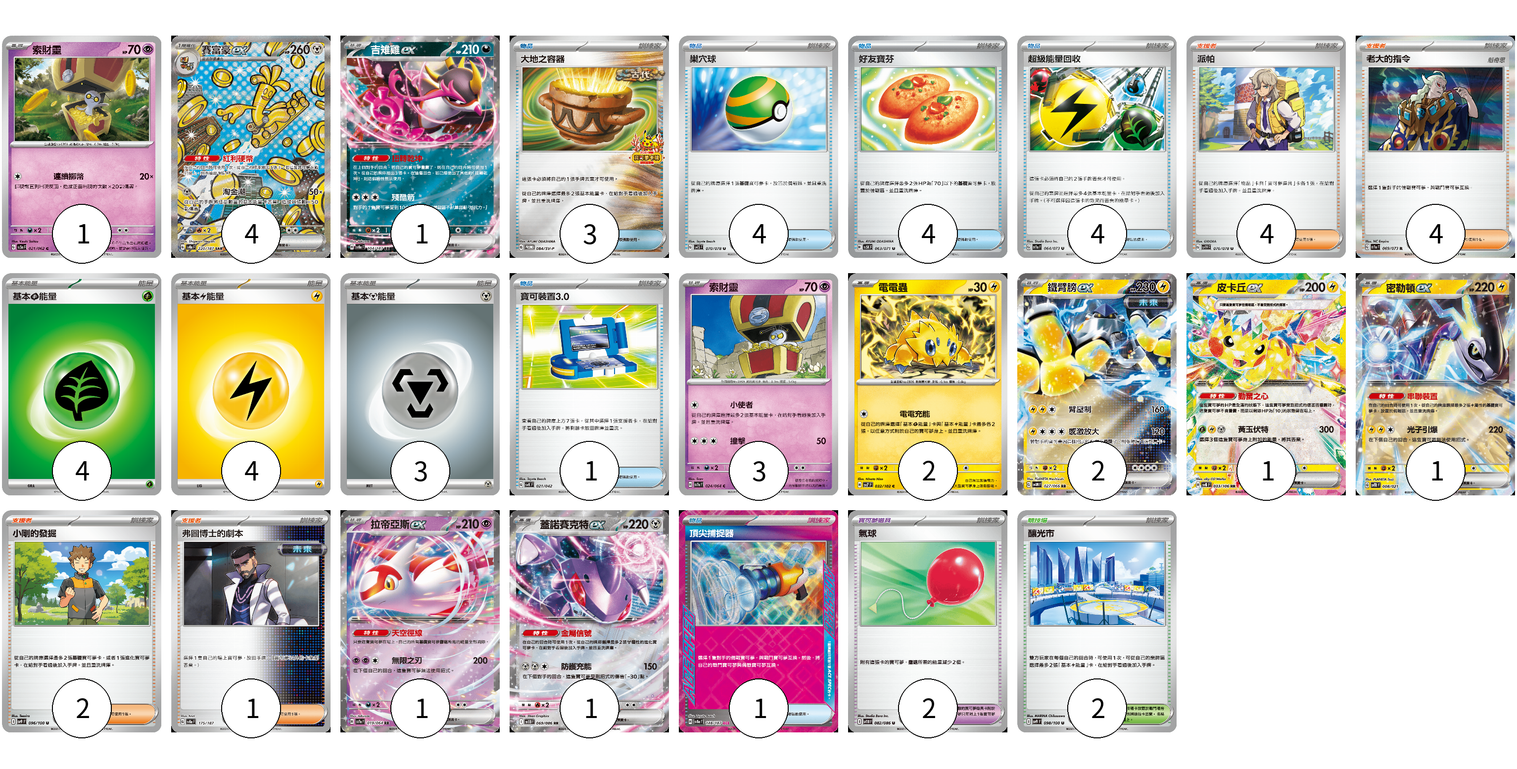牌組構築方案 以此牌組為基礎新構築牌組 顯示卡面 顯示列表 寶可夢卡(17) 1 4 1 3 2 2 1 1 1 1 寶可夢道具(2) 2 物品卡(17) 3 4 4 4 1 1 支援者卡(11) 4 4 2 1 競技場卡(2) 2 能量卡(11) 4 4 3 寶可夢卡(17) 卡牌名稱 張數 卡牌名稱 張數 索財靈 SV3a 021/062 01 賽富豪ex SV8a 220/187 04 吉雉雞ex SV8a 104/187 01 索財靈 SV7a 024/064 03 電電蟲 SV7 032/102 02 鐵臂膀ex SV4M 027/066 02 皮卡丘ex SV8 033/106 01 密勒頓ex SVTR 008/021 01 拉帝亞斯ex SV7a 019/064 01 蓋諾賽克特ex SV11B 069/086 01 寶可夢道具(2) 卡牌名稱 張數 卡牌名稱 張數 氣球 SV11B 082/086 02 物品卡(17) 卡牌名稱 張數 卡牌名稱 張數 大地之容器 SV-P 084/SV-P 03 巢穴球 SV1S 070/078 04 好友寶芬 SV5K 063/071 04 超級能量回收 SV1a 064/073 04 寶可裝置3.0 SVK 021/042 01 頂尖捕捉器 SV8a 148/187 01 支援者卡(11) 卡牌名稱 張數 卡牌名稱 張數 派帕 SV1V 076/078 04 老大的指令 SV1a 069/073 04 小剛的發掘 SV9 096/100 02 弗圖博士的劇本 SV8a 175/187 01 競技場卡(2) 卡牌名稱 張數 卡牌名稱 張數 釀光市 SV9 098/100 02 能量卡(11) 卡牌名稱 張數 卡牌名稱 張數 基本草能量 sv-p GRA 04 基本雷能量 sv-p LIG 04 基本鋼能量 sv-p MET 03 以此牌組為基礎新構築牌組 牌組編碼 NAmyVN-dtaHFu-ldGCNf copy 列印牌組單 牌組編碼已複製 分享至SNS