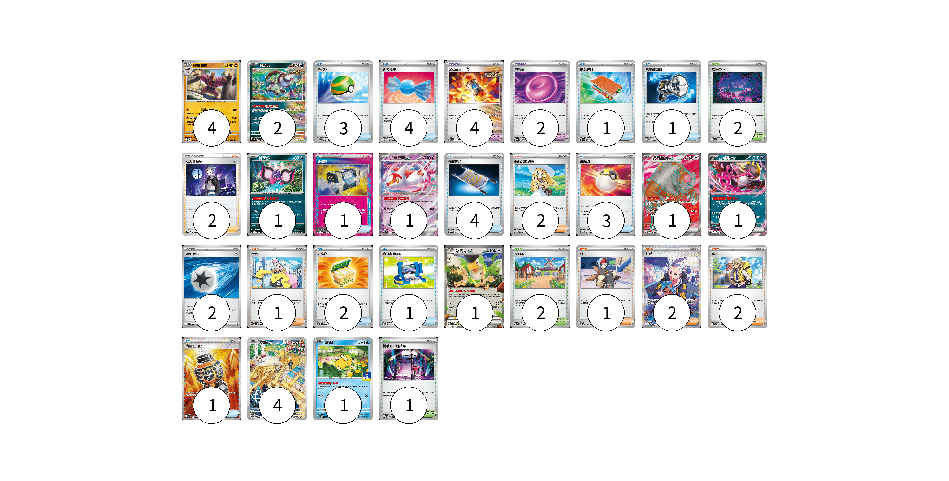 牌組構築方案 以此牌組為基礎新構築牌組 顯示卡面 顯示列表 寶可夢卡(16) 4 2 1 1 1 1 1 4 1 寶可夢道具(6) 4 2 物品卡(21) 3 4 1 1 1 4 3 2 1 1 支援者卡(10) 2 2 1 1 2 2 競技場卡(5) 2 2 1 能量卡(2) 2 寶可夢卡(16) 卡牌名稱 張數 卡牌名稱 張數 修建老匠 SV6 061/101 04 猛惡菇 SV4K 053/066 02 桃歹郎 SV8 075/106 01 拉帝亞斯ex SV7a 019/064 01 月月熊 赫月 ex SV5a 084/066 01 吉雉雞ex SVOD 004/020 01 怒鸚哥ex SVK 006/042 01 搬運小匠 SV6 109/101 04 可達鴨 SV-P 220/SV-P 01 寶可夢道具(6) 卡牌名稱 張數 卡牌名稱 張數 驅勁能量 古代 SV5K 065/071 04 鎖鏈糬 SV6a 057/064 02 物品卡(21) 卡牌名稱 張數 卡牌名稱 張數 巢穴球 SVTG 012/019 03 神奇糖果 SVTG 014/019 04 朋友手冊 SV1S 069/078 01 反擊捕捉器 SVTS 009/022 01 秘密箱 SV6 092/101 01 夜間擔架 SV6a 056/064 04 高級球 SVQP 015/023 03 訂購盒 SV5K 061/071 02 寶可裝置3.0 SVAL 015/021 01 力量蛋白飲 M1L 081/063 01 支援者卡(10) 卡牌名稱 張數 卡牌名稱 張數 老大的指令(赤日) SVB 024/028 02 莉莉艾的決意 M1L 062/063 02 奇樹 SVOD 016/020 01 牡丹 SV4a 182/190 01 杜若 SV7a 090/064 02 派帕 SVTL 020/021 02 競技場卡(5) 卡牌名稱 張數 卡牌名稱 張數 危險密林 SV5K 070/071 02 深缽鎮 SV1a 070/073 02 對戰圓形競技場 M2 079/080 01 能量卡(2) 卡牌名稱 張數 卡牌名稱 張數 噴射能量 SVK 040/042 02 以此牌組為基礎新構築牌組 牌組編碼 NBGMJx-RlVmRI-kKEFiG copy 列印牌組單 牌組編碼已複製 分享至SNS