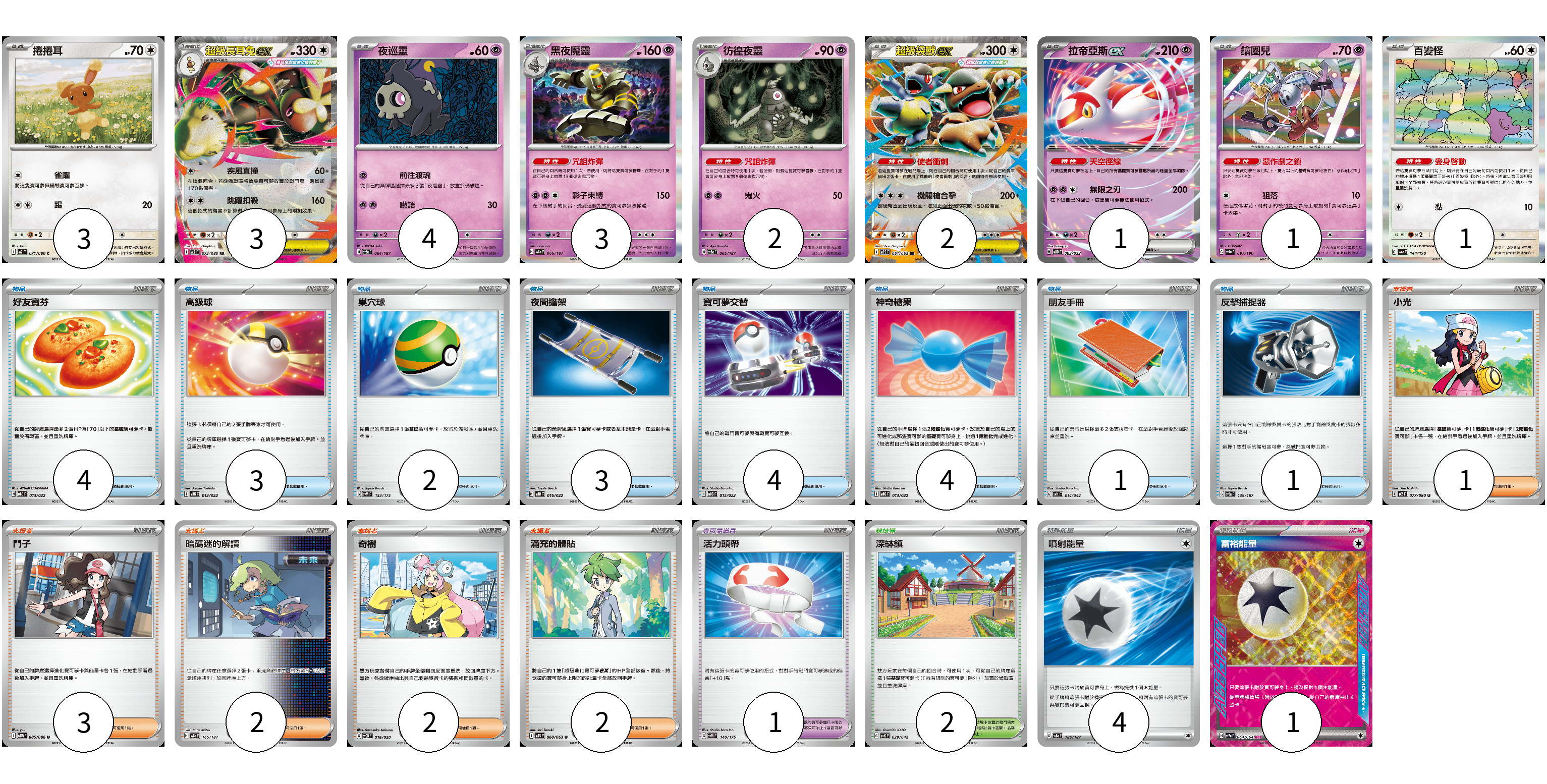 牌組構築方案 以此牌組為基礎新構築牌組 顯示卡面 顯示列表 寶可夢卡(20) 3 3 4 3 2 2 1 1 1 寶可夢道具(1) 1 物品卡(22) 4 3 2 3 4 4 1 1 支援者卡(10) 1 3 2 2 2 競技場卡(2) 2 能量卡(5) 4 1 寶可夢卡(20) 卡牌名稱 張數 卡牌名稱 張數 捲捲耳 M2 071/080 03 超級長耳兔ex M2 072/080 03 夜巡靈 SV8a 064/187 04 黑夜魔靈 SV8a 066/187 03 彷徨夜靈 SV8a 065/187 02 超級袋獸ex M1S 051/063 02 拉帝亞斯ex MBD 003/022 01 鑰圈兒 SV4a 087/190 01 百變怪 SV4a 144/190 01 寶可夢道具(1) 卡牌名稱 張數 卡牌名稱 張數 活力頭帶 SVM 140/175 01 物品卡(22) 卡牌名稱 張數 卡牌名稱 張數 好友寶芬 MBD 013/022 04 高級球 MBG 012/022 03 巢穴球 SVM 133/175 02 夜間擔架 MBD 016/022 03 寶可夢交替 MBG 015/022 04 神奇糖果 MBG 013/022 04 朋友手冊 SVK 014/042 01 反擊捕捉器 SV8a 139/187 01 支援者卡(10) 卡牌名稱 張數 卡牌名稱 張數 小光 M2 077/080 01 鬥子 SV11W 085/086 03 暗碼迷的解讀 SV8a 165/187 02 奇樹 SVOD 016/020 02 滿充的體貼 M1S 060/063 02 競技場卡(2) 卡牌名稱 張數 卡牌名稱 張數 深缽鎮 SVK 039/042 02 能量卡(5) 卡牌名稱 張數 卡牌名稱 張數 噴射能量 SV8a 185/187 04 富裕能量 SV7a 064/064 01 以此牌組為基礎新構築牌組 牌組編碼 NBIpUO-vbGBaD-ScLYHj copy 列印牌組單 牌組編碼已複製 分享至SNS