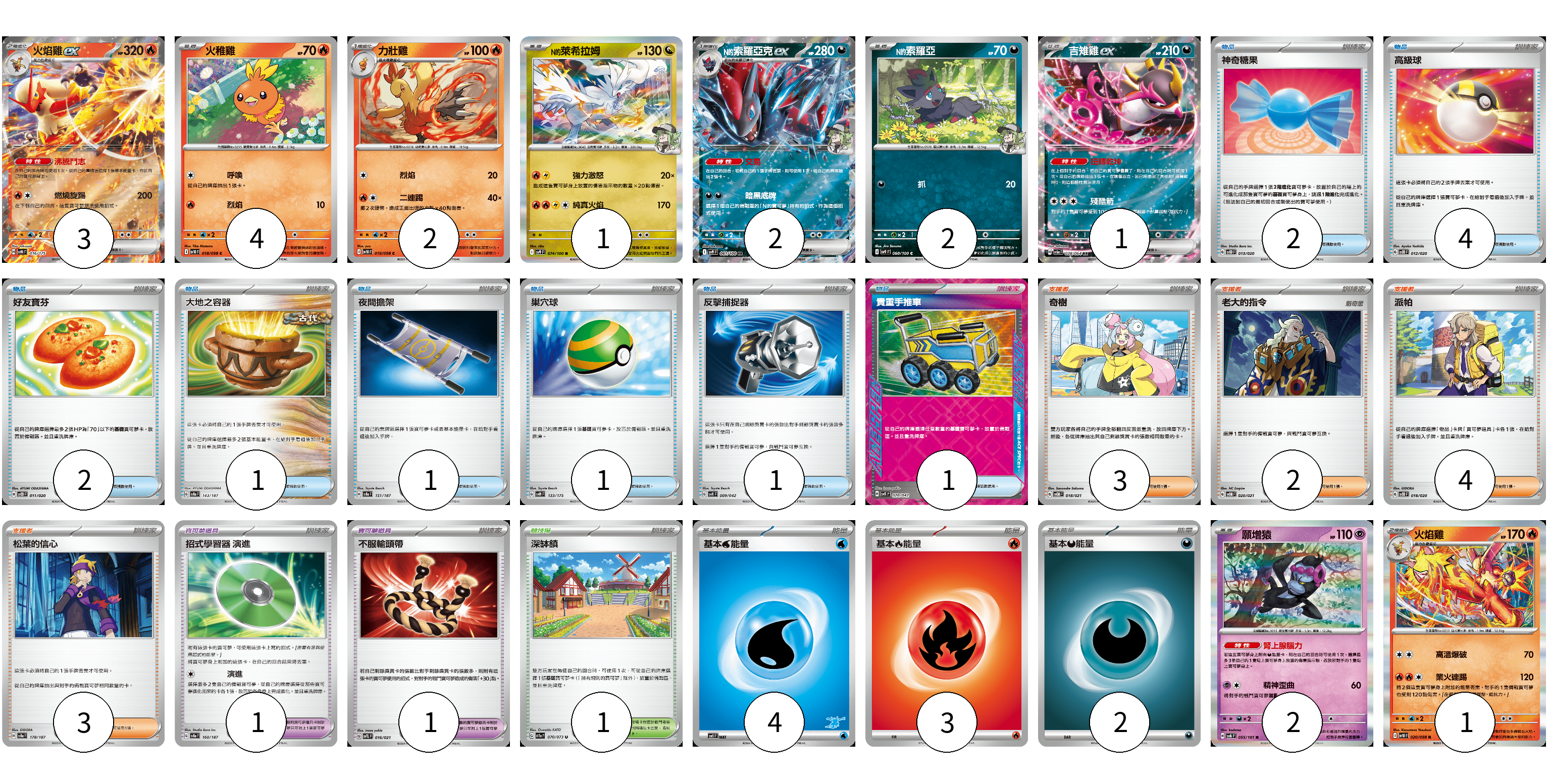 牌組構築方案 以此牌組為基礎新構築牌組 顯示卡面 顯示列表 寶可夢卡(18) 3 4 2 1 2 2 1 2 1 寶可夢道具(2) 1 1 物品卡(13) 2 4 2 1 1 1 1 1 支援者卡(12) 3 2 4 3 競技場卡(1) 1 能量卡(9) 4 3 2 寶可夢卡(18) 卡牌名稱 張數 卡牌名稱 張數 火焰雞ex SVM 016/175 03 火稚雞 SV10 018/098 04 力壯雞 SV10 019/098 02 N的萊希拉姆 SV9 074/100 01 N的索羅亞克ex SV9 061/100 02 N的索羅亞 SV9 060/100 02 吉雉雞ex SV6a 038/064 01 願增猿 SV6 055/101 02 火焰雞 SV10 020/098 01 寶可夢道具(2) 卡牌名稱 張數 卡牌名稱 張數 招式學習器 演進 SV8a 160/187 01 不服輸頭帶 SVTL 016/021 01 物品卡(13) 卡牌名稱 張數 卡牌名稱 張數 神奇糖果 SVOD 013/020 02 高級球 SVOD 012/020 04 好友寶芬 SVOD 011/020 02 大地之容器 SV8a 143/187 01 夜間擔架 SV8a 151/187 01 巢穴球 SVM 133/175 01 反擊捕捉器 SVK 009/042 01 貴重手推車 SVK 020/042 01 支援者卡(12) 卡牌名稱 張數 卡牌名稱 張數 奇樹 SVOM 018/021 03 老大的指令 SVOM 020/021 02 派帕 SVOD 018/020 04 松葉的信心 SV8a 178/187 03 競技場卡(1) 卡牌名稱 張數 卡牌名稱 張數 深缽鎮 SV1a 070/073 01 能量卡(9) 卡牌名稱 張數 卡牌名稱 張數 基本【水】能量 SVI WAT 04 基本【火】能量 SVTL FIR 03 基本【惡】能量 SVF DAR 02 以此牌組為基礎新構築牌組 牌組編碼 NBfNOz-eozXhj-YntjUL copy 列印牌組單 牌組編碼已複製 分享至SNS