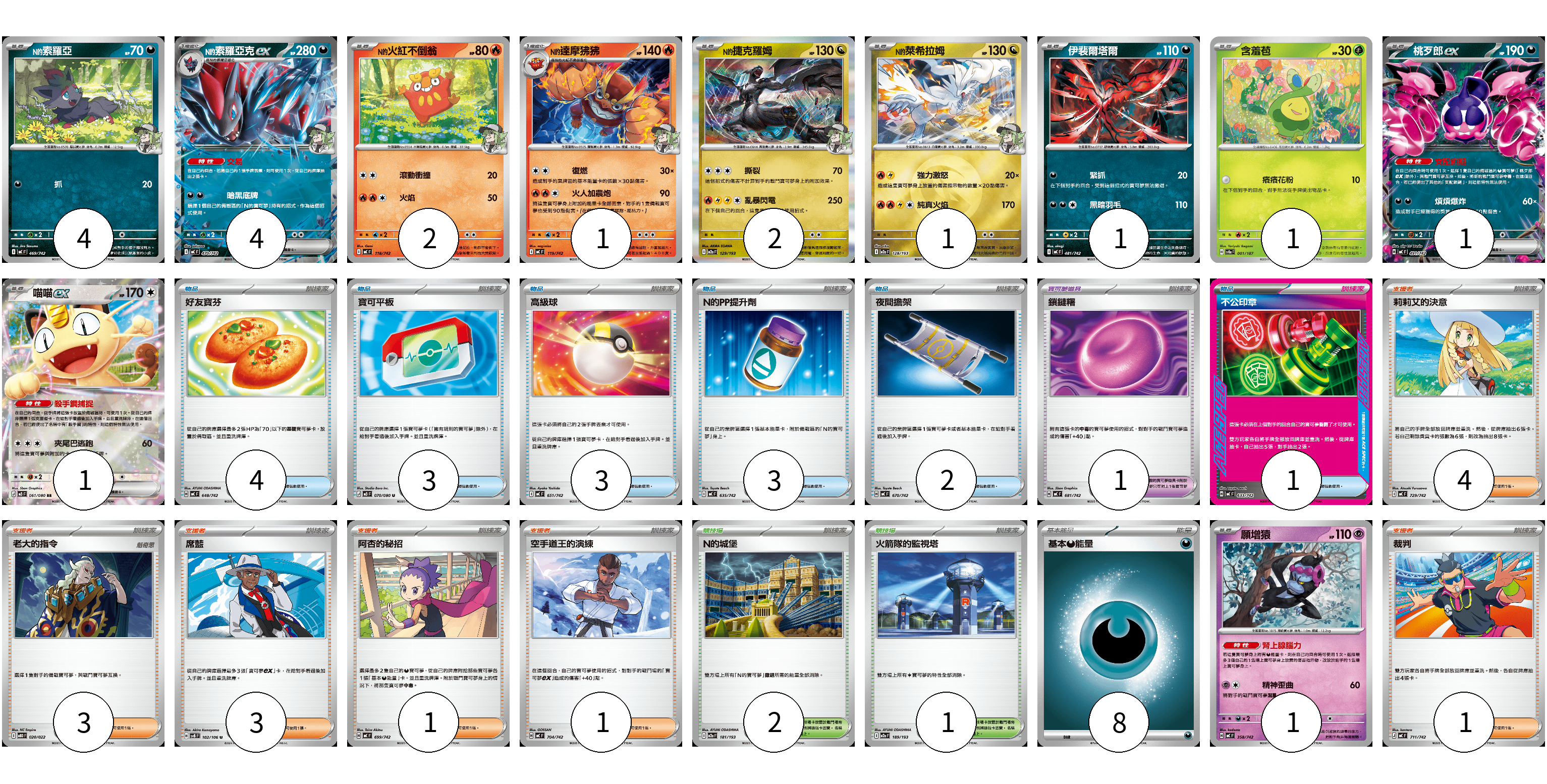 牌組構築方案 以此牌組為基礎新構築牌組 顯示卡面 顯示列表 寶可夢卡(19) 4 4 2 1 2 1 1 1 1 1 1 寶可夢道具(1) 1 物品卡(16) 4 3 3 3 2 1 支援者卡(13) 4 3 3 1 1 1 競技場卡(3) 2 1 能量卡(8) 8 寶可夢卡(19) 卡牌名稱 張數 卡牌名稱 張數 <N的>索羅亞 MC 469/742 04 <N的>索羅亞克ex MC 470/742 04 N的火紅不倒翁 MC 118/742 02 N的達摩狒狒 MC 119/742 01 N的捷克羅姆 M2a 129/193 02 N的萊希拉姆 M2a 128/193 01 伊裴爾塔爾 MC 481/742 01 含羞苞 SV8a 001/187 01 桃歹郎ex MC 491/742 01 喵喵ex M3 061/080 01 願增猿 MC 358/742 01 寶可夢道具(1) 卡牌名稱 張數 卡牌名稱 張數 鎖鏈糬 MC 681/742 01 物品卡(16) 卡牌名稱 張數 卡牌名稱 張數 好友寶芬 MC 648/742 04 寶可平板 M3 070/080 03 高級球 MC 651/742 03 N的PP提升劑 MC 635/742 03 夜間擔架 MC 670/742 02 不公印章 MC 633/742 01 支援者卡(13) 卡牌名稱 張數 卡牌名稱 張數 莉莉艾的決意 MC 729/742 04 老大的指令 MBD 020/022 03 席藍 SV8 102/106 03 阿杏的秘招 MC 699/742 01 空手道王的演練 MC 704/742 01 裁判 MC 711/742 01 競技場卡(3) 卡牌名稱 張數 卡牌名稱 張數 N的城堡 M2a 181/193 02 火箭隊的監視塔 M2a 189/193 01 能量卡(8) 卡牌名稱 張數 卡牌名稱 張數 基本【惡】能量 MC DAR 08 以此牌組為基礎新構築牌組 牌組編碼 NBkqXc-ZrOOUw-ZPKyue copy 列印牌組單 牌組編碼已複製 分享至SNS