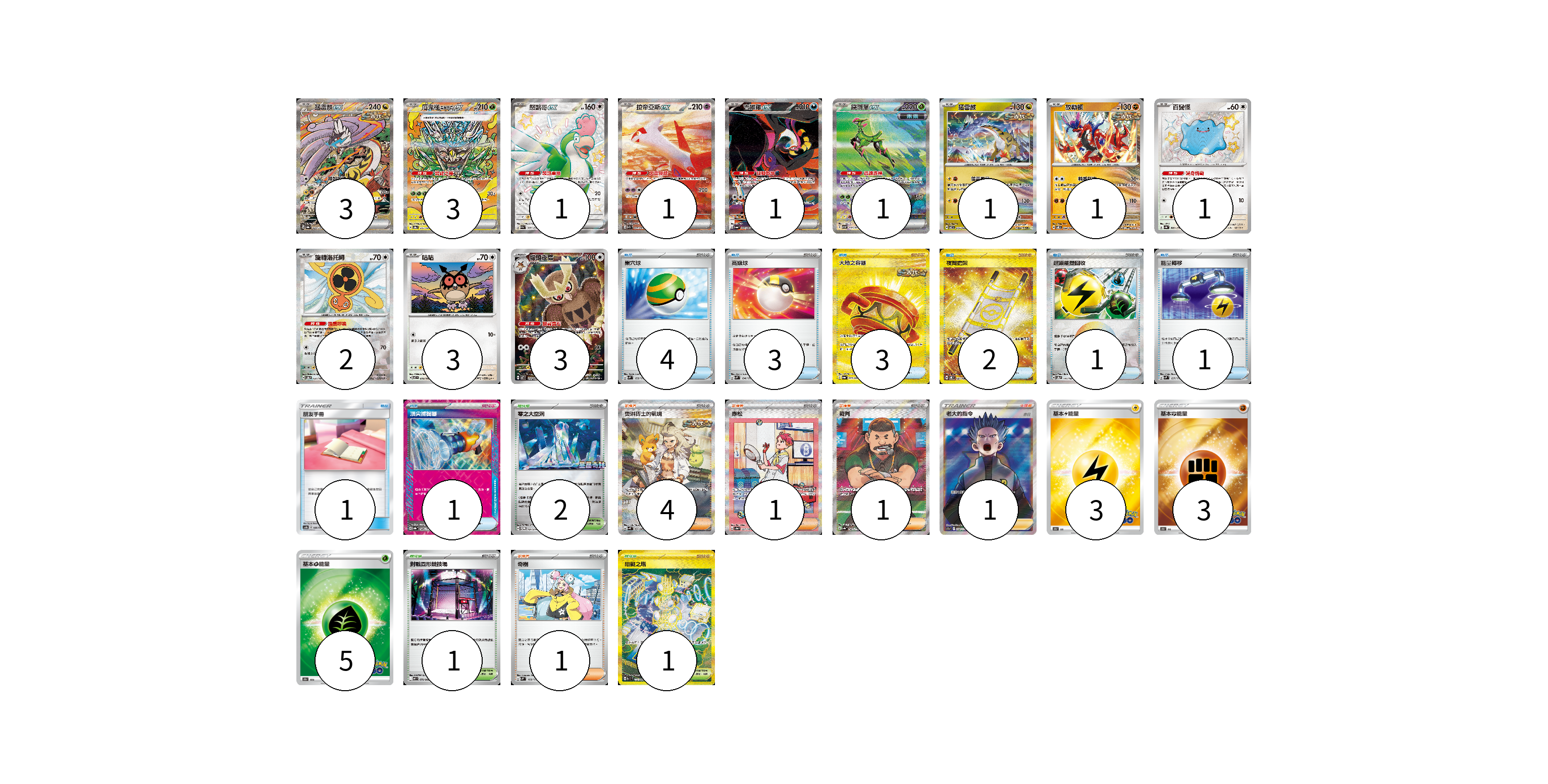 牌組構築方案 以此牌組為基礎新構築牌組 顯示卡面 顯示列表 寶可夢卡(21) 3 3 1 1 1 1 1 1 1 2 3 3 物品卡(16) 4 3 3 2 1 1 1 1 支援者卡(8) 4 1 1 1 1 競技場卡(4) 2 1 1 能量卡(11) 3 3 5 寶可夢卡(21) 卡牌名稱 張數 卡牌名稱 張數 猛雷鼓ex SV8a 222/187 03 厄鬼椪 碧草面具ex SV8a 201/187 03 怒鸚哥ex SV4a 337/190 01 拉帝亞斯ex SV7a 087/064 01 吉雉雞ex SV6a 089/064 01 鐵斑葉ex SV5M 093/071 01 猛雷鼓 SV7 075/102 01 故勒頓 SV8 069/106 01 百變怪 SV4a 309/190 01 旋轉洛托姆 SV8a 131/187 02 咕咕 SV7 076/102 03 貓頭夜鷹 SV7 114/102 03 物品卡(16) 卡牌名稱 張數 卡牌名稱 張數 巢穴球 SVM 133/175 04 高級球 SVM 134/175 03 大地之容器 SV6a 093/064 03 夜間擔架 SV8 137/106 02 超級能量回收 SV8a 141/187 01 能量轉移 SVM 127/175 01 朋友手冊 AS6b 188/194 01 頂尖捕捉器 SV8a 148/187 01 支援者卡(8) 卡牌名稱 張數 卡牌名稱 張數 奧琳博士的氣魄 SV4K 091/066 04 赤松 SV8a 227/187 01 裁判 SV4a 342/190 01 老大的指令(赤日) S12a 250/172 01 奇樹 SVM 160/175 01 競技場卡(4) 卡牌名稱 張數 卡牌名稱 張數 零之大空洞 SV-P 151/SV-P 02 對戰圓形競技場 M2 079/080 01 阻礙之塔 SV10 132/098 01 能量卡(11) 卡牌名稱 張數 卡牌名稱 張數 基本雷能量 S10b LIG 03 基本鬥能量 S10b FIG 03 基本草能量 S10b GRA 05 以此牌組為基礎新構築牌組 牌組編碼 NCgniT-kDwgsW-cOSTfx copy 列印牌組單 牌組編碼已複製 分享至SNS