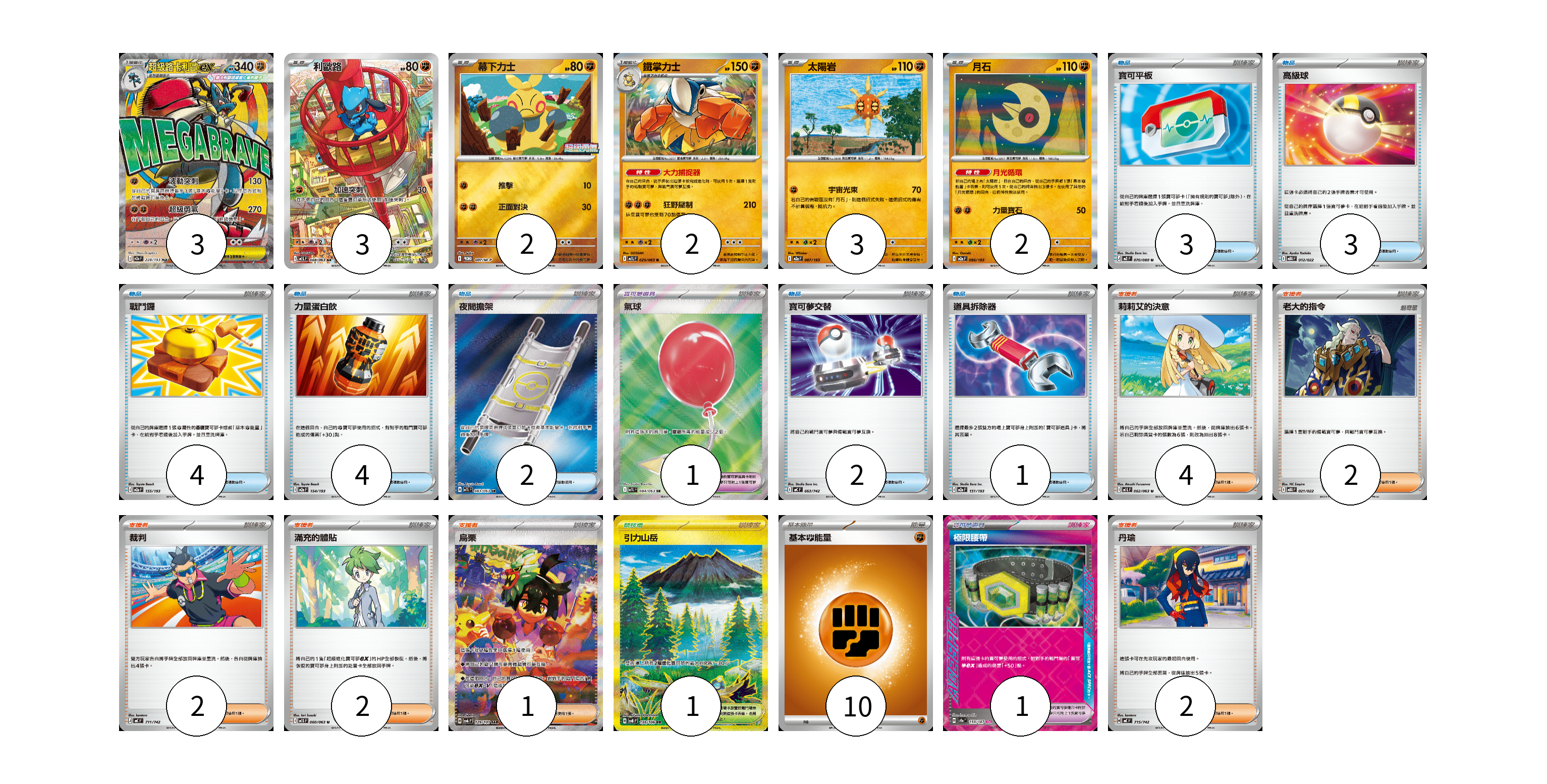 牌組構築方案 以此牌組為基礎新構築牌組 顯示卡面 顯示列表 寶可夢卡(15) 3 3 2 2 3 2 寶可夢道具(2) 1 1 物品卡(19) 3 3 4 4 2 2 1 支援者卡(13) 4 2 2 2 1 2 競技場卡(1) 1 能量卡(10) 10 寶可夢卡(15) 卡牌名稱 張數 卡牌名稱 張數 超級路卡利歐ex M2a 228/193 03 利歐路 M1L 068/063 03 幕下力士 M-P 007/M-P 02 鐵掌力士 M1L 025/063 02 太陽岩 M2a 087/193 03 月石 M2a 086/193 02 寶可夢道具(2) 卡牌名稱 張數 卡牌名稱 張數 氣球 M1L 084/063 01 極限腰帶 SV8a 159/187 01 物品卡(19) 卡牌名稱 張數 卡牌名稱 張數 寶可平板 M3 070/080 03 高級球 MBG 012/022 03 戰鬥鑼 M2a 155/193 04 力量蛋白飲 M2a 154/193 04 夜間擔架 M1L 083/063 02 寶可夢交替 MC 663/742 02 道具拆除器 M2a 151/193 01 支援者卡(13) 卡牌名稱 張數 卡牌名稱 張數 莉莉艾的決意 M1L 062/063 04 老大的指令 MBG 021/022 02 裁判 MC 711/742 02 滿充的體貼 M1S 060/063 02 烏栗 SV6 129/101 01 丹瑜 MC 715/742 02 競技場卡(1) 卡牌名稱 張數 卡牌名稱 張數 引力山岳 SV8 138/106 01 能量卡(10) 卡牌名稱 張數 卡牌名稱 張數 基本【鬥】能量 MC FIG 10 以此牌組為基礎新構築牌組 牌組編碼 NCiVZA-FWYJFR-ZIZuaN copy 列印牌組單 牌組編碼已複製 分享至SNS