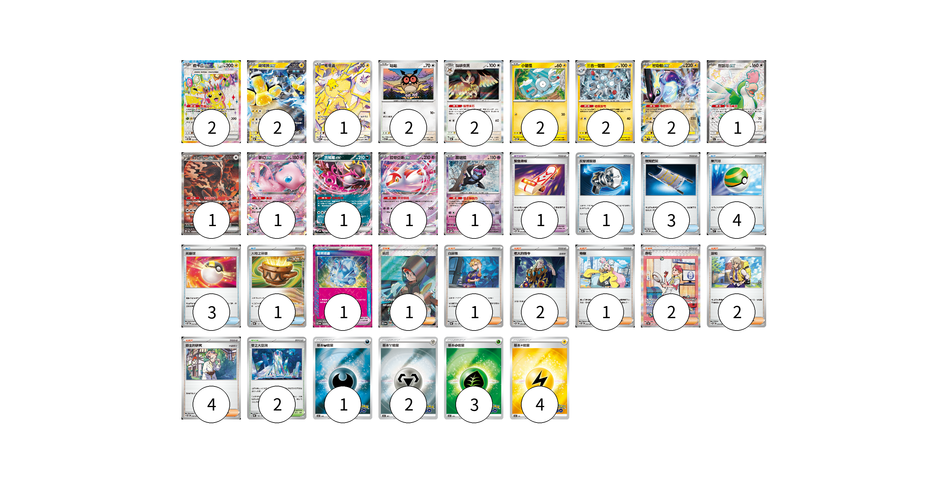 牌組構築方案 以此牌組為基礎新構築牌組 顯示卡面 顯示列表 寶可夢卡(21) 2 2 1 2 2 2 2 2 1 1 1 1 1 1 寶可夢道具(2) 1 1 物品卡(12) 1 3 4 3 1 支援者卡(13) 1 1 2 1 2 2 4 競技場卡(2) 2 能量卡(10) 1 2 3 4 寶可夢卡(21) 卡牌名稱 張數 卡牌名稱 張數 皮卡丘ex SV8 122/106 02 鐵臂膀ex SV8a 054/187 02 電電蟲 SV7 108/102 01 咕咕 SV7 076/102 02 貓頭夜鷹 SV8a 128/187 02 小磁怪 SV8 034/106 02 三合一磁怪 SV8 035/106 02 密勒頓ex SV1V 037/078 02 怒鸚哥ex SV4a 337/190 01 月月熊 赫月ex SV8a 225/187 01 夢幻ex SV4a 076/190 01 吉雉雞ex SV8a 104/187 01 拉帝亞斯ex SV7a 019/064 01 願增猿 SV8a 075/187 01 寶可夢道具(2) 卡牌名稱 張數 卡牌名稱 張數 緊急滑板 SVOD 015/020 01 璀璨結晶 SV8a 152/187 01 物品卡(12) 卡牌名稱 張數 卡牌名稱 張數 反擊捕捉器 SV8a 139/187 01 夜間擔架 SVOM 016/021 03 巢穴球 SVM 133/175 04 高級球 SVOD 012/020 03 大地之容器 SV8a 143/187 01 支援者卡(13) 卡牌名稱 張數 卡牌名稱 張數 仙后 SV6a 085/064 01 白蕾雅 SV8a 176/187 01 老大的指令 SVOD 019/020 02 奇樹 SVOD 016/020 01 赤松 SV8a 227/187 02 派帕 SVOD 018/020 02 博士的研究 SVOM 019/021 04 競技場卡(2) 卡牌名稱 張數 卡牌名稱 張數 零之大空洞 SV8a 182/187 02 能量卡(10) 卡牌名稱 張數 卡牌名稱 張數 基本惡能量 S10b DAR 01 基本鋼能量 S10b MET 02 基本草能量 S10b GRA 03 基本雷能量 S10b LIG 04 以此牌組為基礎新構築牌組 牌組編碼 NFLNRd-iDIZsy-ESuBmg copy 列印牌組單 牌組編碼已複製 分享至SNS