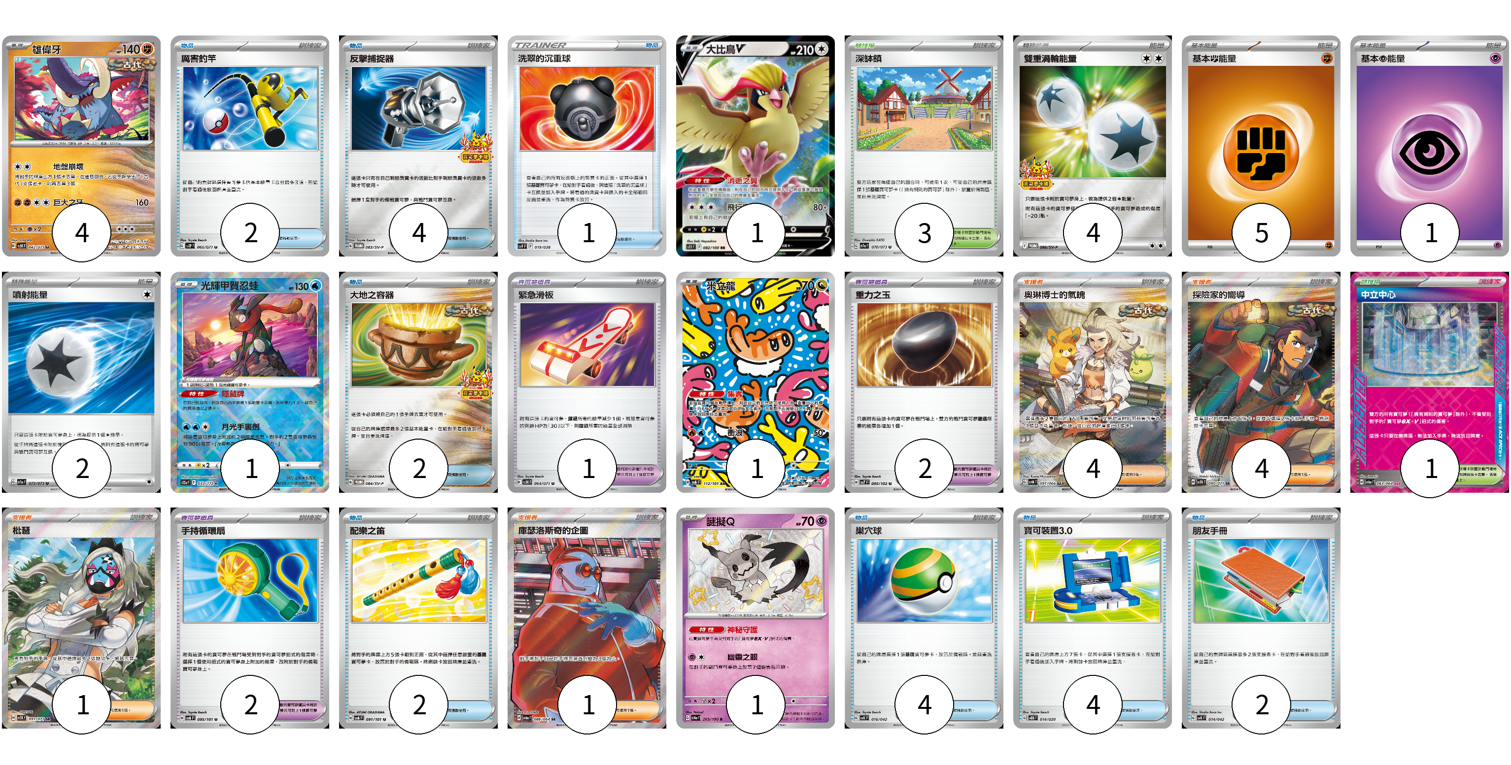 牌組構築方案 以此牌組為基礎新構築牌組 顯示卡面 顯示列表 寶可夢卡(8) 4 1 1 1 1 寶可夢道具(5) 1 2 2 物品卡(21) 2 4 1 2 2 4 4 2 支援者卡(10) 4 4 1 1 競技場卡(4) 3 1 能量卡(12) 4 5 1 2 寶可夢卡(8) 卡牌名稱 張數 卡牌名稱 張數 雄偉牙 SV5K 042/071 04 大比鳥V S11 082/100 01 光輝甲賀忍蛙 S12a 033/172 01 米立龍 SV6 112/101 01 謎擬Q SV4a 265/190 01 寶可夢道具(5) 卡牌名稱 張數 卡牌名稱 張數 緊急滑板 SV5K 064/071 01 重力之玉 SV7 095/102 02 手持循環扇 SV6 095/101 02 物品卡(21) 卡牌名稱 張數 卡牌名稱 張數 厲害釣竿 SV2P 066/071 02 反擊捕捉器 SV-P 083/SV-P 04 洗翠的沉重球 SVF 019/038 01 大地之容器 SV-P 084/SV-P 02 配樂之笛 SV6 091/101 02 巢穴球 SVK 016/042 04 寶可裝置3.0 SVEM 014/020 04 朋友手冊 SVK 014/042 02 支援者卡(10) 卡牌名稱 張數 卡牌名稱 張數 奧琳博士的氣魄 SV4K 091/066 04 探險家的嚮導 SV5K 090/071 04 枇琶 SV5K 091/071 01 庫瑟洛斯奇的企圖 SV6a 086/064 01 競技場卡(4) 卡牌名稱 張數 卡牌名稱 張數 深缽鎮 SV1a 070/073 03 中立中心 SV6a 063/064 01 能量卡(12) 卡牌名稱 張數 卡牌名稱 張數 雙重渦輪能量 SV-P 086/SV-P 04 基本鬥能量 sv-p FIG 05 基本超能量 sv-p PSY 01 噴射能量 SV1a 072/073 02 以此牌組為基礎新構築牌組 牌組編碼 NFvXsP-OlrnLI-WhYYlj copy 列印牌組單 牌組編碼已複製 分享至SNS