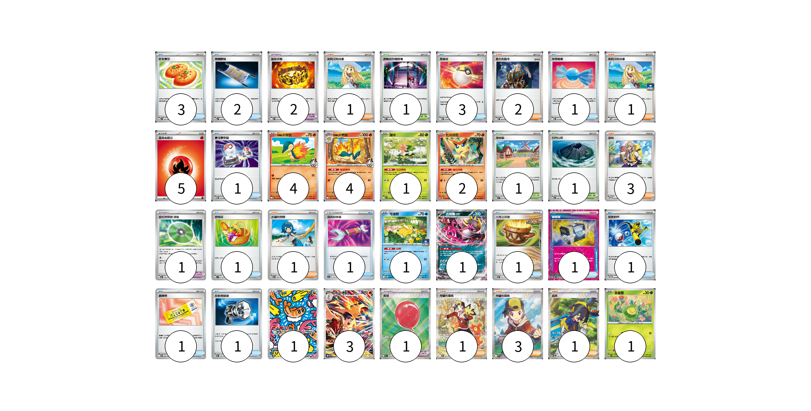 牌組構築方案 以此牌組為基礎新構築牌組 顯示卡面 顯示列表 寶可夢卡(18) 4 4 1 2 1 1 1 3 1 寶可夢道具(4) 2 1 1 物品卡(17) 3 2 3 1 1 1 1 1 1 1 1 1 支援者卡(13) 1 2 1 3 1 1 3 1 競技場卡(3) 1 1 1 能量卡(5) 5 寶可夢卡(18) 卡牌名稱 張數 卡牌名稱 張數 <阿響的>火球鼠 SV9a 015/063 04 <阿響的>火岩鼠 SV9a 016/063 04 謝米 M2a 012/193 01 比克提尼 SV8 012/106 02 可達鴨 SV-P 220/SV-P 01 吉雉雞ex M2a 114/193 01 米立龍 SV6 112/101 01 <阿響的>火爆獸 SV9a 070/063 03 含羞苞 M2a 011/193 01 寶可夢道具(4) 卡牌名稱 張數 卡牌名稱 張數 猛攻手鐲 M2a 166/193 02 招式學習器 演進 SV8a 160/187 01 氣球 M1L 084/063 01 物品卡(17) 卡牌名稱 張數 卡牌名稱 張數 好友寶芬 M2a 153/193 03 夜間擔架 M2a 159/193 02 高級球 MBD 014/022 03 神奇糖果 MBG 013/022 01 寶可夢交替 SVQL 016/022 01 野餐籃 SV1V 071/078 01 道具拆除器 SC1a 138/154 01 大地之容器 SV8a 143/187 01 秘密箱 SV6 092/101 01 厲害釣竿 SVOD 010/020 01 調換票 SV9 090/100 01 反擊捕捉器 SV8a 139/187 01 支援者卡(13) 卡牌名稱 張數 卡牌名稱 張數 莉莉艾的決意 M2a 175/193 01 老大的指令 MBD 020/022 02 莉莉艾的決意 M-P 018/M-P 01 派帕 SVOD 018/020 03 水蓮的照顧 SV8a 168/187 01 阿響的冒險 SV9a 089/063 01 阿響的冒險 SV9a 084/063 03 烏栗 SV6 122/101 01 競技場卡(3) 卡牌名稱 張數 卡牌名稱 張數 對戰圓形競技場 M2 079/080 01 深缽鎮 SVK 039/042 01 引力山岳 M2a 183/193 01 能量卡(5) 卡牌名稱 張數 卡牌名稱 張數 基本【火】能量 M-P FIR 05 以此牌組為基礎新構築牌組 牌組編碼 NGfvLz-ZPsDIc-JfBjHn copy 列印牌組單 牌組編碼已複製 分享至SNS