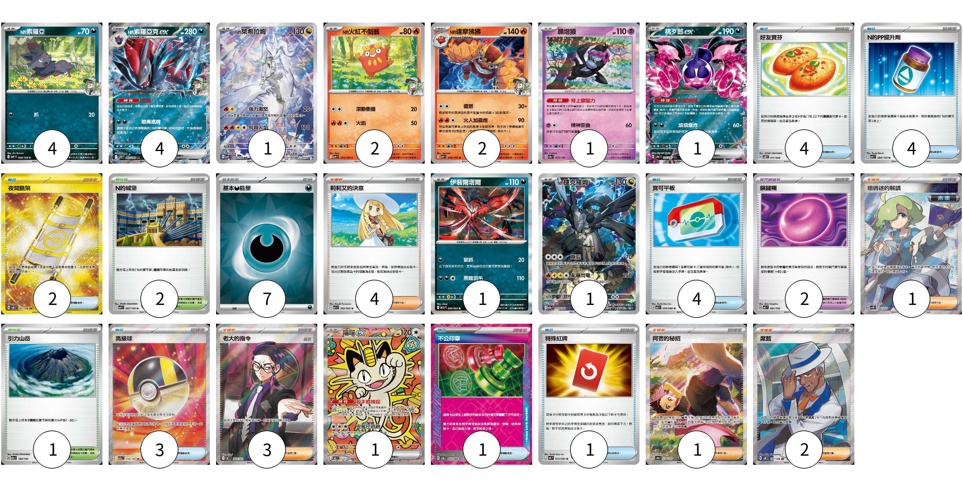 牌組構築方案 以此牌組為基礎新構築牌組 顯示卡面 顯示列表 寶可夢卡(18) 4 4 1 2 2 1 1 1 1 1 寶可夢道具(2) 2 物品卡(19) 4 4 2 4 3 1 1 支援者卡(11) 4 1 3 1 2 競技場卡(3) 2 1 能量卡(7) 7 寶可夢卡(18) 卡牌名稱 張數 卡牌名稱 張數 N的索羅亞 SV9 060/100 04 N的索羅亞克ex SV9 061/100 04 N的萊希拉姆 SV9 109/100 01 N的火紅不倒翁 SV9 015/100 02 N的達摩狒狒 SV9 016/100 02 願增猿 SV8a 075/187 01 桃歹郎ex SV8a 105/187 01 伊裴爾塔爾 M1L 040/063 01 N的捷克羅姆 M2a 210/193 01 喵喵ex M3 114/080 01 寶可夢道具(2) 卡牌名稱 張數 卡牌名稱 張數 鎖鏈糬 MC 681/742 02 物品卡(19) 卡牌名稱 張數 卡牌名稱 張數 好友寶芬 SVOD 011/020 04 N的PP提升劑 SV9 089/100 04 夜間擔架 SV8 137/106 02 寶可平板 M3 070/080 04 高級球 M2a 216/193 03 不公印章 SV5a 053/066 01 特殊紅牌 M4 072/083 01 支援者卡(11) 卡牌名稱 張數 卡牌名稱 張數 莉莉艾的決意 M1L 062/063 04 暗碼迷的解讀 SV5M 090/071 01 老大的指令(烏羽) MC 760/742 03 阿杏的秘招 SV8a 228/187 01 席藍 SV8 127/106 02 競技場卡(3) 卡牌名稱 張數 卡牌名稱 張數 N的城堡 SV9 097/100 02 引力山岳 M2a 183/193 01 能量卡(7) 卡牌名稱 張數 卡牌名稱 張數 基本【惡】能量 SVOM DAR 07 以此牌組為基礎新構築牌組 牌組編碼 NHullU-rhZTWf-leLqiZ copy 列印牌組單 牌組編碼已複製 分享至SNS
