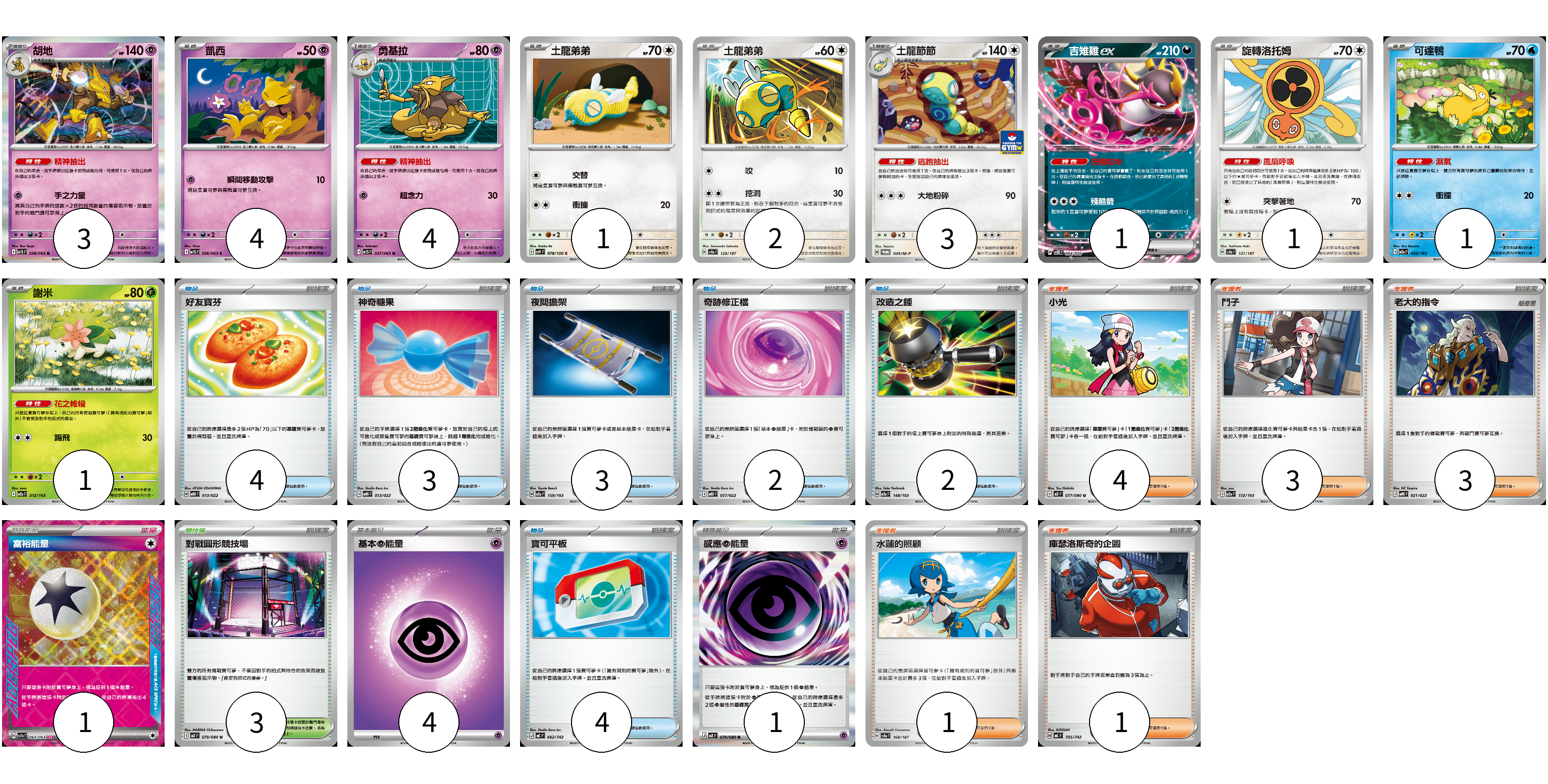 牌組構築方案 以此牌組為基礎新構築牌組 顯示卡面 顯示列表 寶可夢卡(21) 3 4 4 1 2 3 1 1 1 1 物品卡(18) 4 3 3 2 2 4 支援者卡(12) 4 3 3 1 1 競技場卡(3) 3 能量卡(6) 1 4 1 寶可夢卡(21) 卡牌名稱 張數 卡牌名稱 張數 胡地 M1S 038/063 03 凱西 M1S 036/063 04 勇基拉 M1S 037/063 04 土龍弟弟 SV9 078/100 01 土龍弟弟 SV8a 129/187 02 土龍節節 M-P 045/M-P 03 吉雉雞ex SVOD 004/020 01 旋轉洛托姆 SV8a 131/187 01 可達鴨 M2a 032/193 01 謝米 M2a 012/193 01 物品卡(18) 卡牌名稱 張數 卡牌名稱 張數 好友寶芬 MBD 013/022 04 神奇糖果 MBG 013/022 03 夜間擔架 M2a 159/193 03 奇跡修正檔 MBD 017/022 02 改造之錘 M2a 148/193 02 寶可平板 MC 662/742 04 支援者卡(12) 卡牌名稱 張數 卡牌名稱 張數 小光 M2 077/080 04 鬥子 M2a 172/193 03 老大的指令 MBG 021/022 03 水蓮的照顧 SV8a 168/187 01 庫瑟洛斯奇的企圖 MC 705/742 01 競技場卡(3) 卡牌名稱 張數 卡牌名稱 張數 對戰圓形競技場 M2 079/080 03 能量卡(6) 卡牌名稱 張數 卡牌名稱 張數 富裕能量 SV7a 064/064 01 基本【超】能量 MBD PSY 04 感應【超】能量 M3 079/080 01 以此牌組為基礎新構築牌組 牌組編碼 NJGuJF-CWrMht-ihvRoL copy 列印牌組單 牌組編碼已複製 分享至SNS