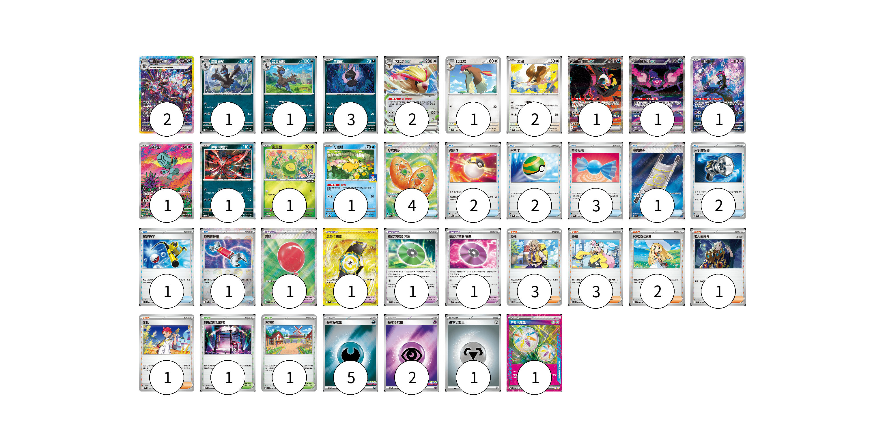 牌組構築方案 以此牌組為基礎新構築牌組 顯示卡面 顯示列表 寶可夢卡(19) 2 1 1 3 2 1 2 1 1 1 1 1 1 1 寶可夢道具(4) 1 1 1 1 物品卡(16) 4 2 2 3 1 2 1 1 支援者卡(10) 3 3 2 1 1 競技場卡(2) 1 1 能量卡(9) 5 2 1 1 寶可夢卡(19) 卡牌名稱 張數 卡牌名稱 張數 三首惡龍ex SV8 133/106 02 雙首暴龍 SV8 071/106 01 雙首暴龍 SV1a 058/073 01 單首龍 SV8 070/106 03 大比鳥ex SVK 005/042 02 比比鳥 SV4a 138/190 01 波波 SVK 003/042 02 吉雉雞ex SV6a 089/064 01 桃歹郎ex SV6a 090/064 01 願增猿 SV6 107/101 01 小灰怪 SV11B 126/086 01 伊裴爾塔爾 M1L 040/063 01 含羞苞 M-P 037/M-P 01 可達鴨 SV-P 220/SV-P 01 寶可夢道具(4) 卡牌名稱 張數 卡牌名稱 張數 氣球 M1L 084/063 01 反擊增幅器 SV7a 093/064 01 招式學習器 演進 SVK 025/042 01 招式學習器 衰退 SVK 026/042 01 物品卡(16) 卡牌名稱 張數 卡牌名稱 張數 好友寶芬 M1S 081/063 04 高級球 MBD 014/022 02 巢穴球 SVM 133/175 02 神奇糖果 SVM 135/175 03 夜間擔架 M1L 083/063 01 反擊捕捉器 SV8a 139/187 02 厲害釣竿 SVOM 011/021 01 道具拆除器 SV11W 080/086 01 支援者卡(10) 卡牌名稱 張數 卡牌名稱 張數 派帕 SVOD 018/020 03 奇樹 SVOD 016/020 03 莉莉艾的決意 M1L 062/063 02 老大的指令 MBG 021/022 01 赤松 SV8a 163/187 01 競技場卡(2) 卡牌名稱 張數 卡牌名稱 張數 對戰圓形競技場 M2 079/080 01 深缽鎮 SVF 036/038 01 能量卡(9) 卡牌名稱 張數 卡牌名稱 張數 基本【惡】能量 M-P 034/M-P 05 基本【超】能量 M-P 033/M-P 02 基本【鋼】能量 M-P MET 01 新衝天能量 SV5K 071/071 01 以此牌組為基礎新構築牌組 牌組編碼 NJOqXR-jMtJYg-iXURpg copy 列印牌組單 牌組編碼已複製 分享至SNS