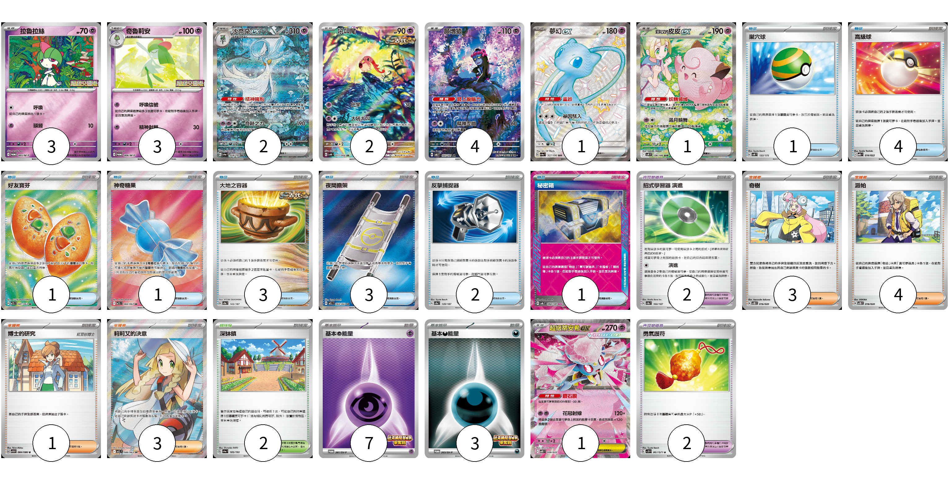 牌組構築方案 以此牌組為基礎新構築牌組 顯示卡面 顯示列表 寶可夢卡(17) 3 3 2 2 4 1 1 1 寶可夢道具(4) 2 2 物品卡(16) 1 4 1 1 3 3 2 1 支援者卡(11) 3 4 1 3 競技場卡(2) 2 能量卡(10) 7 3 寶可夢卡(17) 卡牌名稱 張數 卡牌名稱 張數 拉魯拉絲 M-P 005/M-P 03 奇魯莉安 M-P 006/M-P 03 沙奈朵ex SV4a 348/190 02 吼叫尾 SV4K 071/066 02 願增猿 SV6 107/101 04 夢幻ex SV4a 327/190 01 莉莉艾的皮皮ex SV9 126/100 01 超級蒂安希ex MBD 006/022 01 寶可夢道具(4) 卡牌名稱 張數 卡牌名稱 張數 招式學習器 演進 SV8a 160/187 02 勇氣護符 SV2D 067/071 02 物品卡(16) 卡牌名稱 張數 卡牌名稱 張數 巢穴球 SVM 133/175 01 高級球 MBD 014/022 04 好友寶芬 M1S 081/063 01 神奇糖果 M1S 082/063 01 大地之容器 SV8a 143/187 03 夜間擔架 M1L 083/063 03 反擊捕捉器 SV8a 139/187 02 秘密箱 SV6 092/101 01 支援者卡(11) 卡牌名稱 張數 卡牌名稱 張數 奇樹 SVOD 016/020 03 派帕 SVOD 018/020 04 博士的研究 SV11B 084/086 01 莉莉艾的決意 M1L 086/063 03 競技場卡(2) 卡牌名稱 張數 卡牌名稱 張數 深缽鎮 SV4a 185/190 02 能量卡(10) 卡牌名稱 張數 卡牌名稱 張數 基本【超】能量 SV-P 261/SV-P 07 基本【惡】能量 SV-P 263/SV-P 03 以此牌組為基礎新構築牌組 牌組編碼 NKveOV-KEqXOI-nKQxgj copy 列印牌組單 牌組編碼已複製 分享至SNS