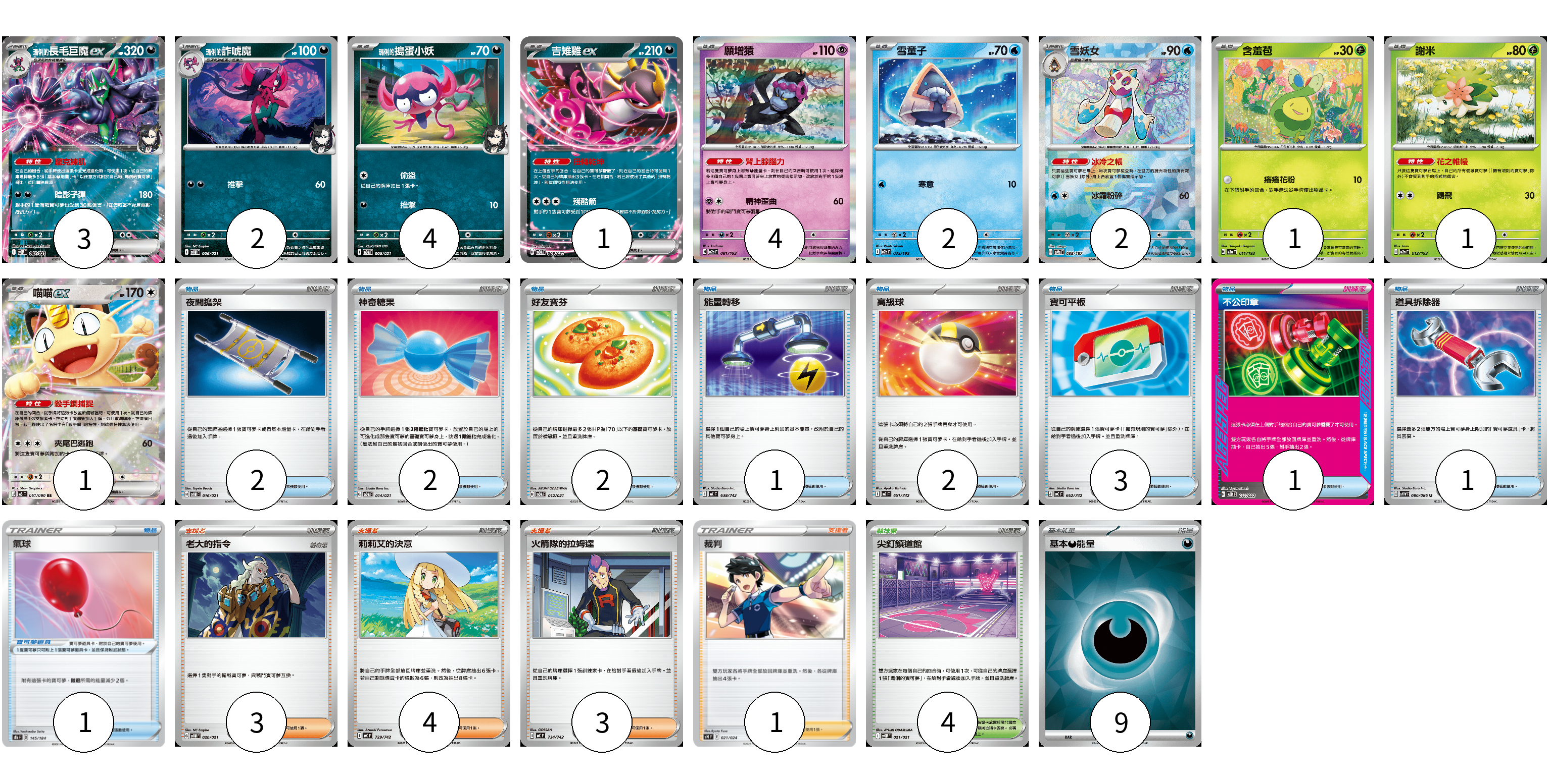 牌組構築方案 以此牌組為基礎新構築牌組 顯示卡面 顯示列表 寶可夢卡(21) 3 2 4 1 4 2 2 1 1 1 寶可夢道具(1) 1 物品卡(14) 2 2 2 1 2 3 1 1 支援者卡(11) 3 4 3 1 競技場卡(4) 4 能量卡(9) 9 寶可夢卡(21) 卡牌名稱 張數 卡牌名稱 張數 <瑪俐的>長毛巨魔ex SVOM 007/021 03 <瑪俐的>詐唬魔 SVOM 006/021 02 <瑪俐的>搗蛋小妖 SVOM 005/021 04 吉雉雞ex SVOM 009/021 01 願增猿 M2a 081/193 04 雪童子 M2a 035/193 02 雪妖女 SV8a 038/187 02 含羞苞 M2a 011/193 01 謝米 M2a 012/193 01 喵喵ex M3 061/080 01 寶可夢道具(1) 卡牌名稱 張數 卡牌名稱 張數 氣球 S8b 145/184 01 物品卡(14) 卡牌名稱 張數 卡牌名稱 張數 夜間擔架 SVOM 016/021 02 神奇糖果 SVOM 014/021 02 好友寶芬 SVOM 012/021 02 能量轉移 MC 638/742 01 高級球 MC 651/742 02 寶可平板 MC 662/742 03 不公印章 MBD 011/022 01 道具拆除器 SV11W 080/086 01 支援者卡(11) 卡牌名稱 張數 卡牌名稱 張數 老大的指令 SVOM 020/021 03 莉莉艾的決意 MC 729/742 04 火箭隊的拉姆達 MC 734/742 03 裁判 SN 021/024 01 競技場卡(4) 卡牌名稱 張數 卡牌名稱 張數 尖釘鎮道館 SVOM 021/021 04 能量卡(9) 卡牌名稱 張數 卡牌名稱 張數 基本【惡】能量 SVOM DAR 09 以此牌組為基礎新構築牌組 牌組編碼 NMvacP-bXbIXd-lyFpER copy 列印牌組單 牌組編碼已複製 分享至SNS