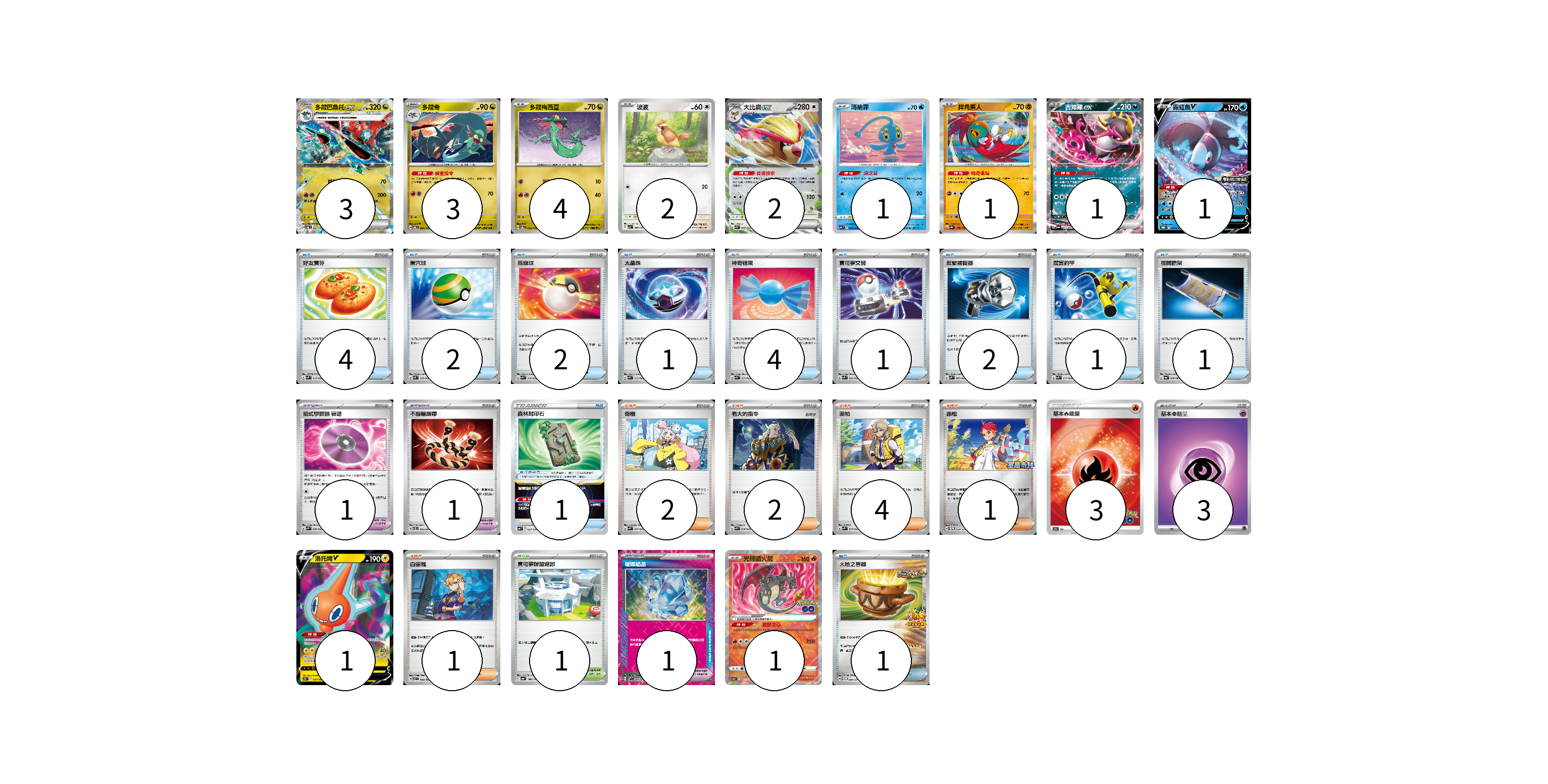 牌組構築方案 以此牌組為基礎新構築牌組 顯示卡面 顯示列表 寶可夢卡(20) 3 3 4 2 2 1 1 1 1 1 1 寶可夢道具(3) 1 1 1 物品卡(20) 4 2 2 1 4 1 2 1 1 1 1 支援者卡(10) 2 2 4 1 1 競技場卡(1) 1 能量卡(6) 3 3 寶可夢卡(20) 卡牌名稱 張數 卡牌名稱 張數 多龍巴魯托ex SV6 081/101 03 多龍奇 SV6 080/101 03 多龍梅西亞 SV6 079/101 04 波波 SV3 087/108 02 大比鳥ex SVK 005/042 02 瑪納霏 SVF 003/038 01 摔角鷹人 SV4a 106/190 01 吉雉雞ex SV6a 038/064 01 霓虹魚V SV-P 134/SV-P 01 洛托姆V S11 037/100 01 光輝噴火龍 S10b 011/071 01 寶可夢道具(3) 卡牌名稱 張數 卡牌名稱 張數 招式學習器 衰退 SVK 026/042 01 不服輸頭帶 SVTL 016/021 01 璀璨結晶 SV7 094/102 01 物品卡(20) 卡牌名稱 張數 卡牌名稱 張數 好友寶芬 SVK 015/042 04 巢穴球 SVK 016/042 02 高級球 SVK 018/042 02 太晶珠 SVK 013/042 01 神奇糖果 SVK 019/042 04 寶可夢交替 SVK 022/042 01 反擊捕捉器 SVK 009/042 02 厲害釣竿 SVK 011/042 01 夜間擔架 SV6a 056/064 01 森林封印石 SVF 024/038 01 大地之容器 SV-P 084/SV-P 01 支援者卡(10) 卡牌名稱 張數 卡牌名稱 張數 奇樹 SVK 031/042 02 老大的指令 SVK 036/042 02 派帕 SVK 035/042 04 赤松 SV-P 150/SV-P 01 白蕾雅 SV7 100/102 01 競技場卡(1) 卡牌名稱 張數 卡牌名稱 張數 寶可夢聯盟總部 SV4a 186/190 01 能量卡(6) 卡牌名稱 張數 卡牌名稱 張數 基本火能量 S10b FIR 03 基本超能量 sv-p PSY 03 以此牌組為基礎新構築牌組 牌組編碼 NQDfqq-zkHcao-ClGPYj copy 列印牌組單 牌組編碼已複製 分享至SNS