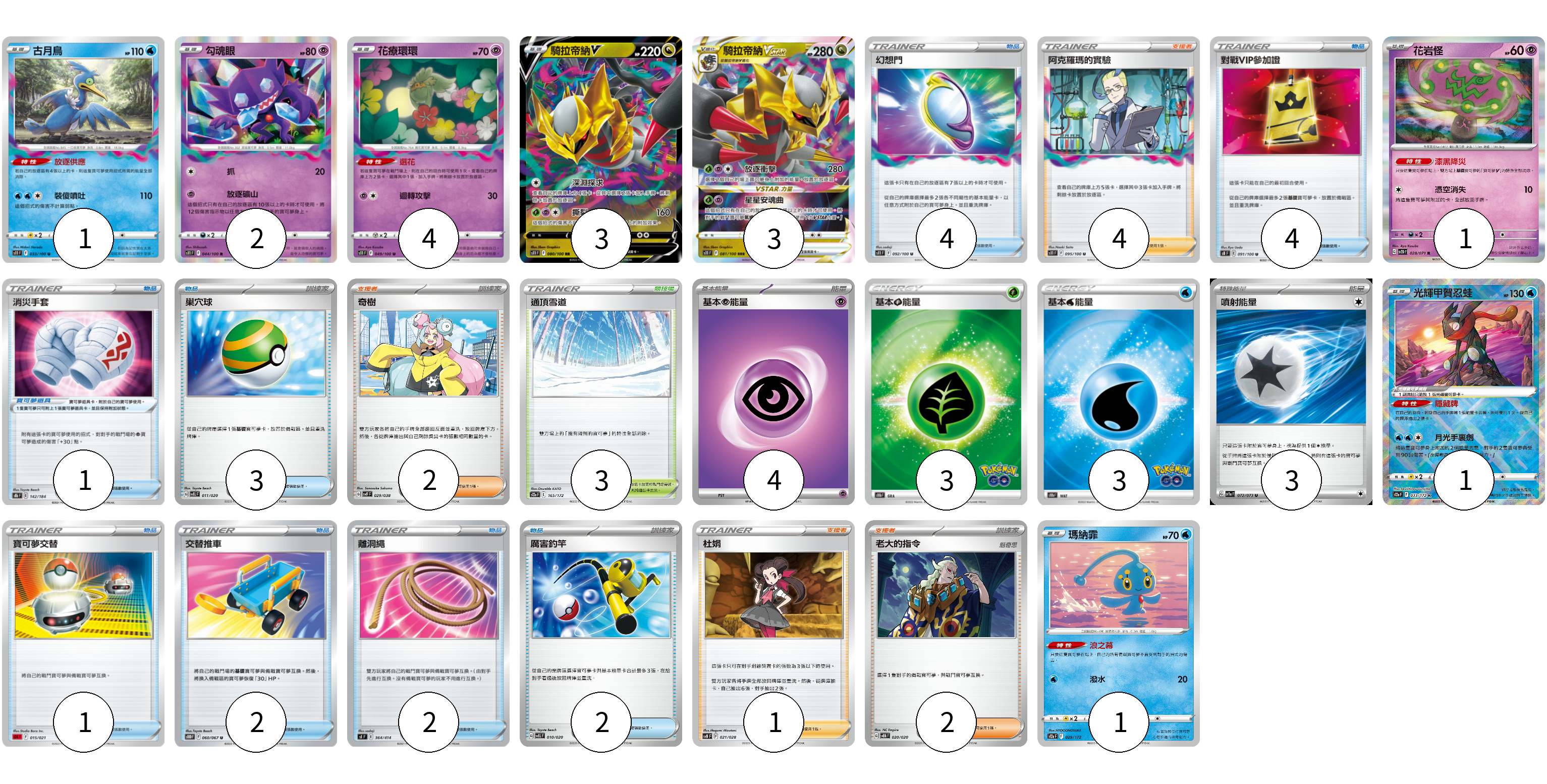 牌組構築方案 以此牌組為基礎新構築牌組 顯示卡面 顯示列表 寶可夢卡(18) 1 2 4 3 3 1 1 2 1 寶可夢道具(1) 1 物品卡(16) 4 4 3 1 2 2 支援者卡(9) 4 2 1 2 競技場卡(3) 3 能量卡(13) 4 3 3 3 寶可夢卡(18) 卡牌名稱 張數 卡牌名稱 張數 古月鳥 S11 033/100 01 勾魂眼 S11 044/100 02 花療環環 S11 049/100 04 騎拉帝納V S11 080/100 03 騎拉帝納VSTAR S11 081/100 03 花岩怪 SV2D 028/071 01 光輝甲賀忍蛙 S12a 033/172 01 厲害釣竿 SVEL 010/020 02 瑪納霏 S12a 029/172 01 寶可夢道具(1) 卡牌名稱 張數 卡牌名稱 張數 消災手套 S8b 142/184 01 物品卡(16) 卡牌名稱 張數 卡牌名稱 張數 幻想門 S11 092/100 04 對戰VIP參加證 S8 091/100 04 巢穴球 SVEL 011/020 03 寶可夢交替 SDL 015/021 01 交替推車 S10D 060/067 02 離洞繩 SI 364/414 02 支援者卡(9) 卡牌名稱 張數 卡牌名稱 張數 阿克羅瑪的實驗 S11 095/100 04 奇樹 SVF 029/038 02 杜娟 SVB 021/028 01 老大的指令 SVEM 020/020 02 競技場卡(3) 卡牌名稱 張數 卡牌名稱 張數 通頂雪道 S12a 165/172 03 能量卡(13) 卡牌名稱 張數 卡牌名稱 張數 基本【超】能量 SVEM PSY 04 基本草能量 S10b GRA 03 基本水能量 S10b WAT 03 噴射能量 SV1a 072/073 03 以此牌組為基礎新構築牌組 牌組編碼 NVVzVF-NzZQBo-liRYKQ copy 列印牌組單 牌組編碼已複製 分享至SNS