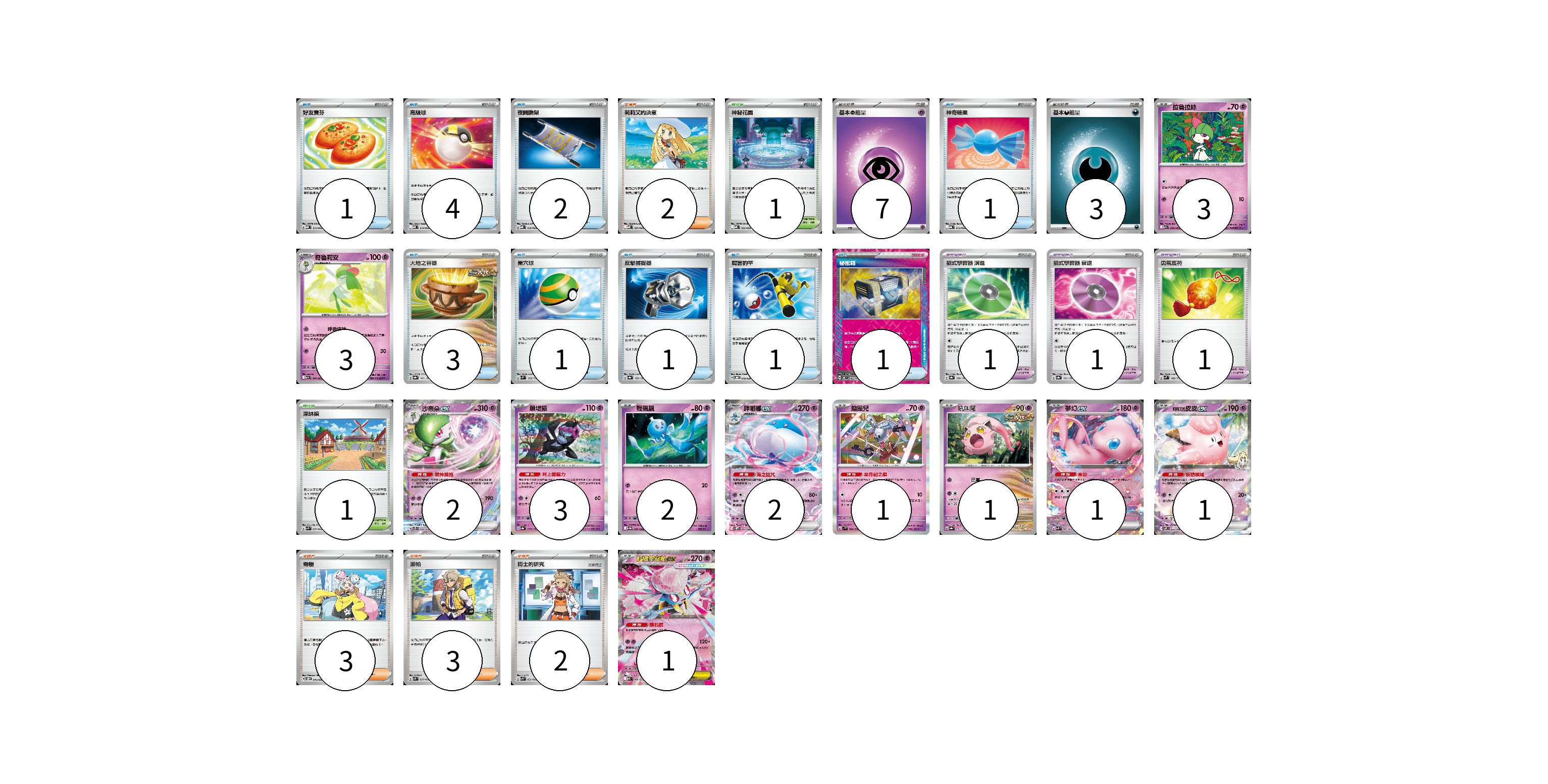 牌組構築方案 以此牌組為基礎新構築牌組 顯示卡面 顯示列表 寶可夢卡(20) 3 3 2 3 2 2 1 1 1 1 1 寶可夢道具(3) 1 1 1 物品卡(15) 1 4 2 1 3 1 1 1 1 支援者卡(10) 2 3 3 2 競技場卡(2) 1 1 能量卡(10) 7 3 寶可夢卡(20) 卡牌名稱 張數 卡牌名稱 張數 拉魯拉絲 M1S 040/063 03 奇魯莉安 M1S 041/063 03 沙奈朵ex SVTS 004/022 02 願增猿 SV8a 075/187 03 輕飄飄 SV11W 041/086 02 胖嘟嘟ex SV11W 042/086 02 鑰圈兒 SV1V 045/078 01 吼叫尾 SV8a 071/187 01 夢幻ex SVK 001/042 01 莉莉艾的皮皮ex SV9 033/100 01 超級蒂安希ex MBD 006/022 01 寶可夢道具(3) 卡牌名稱 張數 卡牌名稱 張數 招式學習器 演進 SV8a 160/187 01 招式學習器 衰退 SV8a 161/187 01 勇氣護符 SVM 142/175 01 物品卡(15) 卡牌名稱 張數 卡牌名稱 張數 好友寶芬 MBD 013/022 01 高級球 MBD 014/022 04 夜間擔架 MBD 016/022 02 神奇糖果 MBG 013/022 01 大地之容器 SV8a 143/187 03 巢穴球 SVM 133/175 01 反擊捕捉器 SV8a 139/187 01 厲害釣竿 SVOD 010/020 01 秘密箱 SV6 092/101 01 支援者卡(10) 卡牌名稱 張數 卡牌名稱 張數 莉莉艾的決意 MBD 021/022 02 奇樹 SVOD 016/020 03 派帕 SVK 035/042 03 博士的研究 SVK 032/042 02 競技場卡(2) 卡牌名稱 張數 卡牌名稱 張數 神秘花園 MBD 022/022 01 深缽鎮 SVK 039/042 01 能量卡(10) 卡牌名稱 張數 卡牌名稱 張數 基本【超】能量 MBD PSY 07 基本【惡】能量 MBG DAR 03 以此牌組為基礎新構築牌組 牌組編碼 NWRxPV-DhttfS-cJbiTI copy 列印牌組單 牌組編碼已複製 分享至SNS