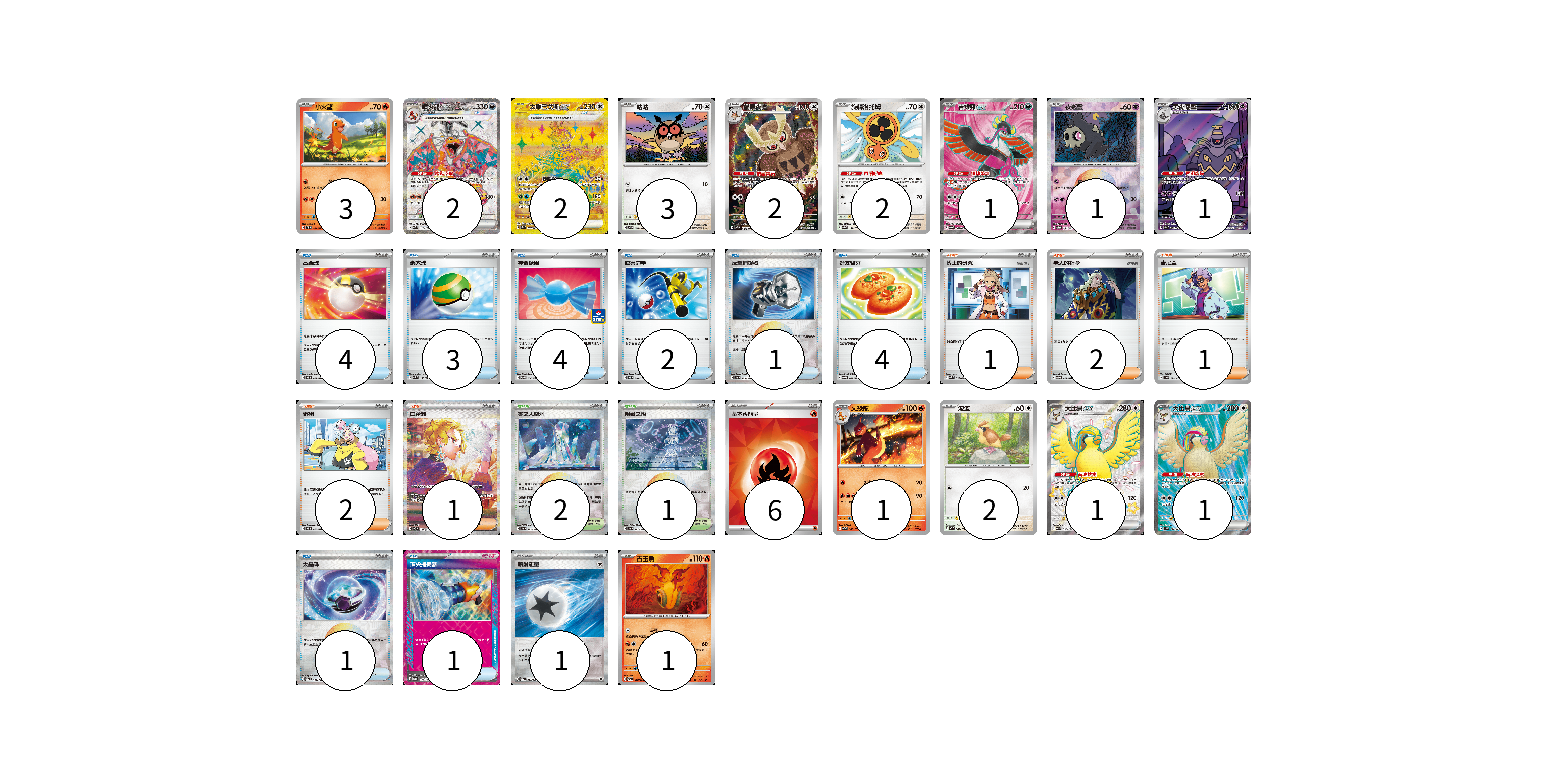 牌組構築方案 以此牌組為基礎新構築牌組 顯示卡面 顯示列表 寶可夢卡(23) 3 2 2 3 2 2 1 1 1 1 2 1 1 1 物品卡(20) 4 3 4 2 1 4 1 1 支援者卡(7) 1 2 1 2 1 競技場卡(3) 2 1 能量卡(7) 6 1 寶可夢卡(23) 卡牌名稱 張數 卡牌名稱 張數 小火龍 SVTL 001/021 03 噴火龍ex SV3 125/108 02 太樂巴戈斯ex SV8a 237/187 02 咕咕 SV7 076/102 03 貓頭夜鷹 SV7 114/102 02 旋轉洛托姆 SV8a 131/187 02 吉雉雞ex SV6a 081/064 01 夜巡靈 SV8a 064/187 01 黑夜魔靈 SV6a 070/064 01 火恐龍 SV2a 005/165 01 波波 SV3 087/108 02 大比鳥ex SV4a 335/190 01 大比鳥ex SV3 128/108 01 古玉魚 SV5a 018/066 01 物品卡(20) 卡牌名稱 張數 卡牌名稱 張數 高級球 SVOD 012/020 04 巢穴球 SVM 133/175 03 神奇糖果 SV-P 104/SV-P 04 厲害釣竿 SVOD 010/020 02 反擊捕捉器 SV8a 139/187 01 好友寶芬 SVOM 012/021 04 太晶珠 SV8a 145/187 01 頂尖捕捉器 SV8a 148/187 01 支援者卡(7) 卡牌名稱 張數 卡牌名稱 張數 博士的研究 SVK 032/042 01 老大的指令 SVOD 019/020 02 吉尼亞 SVD 129/139 01 奇樹 SVOD 016/020 02 白蕾雅 SV7 132/102 01 競技場卡(3) 卡牌名稱 張數 卡牌名稱 張數 零之大空洞 SV8a 182/187 02 阻礙之塔 SV8a 181/187 01 能量卡(7) 卡牌名稱 張數 卡牌名稱 張數 基本【火】能量 SVK FIR 06 噴射能量 SV8a 185/187 01 以此牌組為基礎新構築牌組 牌組編碼 NXFoIp-lrHxUk-eQcnGw copy 列印牌組單 牌組編碼已複製 分享至SNS