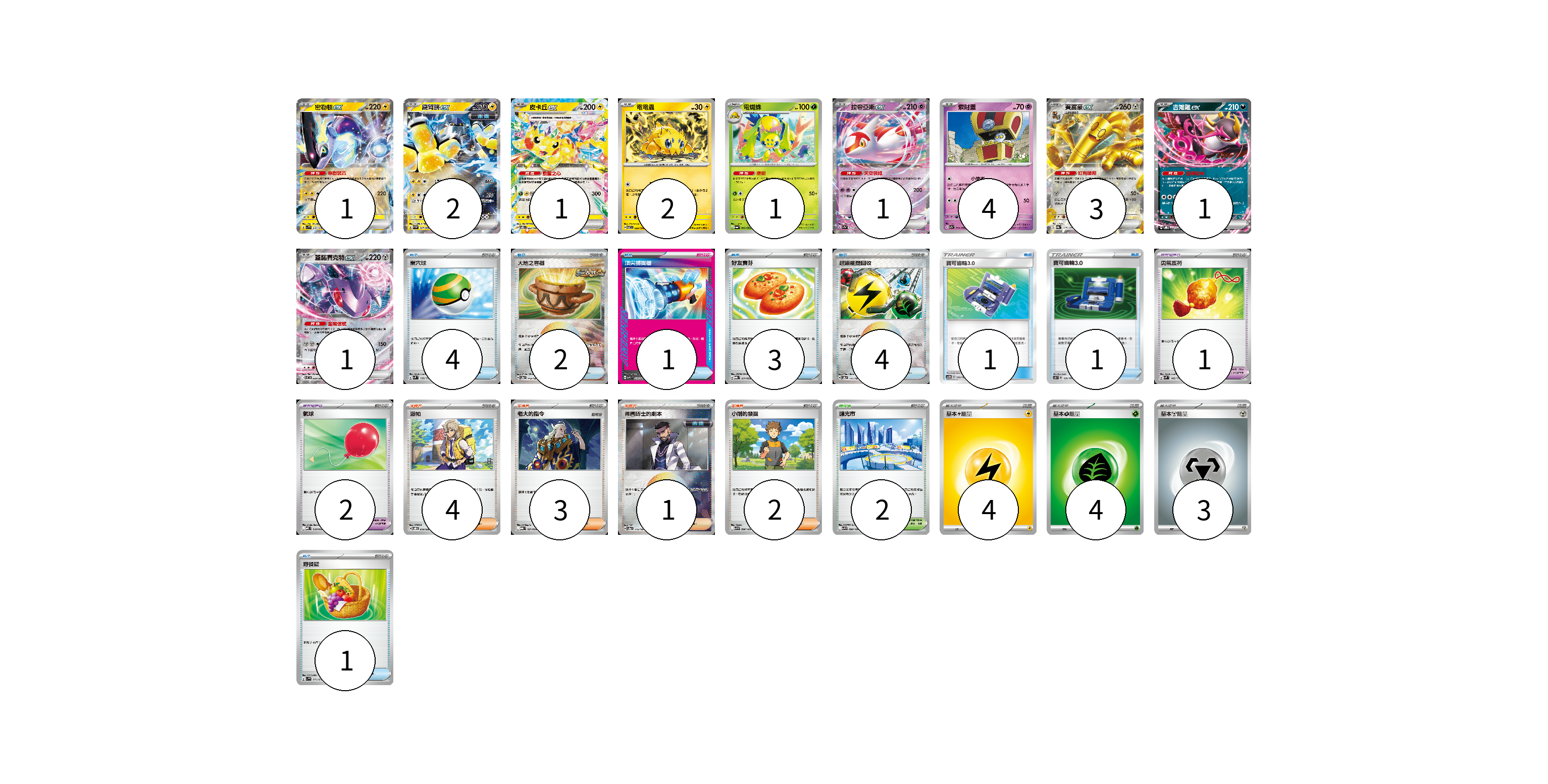 牌組構築方案 以此牌組為基礎新構築牌組 顯示卡面 顯示列表 寶可夢卡(17) 1 2 1 2 1 1 4 3 1 1 寶可夢道具(3) 1 2 物品卡(17) 4 2 1 3 4 1 1 1 支援者卡(10) 4 3 1 2 競技場卡(2) 2 能量卡(11) 4 4 3 寶可夢卡(17) 卡牌名稱 張數 卡牌名稱 張數 密勒頓ex SV1V 037/078 01 鐵臂膀ex SV4M 027/066 02 皮卡丘ex SV8 033/106 01 電電蟲 SV7 032/102 02 電蜘蛛 SV6a 002/064 01 拉帝亞斯ex SV7a 019/064 01 索財靈 SV7a 024/064 04 賽富豪ex SV8a 117/187 03 吉雉雞ex SVOD 004/020 01 蓋諾賽克特ex SV11B 069/086 01 寶可夢道具(3) 卡牌名稱 張數 卡牌名稱 張數 勇氣護符 SVM 142/175 01 氣球 MBD 018/022 02 物品卡(17) 卡牌名稱 張數 卡牌名稱 張數 巢穴球 SVM 133/175 04 大地之容器 SV8a 143/187 02 頂尖捕捉器 MBG 014/022 01 好友寶芬 MBG 011/022 03 超級能量回收 SV8a 141/187 04 寶可齒輪3.0 AS5D 149/169 01 寶可齒輪3.0 SCB 126/156 01 野餐籃 SV1V 071/078 01 支援者卡(10) 卡牌名稱 張數 卡牌名稱 張數 派帕 SVOD 018/020 04 老大的指令 MBG 021/022 03 弗圖博士的劇本 SV8a 175/187 01 小剛的發掘 SV9 096/100 02 競技場卡(2) 卡牌名稱 張數 卡牌名稱 張數 釀光市 SV9 098/100 02 能量卡(11) 卡牌名稱 張數 卡牌名稱 張數 基本雷能量 sv-p LIG 04 基本草能量 sv-p GRA 04 基本鋼能量 sv-p MET 03 以此牌組為基礎新構築牌組 牌組編碼 NYqUkd-lGZdAE-YIevKE copy 列印牌組單 牌組編碼已複製 分享至SNS