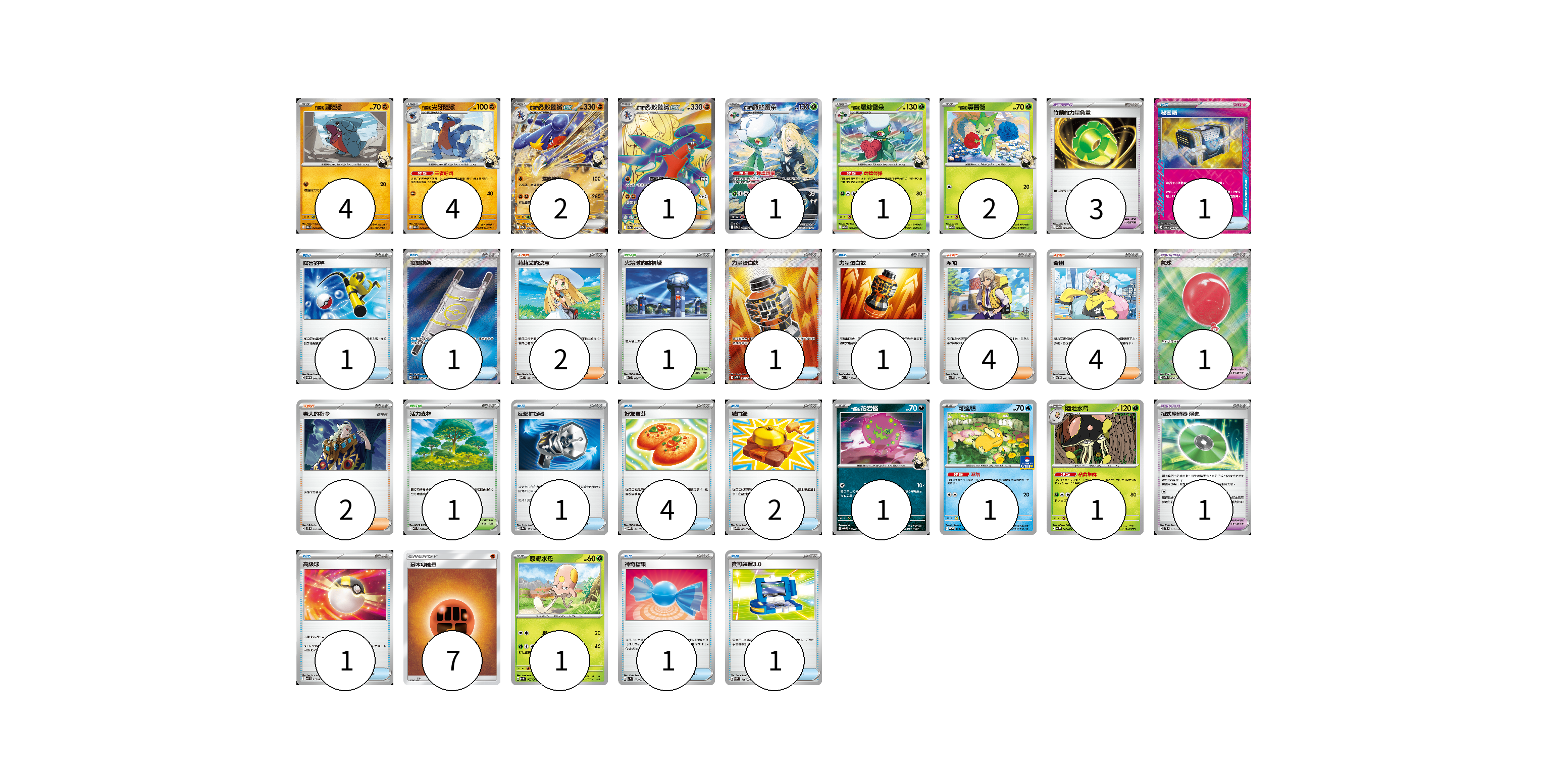牌組構築方案 以此牌組為基礎新構築牌組 顯示卡面 顯示列表 寶可夢卡(19) 4 4 2 1 1 1 2 1 1 1 1 寶可夢道具(5) 3 1 1 物品卡(15) 1 1 1 1 1 1 4 2 1 1 1 支援者卡(12) 2 4 4 2 競技場卡(2) 1 1 能量卡(7) 7 寶可夢卡(19) 卡牌名稱 張數 卡牌名稱 張數 <竹蘭的>圓陸鯊 SV9a 042/063 04 <竹蘭的>尖牙陸鯊 SV9a 043/063 04 <竹蘭的>烈咬陸鯊ex SV9a 044/063 02 <竹蘭的>烈咬陸鯊ex SV9a 080/063 01 <竹蘭的>羅絲雷朵 SV9a 065/063 01 <竹蘭的>羅絲雷朵 SV9a 005/063 01 <竹蘭的>毒薔薇 SV9a 004/063 02 <竹蘭的>花岩怪 SV9a 050/063 01 可達鴨 SV-P 220/SV-P 01 陸地水母 SV4M 008/066 01 原野水母 SV4M 007/066 01 寶可夢道具(5) 卡牌名稱 張數 卡牌名稱 張數 竹蘭的力量負重 SV9a 060/063 03 氣球 M1L 084/063 01 招式學習器 演進 SVTL 017/021 01 物品卡(15) 卡牌名稱 張數 卡牌名稱 張數 秘密箱 SV6 092/101 01 厲害釣竿 SVOM 011/021 01 夜間擔架 M1L 083/063 01 力量蛋白飲 M1L 081/063 01 力量蛋白飲 M1L 058/063 01 反擊捕捉器 SV8a 139/187 01 好友寶芬 MBG 011/022 04 戰鬥鑼 M1L 059/063 02 高級球 SVHM 013/022 01 神奇糖果 SV1V 072/078 01 寶可裝置3.0 SVAW 016/023 01 支援者卡(12) 卡牌名稱 張數 卡牌名稱 張數 莉莉艾的決意 MBD 021/022 02 派帕 SV1V 076/078 04 奇樹 SVTH 015/018 04 老大的指令 SVTS 020/022 02 競技場卡(2) 卡牌名稱 張數 卡牌名稱 張數 火箭隊的監視塔 SV10 096/098 01 活力森林 M1S 061/063 01 能量卡(7) 卡牌名稱 張數 卡牌名稱 張數 基本鬥能量 AS6D FIG 07 以此牌組為基礎新構築牌組 牌組編碼 NbPnKj-uEklDG-CYbvyJ copy 列印牌組單 牌組編碼已複製 分享至SNS