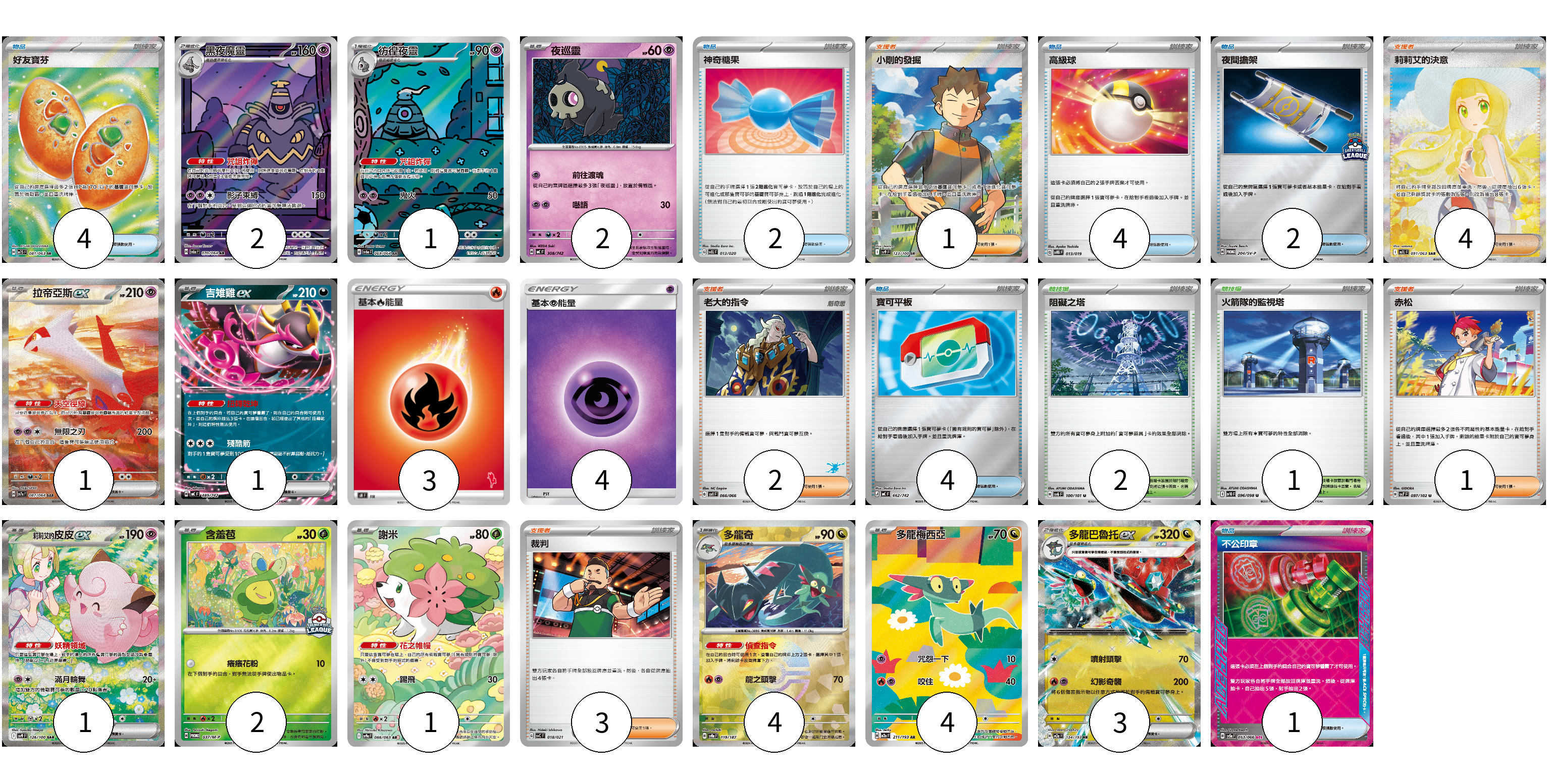 牌組構築方案 以此牌組為基礎新構築牌組 顯示卡面 顯示列表 寶可夢卡(22) 2 1 2 1 1 1 2 1 4 4 3 物品卡(17) 4 2 4 2 4 1 支援者卡(11) 1 4 2 1 3 競技場卡(3) 2 1 能量卡(7) 3 4 寶可夢卡(22) 卡牌名稱 張數 卡牌名稱 張數 黑夜魔靈 SV6a 070/064 02 彷徨夜靈 SV6a 069/064 01 夜巡靈 MC 308/742 02 拉帝亞斯ex SV7a 087/064 01 吉雉雞ex MC 489/742 01 莉莉艾的皮皮ex SV9 126/100 01 含羞苞 M-P 037/M-P 02 謝米 SV9a 066/063 01 多龍奇 SV8a 119/187 04 多龍梅西亞 M2a 211/193 04 多龍巴魯托ex M2a 134/193 03 物品卡(17) 卡牌名稱 張數 卡牌名稱 張數 好友寶芬 M1S 081/063 04 神奇糖果 SVEL 013/020 02 高級球 SVTG 013/019 04 夜間擔架 SV-P 204/SV-P 02 寶可平板 MC 662/742 04 不公印章 SV5a 053/066 01 支援者卡(11) 卡牌名稱 張數 卡牌名稱 張數 小剛的發掘 SV9 123/100 01 莉莉艾的決意 M1L 091/063 04 老大的指令 SVI 066/066 02 赤松 SV7 097/102 01 裁判 SVC 018/021 03 競技場卡(3) 卡牌名稱 張數 卡牌名稱 張數 阻礙之塔 SV6 100/101 02 火箭隊的監視塔 SV10 096/098 01 能量卡(7) 卡牌名稱 張數 卡牌名稱 張數 基本火能量 SH FIR 03 基本超能量 AS6D PSY 04 以此牌組為基礎新構築牌組 牌組編碼 Ncgjkv-OAJLzd-HuSKMB copy 列印牌組單 牌組編碼已複製 分享至SNS