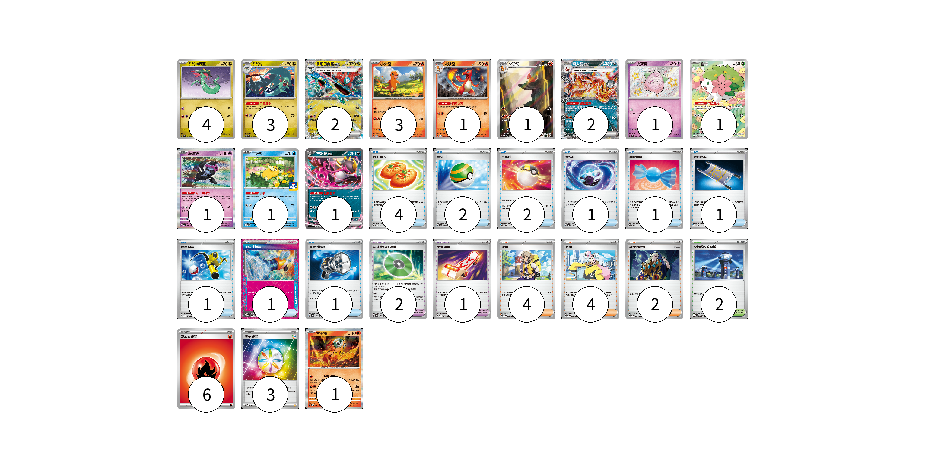 牌組構築方案 以此牌組為基礎新構築牌組 顯示卡面 顯示列表 寶可夢卡(22) 4 3 2 3 1 1 2 1 1 1 1 1 1 寶可夢道具(3) 2 1 物品卡(14) 4 2 2 1 1 1 1 1 1 支援者卡(10) 4 4 2 競技場卡(2) 2 能量卡(9) 6 3 寶可夢卡(22) 卡牌名稱 張數 卡牌名稱 張數 多龍梅西亞 SV8a 118/187 04 多龍奇 SV8a 119/187 03 多龍巴魯托ex SV8a 120/187 02 小火龍 SVTL 001/021 03 火恐龍 SVTL 002/021 01 火恐龍 SV2a 169/165 01 噴火龍ex SVTL 006/021 02 皮寶寶 SV4a 255/190 01 謝米 SV9a 066/063 01 願增猿 SV8a 075/187 01 可達鴨 SV-P 220/SV-P 01 吉雉雞ex SVOD 004/020 01 古玉魚 SV8a 025/187 01 寶可夢道具(3) 卡牌名稱 張數 卡牌名稱 張數 招式學習器 演進 SV8a 160/187 02 緊急滑板 SVOD 015/020 01 物品卡(14) 卡牌名稱 張數 卡牌名稱 張數 好友寶芬 SVOD 011/020 04 巢穴球 SVM 133/175 02 高級球 SVOD 012/020 02 太晶珠 SV8a 145/187 01 神奇糖果 SVOD 013/020 01 夜間擔架 SVOM 016/021 01 厲害釣竿 SVOD 010/020 01 頂尖捕捉器 SV8a 148/187 01 反擊捕捉器 SV8a 139/187 01 支援者卡(10) 卡牌名稱 張數 卡牌名稱 張數 派帕 SVOD 018/020 04 奇樹 SVOD 016/020 04 老大的指令 SVOD 019/020 02 競技場卡(2) 卡牌名稱 張數 卡牌名稱 張數 火箭隊的監視塔 SV10 096/098 02 能量卡(9) 卡牌名稱 張數 卡牌名稱 張數 基本火能量 sv-p FIR 06 夜光能量 SVK 042/042 03 以此牌組為基礎新構築牌組 牌組編碼 NeJJbi-BQdudH-DVtFDi copy 列印牌組單 牌組編碼已複製 分享至SNS