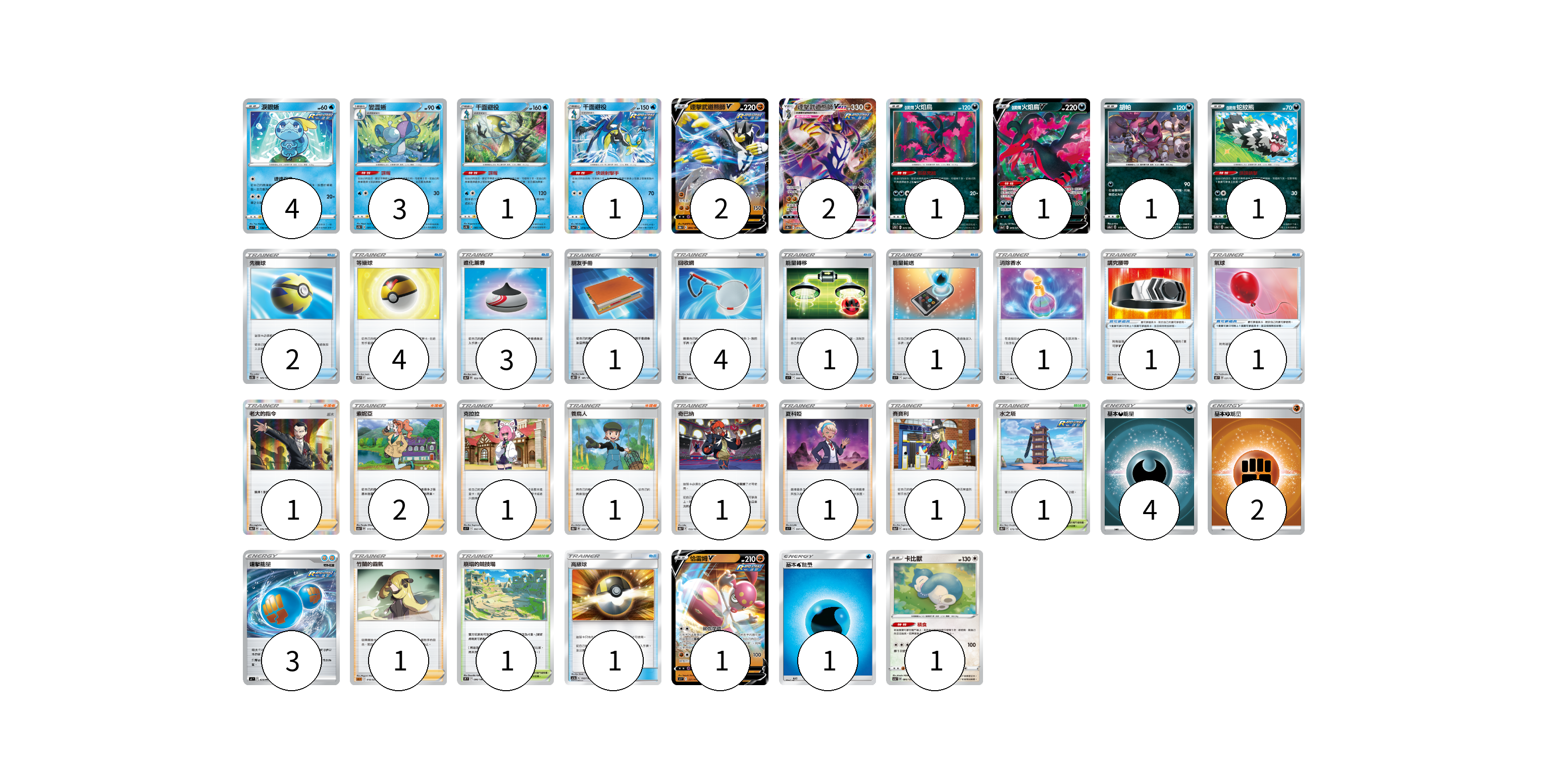 牌組構築方案 以此牌組為基礎新構築牌組 顯示卡面 顯示列表 寶可夢卡(19) 4 3 1 1 2 2 1 1 1 1 1 1 寶可夢道具(2) 1 1 物品卡(18) 2 4 3 1 4 1 1 1 1 支援者卡(9) 1 2 1 1 1 1 1 1 競技場卡(2) 1 1 能量卡(10) 4 2 3 1 寶可夢卡(19) 卡牌名稱 張數 卡牌名稱 張數 淚眼蜥 SI 116/414 04 變澀蜥 SC1b 081/153 03 千面避役 SC1b 082/153 01 千面避役 S5a 018/070 01 連擊武道熊師V S8b 094/184 02 連擊武道熊師VMAX S8b 095/184 02 伽勒爾 火焰鳥 S7D 026/067 01 伽勒爾 火焰鳥V S5a 045/070 01 胡帕 SC2a 113/145 01 伽勒爾 蛇紋熊 SC1b 096/153 01 恰雷姆V SI 221/414 01 卡比獸 SCA 084/135 01 寶可夢道具(2) 卡牌名稱 張數 卡牌名稱 張數 講究腰帶 SLL 015/021 01 氣球 SK 021/030 01 物品卡(18) 卡牌名稱 張數 卡牌名稱 張數 先機球 SC1D 149/164 02 等級球 S8b 141/184 04 進化薰香 S4a 159/190 03 朋友手冊 SC2D 141/157 01 回收網 SCA 093/135 04 能量轉移 SI 366/414 01 能量輸送 SI 367/414 01 消除香水 S9a 063/067 01 高級球 AC1a 132/158 01 支援者卡(9) 卡牌名稱 張數 卡牌名稱 張數 老大的指令(坂木) S4a 176/190 01 索妮亞 SCA 111/135 02 克拉拉 SI 392/414 01 養鳥人 S8b 155/184 01 奇巴納 S8b 150/184 01 夏科婭 SI 397/414 01 賽寶利 S5a 068/070 01 竹蘭的霸氣 SLL 018/021 01 競技場卡(2) 卡牌名稱 張數 卡牌名稱 張數 水之塔 S8b 170/184 01 崩塌的競技場 S9 098/100 01 能量卡(10) 卡牌名稱 張數 卡牌名稱 張數 基本惡能量 SLD DAR 04 基本鬥能量 SLL FIG 02 連擊能量 SI 414/414 03 基本水能量 AS6D WAT 01 以此牌組為基礎新構築牌組 牌組編碼 NeSXzM-kniqkC-vbPwbi copy 列印牌組單 牌組編碼已複製 分享至SNS