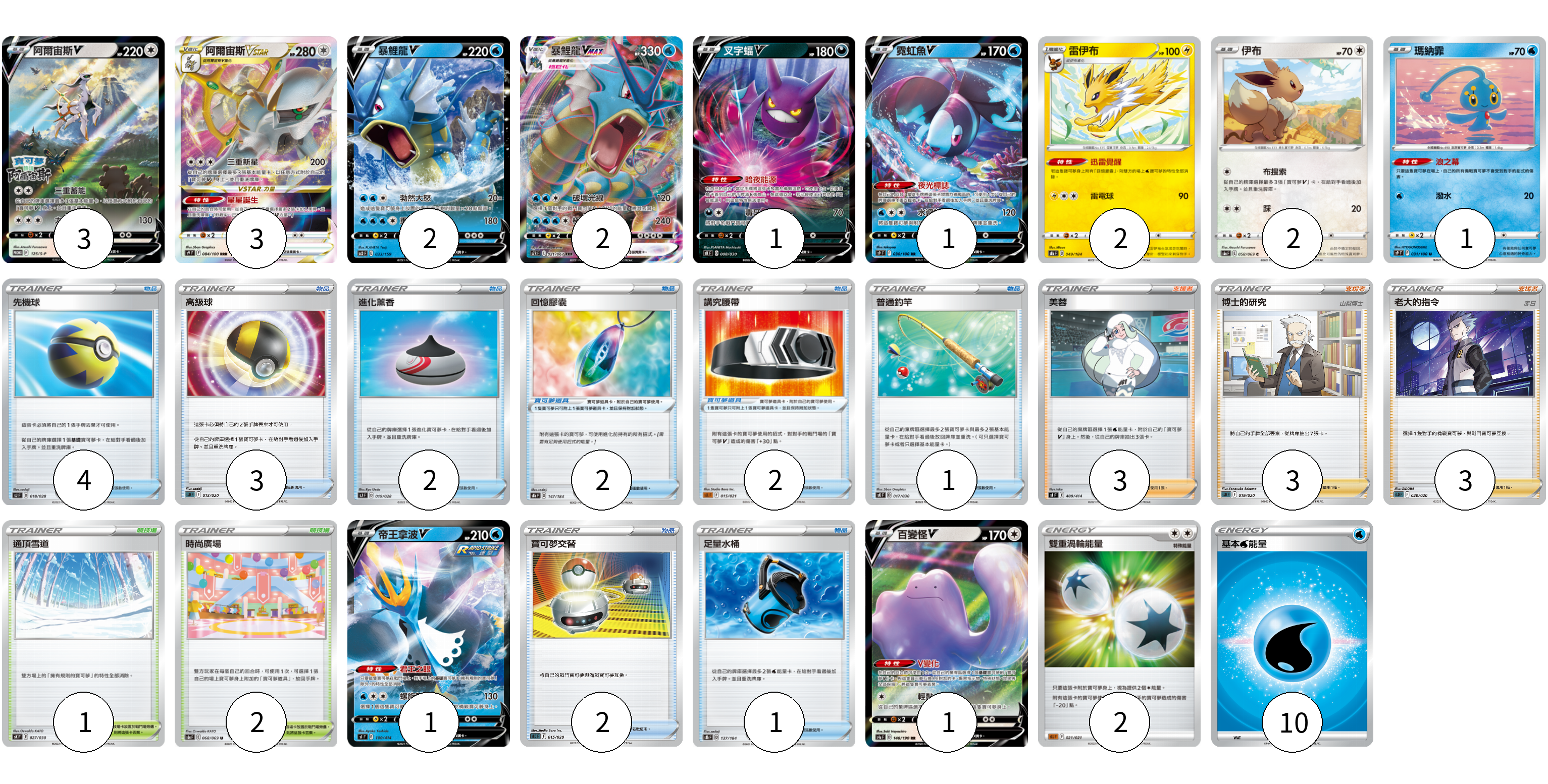 牌組構築方案 以此牌組為基礎新構築牌組 顯示卡面 顯示列表 寶可夢卡(19) 3 3 2 2 1 1 2 2 1 1 1 寶可夢道具(4) 2 2 物品卡(13) 4 3 2 1 2 1 支援者卡(9) 3 3 3 競技場卡(3) 1 2 能量卡(12) 2 10 寶可夢卡(19) 卡牌名稱 張數 卡牌名稱 張數 阿爾宙斯V S-P 125/S-P 03 阿爾宙斯VSTAR S9 084/100 03 暴鯉龍V SCD 033/159 02 暴鯉龍VMAX S7R 021/067 02 叉字蝠V SK 008/030 01 霓虹魚V S9 030/100 01 雷伊布 S8b 049/184 02 伊布 S6a 058/069 02 瑪納霏 S9 031/100 01 帝王拿波V SI 100/414 01 百變怪V S4a 140/190 01 寶可夢道具(4) 卡牌名稱 張數 卡牌名稱 張數 回憶膠囊 S8b 147/184 02 講究腰帶 SLL 015/021 02 物品卡(13) 卡牌名稱 張數 卡牌名稱 張數 先機球 SJ 018/028 04 高級球 SLD 013/020 03 進化薰香 SJ 019/028 02 普通釣竿 SK 017/030 01 寶可夢交替 SLD 015/020 02 足量水桶 S8b 137/184 01 支援者卡(9) 卡牌名稱 張數 卡牌名稱 張數 美蓉 SI 409/414 03 博士的研究(山梨博士) SLD 019/020 03 老大的指令(赤日) SLD 020/020 03 競技場卡(3) 卡牌名稱 張數 卡牌名稱 張數 通頂雪道 SK 027/030 01 時尚廣場 S6a 068/069 02 能量卡(12) 卡牌名稱 張數 卡牌名稱 張數 雙重渦輪能量 SLL 021/021 02 基本【水】能量 SI WAT 10 以此牌組為基礎新構築牌組 牌組編碼 NgJsoV-aHWygm-CLeWRY copy 列印牌組單 牌組編碼已複製 分享至SNS