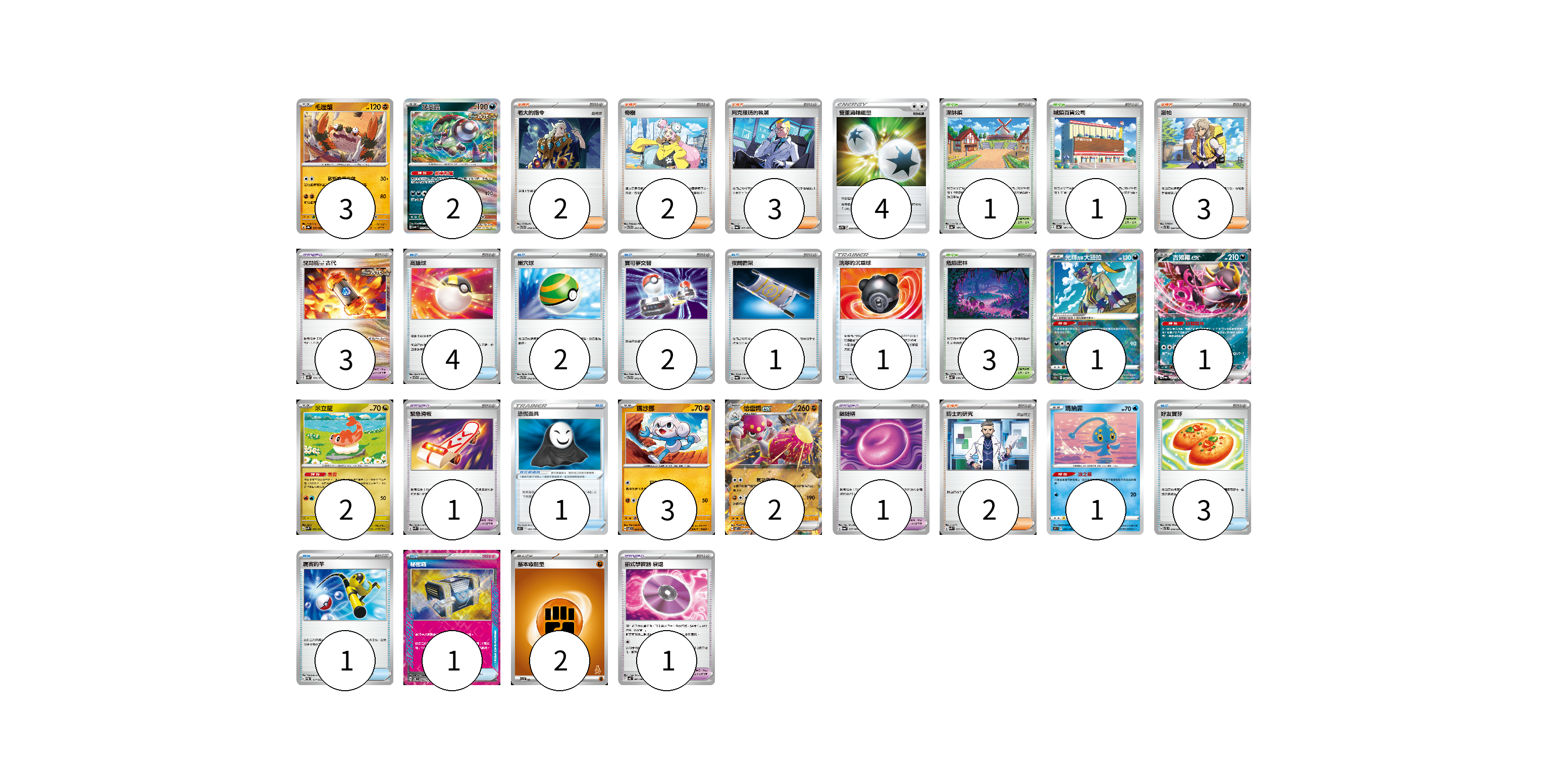 牌組構築方案 以此牌組為基礎新構築牌組 顯示卡面 顯示列表 寶可夢卡(15) 3 2 1 1 2 3 2 1 寶可夢道具(7) 3 1 1 1 1 物品卡(15) 4 2 2 1 1 3 1 1 支援者卡(12) 2 2 3 3 2 競技場卡(5) 1 1 3 能量卡(6) 4 2 寶可夢卡(15) 卡牌名稱 張數 卡牌名稱 張數 毛崖蟹 SV3a 031/062 03 猛惡菇 SV4K 053/066 02 光輝洗翠 大狃拉 S10a 046/071 01 吉雉雞ex SV6a 038/064 01 米立龍 SVK 002/042 02 瑪沙那 SV7 053/102 03 恰雷姆ex SV7 054/102 02 瑪納霏 S9 031/100 01 寶可夢道具(7) 卡牌名稱 張數 卡牌名稱 張數 驅勁能量 古代 SV5K 065/071 03 緊急滑板 SVK 023/042 01 恐慌面具 S11 094/100 01 鎖鏈糬 SV6a 057/064 01 招式學習器 衰退 SV4K 063/066 01 物品卡(15) 卡牌名稱 張數 卡牌名稱 張數 高級球 SVTG 013/019 04 巢穴球 SVTG 012/019 02 寶可夢交替 SVTG 015/019 02 夜間擔架 SV6a 056/064 01 洗翠的沉重球 SVF 019/038 01 好友寶芬 SVTL 010/021 03 厲害釣竿 SVEM 011/020 01 秘密箱 SV6 092/101 01 支援者卡(12) 卡牌名稱 張數 卡牌名稱 張數 老大的指令 SVTG 019/019 02 奇樹 SVTG 017/019 02 阿克羅瑪的執著 SV6a 059/064 03 派帕 SVTL 020/021 03 博士的研究 SVK 033/042 02 競技場卡(5) 卡牌名稱 張數 卡牌名稱 張數 深缽鎮 SV4a 185/190 01 城鎮百貨公司 SV4a 183/190 01 危險密林 SV5K 070/071 03 能量卡(6) 卡牌名稱 張數 卡牌名稱 張數 雙重渦輪能量 SVTM 022/022 04 基本【鬥】能量 SVI FIG 02 以此牌組為基礎新構築牌組 牌組編碼 NhOwHK-mnxLfB-cjtwKe copy 列印牌組單 牌組編碼已複製 分享至SNS