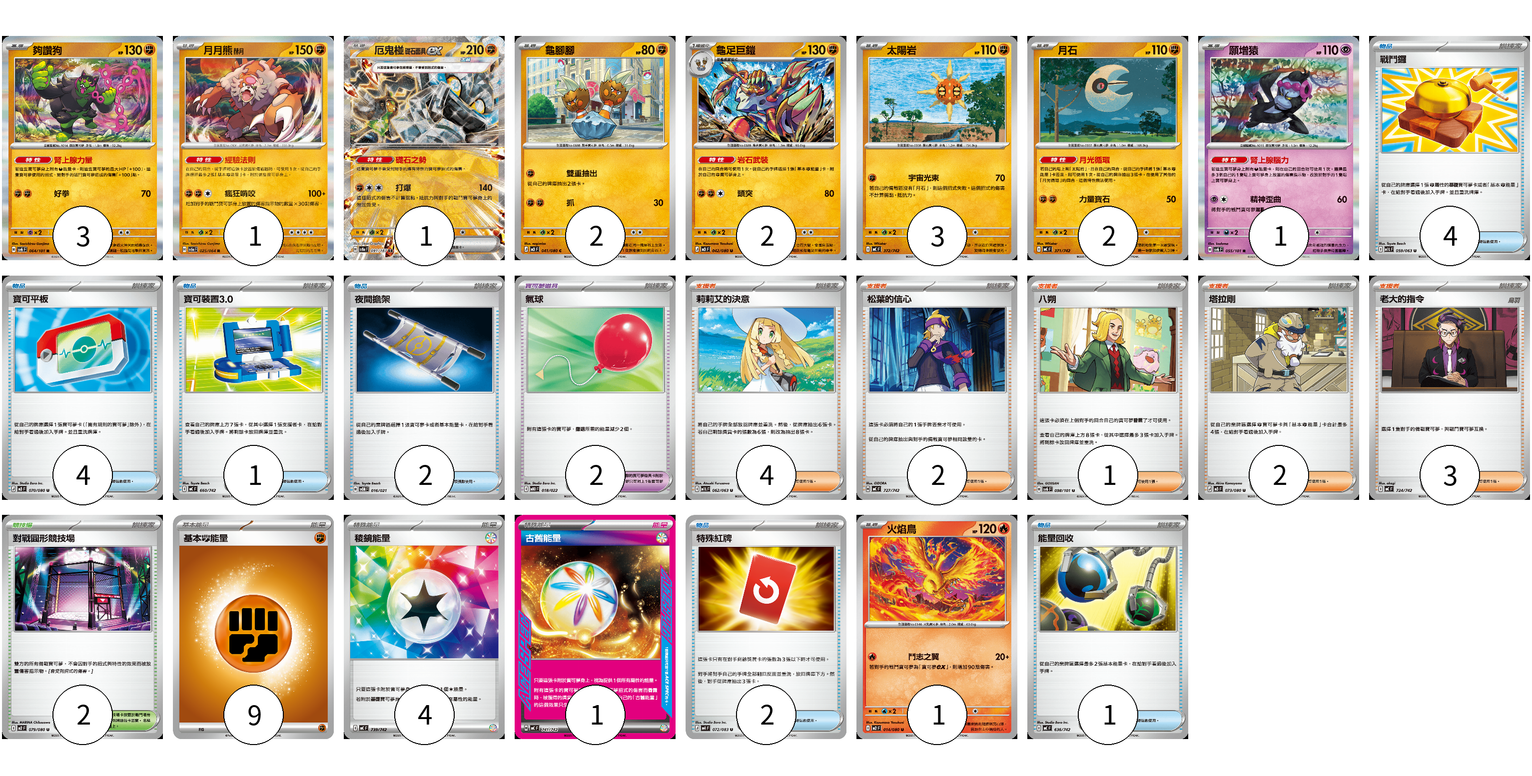 牌組構築方案 以此牌組為基礎新構築牌組 顯示卡面 顯示列表 寶可夢卡(16) 3 1 1 2 2 3 2 1 1 寶可夢道具(2) 2 物品卡(14) 4 4 1 2 2 1 支援者卡(12) 4 2 1 2 3 競技場卡(2) 2 能量卡(14) 9 4 1 寶可夢卡(16) 卡牌名稱 張數 卡牌名稱 張數 夠讚狗 SV6 064/101 03 月月熊 赫月 SV6a 025/064 01 厄鬼椪 礎石面具ex SV8a 091/187 01 龜腳腳 M3 041/080 02 龜足巨鎧 M3 042/080 02 太陽岩 MC 372/742 03 月石 MC 371/742 02 願增猿 SV6 055/101 01 火焰鳥 M2 014/080 01 寶可夢道具(2) 卡牌名稱 張數 卡牌名稱 張數 氣球 MBD 018/022 02 物品卡(14) 卡牌名稱 張數 卡牌名稱 張數 戰鬥鑼 M1L 059/063 04 寶可平板 M3 070/080 04 寶可裝置3.0 MC 660/742 01 夜間擔架 SVOM 016/021 02 特殊紅牌 M4 072/083 02 能量回收 MC 636/742 01 支援者卡(12) 卡牌名稱 張數 卡牌名稱 張數 莉莉艾的決意 M1L 062/063 04 松葉的信心 MC 727/742 02 八朔 SV6 098/101 01 塔拉剛 M3 073/080 02 老大的指令 MC 724/742 03 競技場卡(2) 卡牌名稱 張數 卡牌名稱 張數 對戰圓形競技場 M2 079/080 02 能量卡(14) 卡牌名稱 張數 卡牌名稱 張數 基本【鬥】能量 M-P FIG 09 稜鏡能量 MC 739/742 04 古舊能量 MC 741/742 01 以此牌組為基礎新構築牌組 牌組編碼 NhdOaW-PGzYkx-PUExMR copy 列印牌組單 牌組編碼已複製 分享至SNS