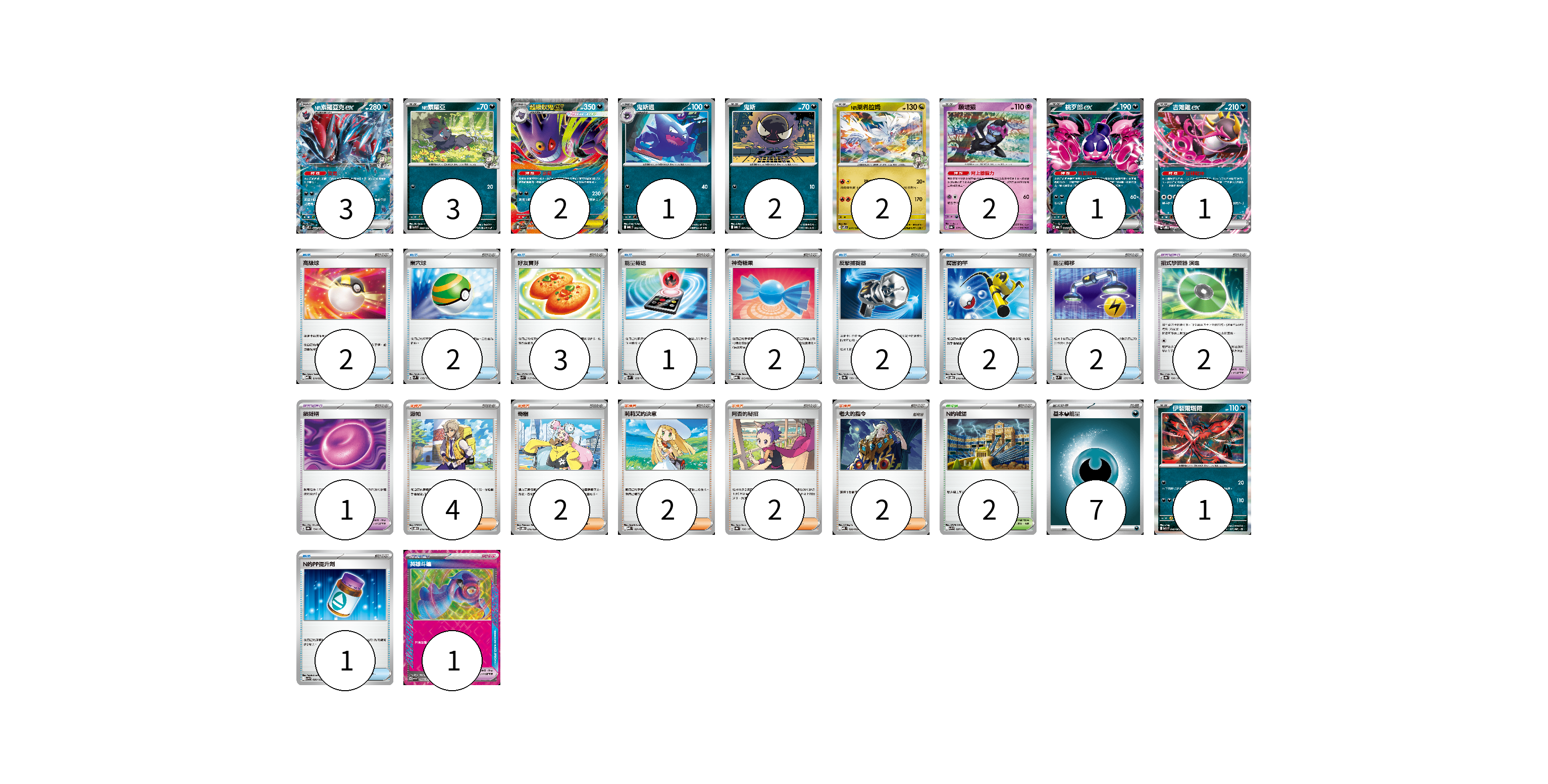 牌組構築方案 以此牌組為基礎新構築牌組 顯示卡面 顯示列表 寶可夢卡(18) 3 3 2 1 2 2 2 1 1 1 寶可夢道具(4) 2 1 1 物品卡(17) 2 2 3 1 2 2 2 2 1 支援者卡(12) 4 2 2 2 2 競技場卡(2) 2 能量卡(7) 7 寶可夢卡(18) 卡牌名稱 張數 卡牌名稱 張數 N的索羅亞克ex SV9 061/100 03 N的索羅亞 SV9 060/100 03 超級耿鬼ex MBG 003/022 02 鬼斯通 MBG 002/022 01 鬼斯 MBG 001/022 02 N的萊希拉姆 SV9 074/100 02 願增猿 SV8a 075/187 02 桃歹郎ex MBG 009/022 01 吉雉雞ex SVOD 004/020 01 伊裴爾塔爾 M1L 040/063 01 寶可夢道具(4) 卡牌名稱 張數 卡牌名稱 張數 招式學習器 演進 SV8a 160/187 02 鎖鏈糬 SV8a 154/187 01 英雄斗篷 SV5M 064/071 01 物品卡(17) 卡牌名稱 張數 卡牌名稱 張數 高級球 MBD 014/022 02 巢穴球 SVM 133/175 02 好友寶芬 SVK 015/042 03 能量輸送 SVM 128/175 01 神奇糖果 MBG 013/022 02 反擊捕捉器 SV8a 139/187 02 厲害釣竿 SVOD 010/020 02 能量轉移 SVM 127/175 02 N的PP提升劑 SV9 089/100 01 支援者卡(12) 卡牌名稱 張數 卡牌名稱 張數 派帕 SVOD 018/020 04 奇樹 SVOD 016/020 02 莉莉艾的決意 MBD 021/022 02 阿杏的秘招 SV8a 166/187 02 老大的指令 MBD 020/022 02 競技場卡(2) 卡牌名稱 張數 卡牌名稱 張數 N的城堡 SV9 097/100 02 能量卡(7) 卡牌名稱 張數 卡牌名稱 張數 基本【惡】能量 MBG DAR 07 以此牌組為基礎新構築牌組 牌組編碼 NiaIdk-WqeGdI-TJxzaK copy 列印牌組單 牌組編碼已複製 分享至SNS