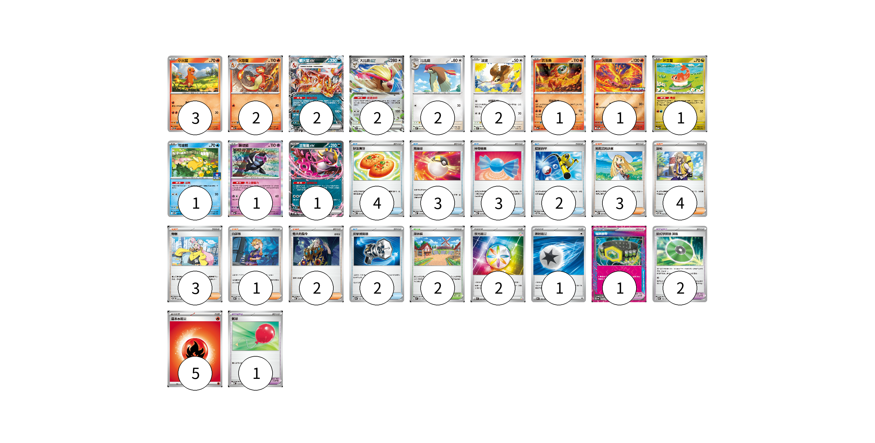牌組構築方案 以此牌組為基礎新構築牌組 顯示卡面 顯示列表 寶可夢卡(19) 3 2 2 2 2 2 1 1 1 1 1 1 寶可夢道具(4) 1 2 1 物品卡(14) 4 3 3 2 2 支援者卡(13) 3 4 3 1 2 競技場卡(2) 2 能量卡(8) 2 1 5 寶可夢卡(19) 卡牌名稱 張數 卡牌名稱 張數 小火龍 SVTL 001/021 03 火恐龍 M2 012/080 02 噴火龍ex SVTL 006/021 02 大比鳥ex SVK 005/042 02 比比鳥 SVK 004/042 02 波波 SVK 003/042 02 古玉魚 SV8a 025/187 01 火焰鳥 M-P 022/M-P 01 米立龍 MBG 010/022 01 可達鴨 SV-P 220/SV-P 01 願增猿 SV8a 075/187 01 吉雉雞ex SVOD 004/020 01 寶可夢道具(4) 卡牌名稱 張數 卡牌名稱 張數 極限腰帶 SV8a 159/187 01 招式學習器 演進 SV8a 160/187 02 氣球 MBD 018/022 01 物品卡(14) 卡牌名稱 張數 卡牌名稱 張數 好友寶芬 MBD 013/022 04 高級球 MBD 014/022 03 神奇糖果 MBG 013/022 03 厲害釣竿 SVOD 010/020 02 反擊捕捉器 SV8a 139/187 02 支援者卡(13) 卡牌名稱 張數 卡牌名稱 張數 莉莉艾的決意 MBD 021/022 03 派帕 SVOD 018/020 04 奇樹 SVOD 016/020 03 白蕾雅 SV8a 176/187 01 老大的指令 MBG 021/022 02 競技場卡(2) 卡牌名稱 張數 卡牌名稱 張數 深缽鎮 SVK 039/042 02 能量卡(8) 卡牌名稱 張數 卡牌名稱 張數 夜光能量 SVK 042/042 02 噴射能量 SV8a 185/187 01 基本【火】能量 M-P FIR 05 以此牌組為基礎新構築牌組 牌組編碼 NjcVLA-kpxpEX-decxFD copy 列印牌組單 牌組編碼已複製 分享至SNS