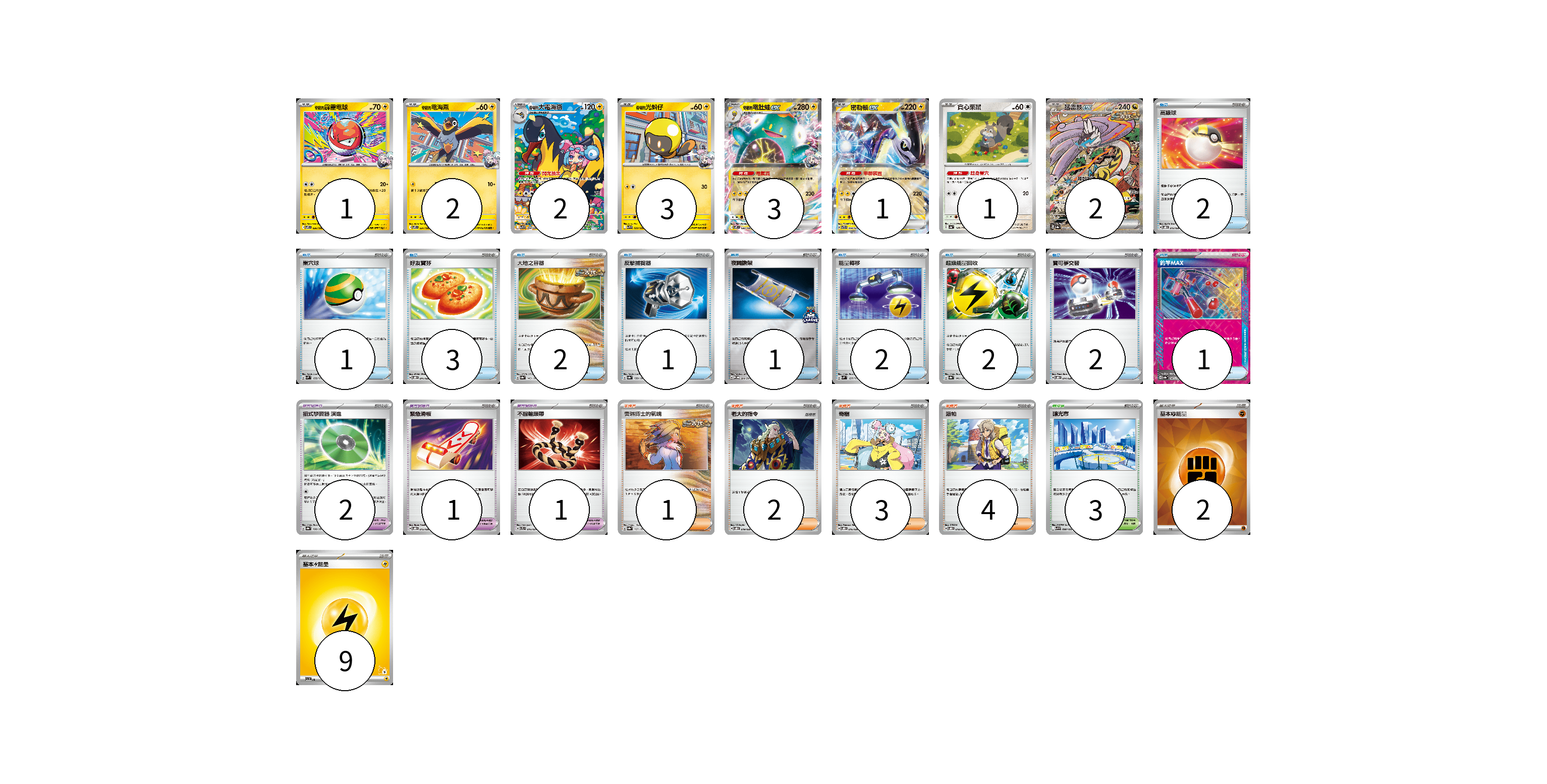 牌組構築方案 以此牌組為基礎新構築牌組 顯示卡面 顯示列表 寶可夢卡(15) 1 2 2 3 3 1 1 2 寶可夢道具(4) 2 1 1 物品卡(17) 2 1 3 2 1 1 2 2 2 1 支援者卡(10) 1 2 3 4 競技場卡(3) 3 能量卡(11) 2 9 寶可夢卡(15) 卡牌名稱 張數 卡牌名稱 張數 奇樹的霹靂電球 SV9 026/100 01 奇樹的電海燕 SV9 031/100 02 奇樹的大電海燕 SV9 104/100 02 奇樹的光蚪仔 SV9 029/100 03 奇樹的電肚蛙ex SV9 030/100 03 密勒頓ex SVTR 008/021 01 貪心栗鼠 SV4a 148/190 01 猛雷鼓ex SV8a 222/187 02 寶可夢道具(4) 卡牌名稱 張數 卡牌名稱 張數 招式學習器 演進 SV8a 160/187 02 緊急滑板 SVOD 015/020 01 不服輸頭帶 SVTL 016/021 01 物品卡(17) 卡牌名稱 張數 卡牌名稱 張數 高級球 SVOD 012/020 02 巢穴球 SVM 133/175 01 好友寶芬 SVOD 011/020 03 大地之容器 SV8a 143/187 02 反擊捕捉器 SV8a 139/187 01 夜間擔架 SV-P 204/SV-P 01 能量轉移 SVM 127/175 02 超級能量回收 SV8a 141/187 02 寶可夢交替 SVOD 014/020 02 釣竿MAX SV8a 142/187 01 支援者卡(10) 卡牌名稱 張數 卡牌名稱 張數 奧琳博士的氣魄 SV8a 167/187 01 老大的指令 SVOD 019/020 02 奇樹 SVOD 016/020 03 派帕 SVOD 018/020 04 競技場卡(3) 卡牌名稱 張數 卡牌名稱 張數 釀光市 SV9 098/100 03 能量卡(11) 卡牌名稱 張數 卡牌名稱 張數 基本【鬥】能量 SVK FIG 02 基本【雷】能量 SVI LIG 09 以此牌組為基礎新構築牌組 牌組編碼 NjiFbu-dBzLoc-tVTAEE copy 列印牌組單 牌組編碼已複製 分享至SNS