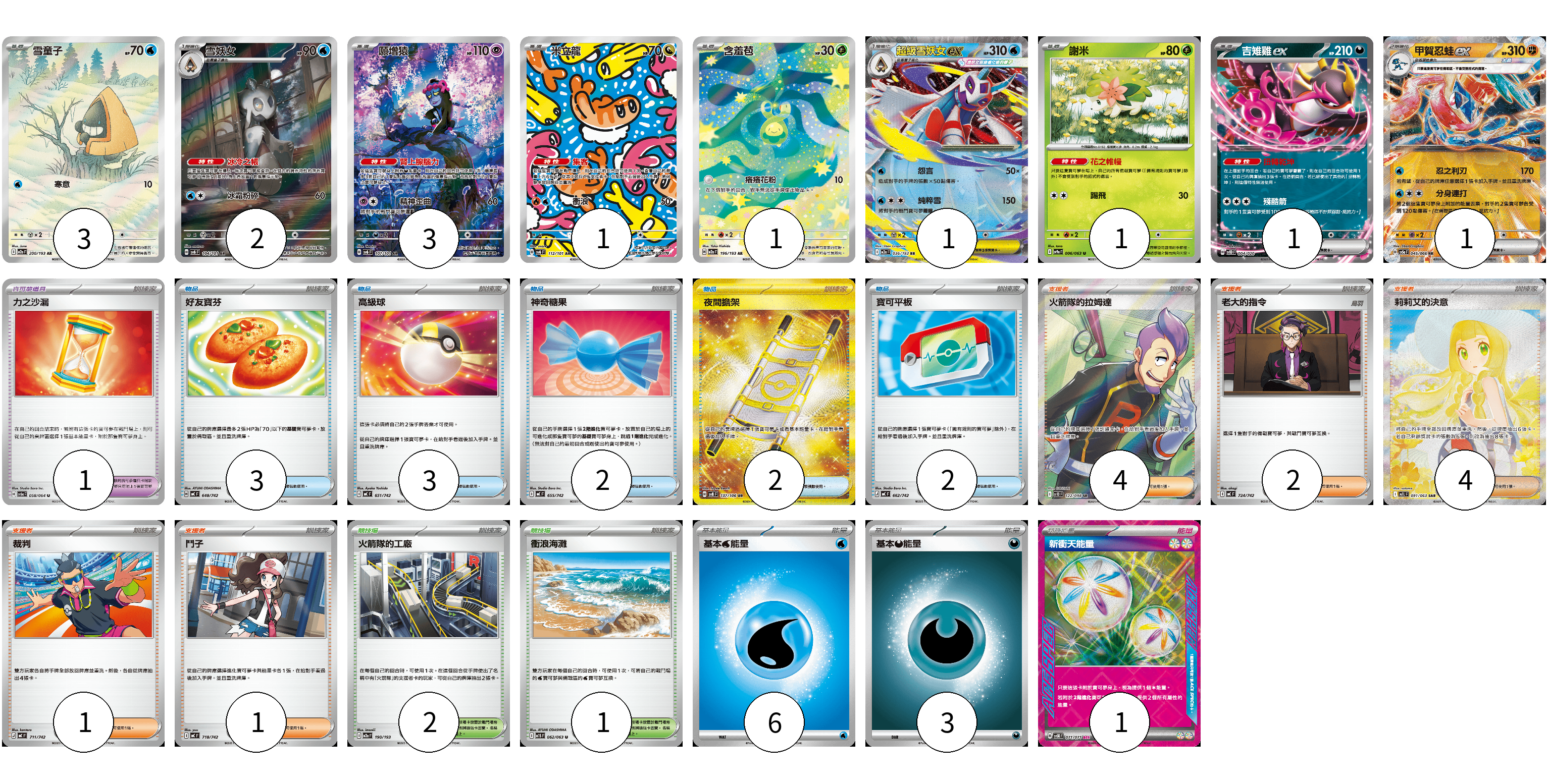 牌組構築方案 以此牌組為基礎新構築牌組 顯示卡面 顯示列表 寶可夢卡(14) 3 2 3 1 1 1 1 1 1 寶可夢道具(1) 1 物品卡(12) 3 3 2 2 2 支援者卡(12) 4 2 4 1 1 競技場卡(3) 2 1 能量卡(10) 6 3 1 寶可夢卡(14) 卡牌名稱 張數 卡牌名稱 張數 雪童子 M2a 200/193 03 雪妖女 SV6 104/101 02 願增猿 SV6 107/101 03 米立龍 SV6 112/101 01 含羞苞 M2a 196/193 01 超級雪妖女ex M2a 036/193 01 謝米 SV9a 006/063 01 吉雉雞ex SVOD 004/020 01 甲賀忍蛙ex SV5a 045/066 01 寶可夢道具(1) 卡牌名稱 張數 卡牌名稱 張數 力之沙漏 SV6a 058/064 01 物品卡(12) 卡牌名稱 張數 卡牌名稱 張數 好友寶芬 MC 648/742 03 高級球 MC 651/742 03 神奇糖果 MC 655/742 02 夜間擔架 SV8 137/106 02 寶可平板 MC 662/742 02 支援者卡(12) 卡牌名稱 張數 卡牌名稱 張數 火箭隊的拉姆達 SV10 122/098 04 老大的指令 MC 724/742 02 莉莉艾的決意 M1L 091/063 04 裁判 MC 711/742 01 鬥子 MC 718/742 01 競技場卡(3) 卡牌名稱 張數 卡牌名稱 張數 火箭隊的工廠 M2a 190/193 02 衝浪海灘 M1S 062/063 01 能量卡(10) 卡牌名稱 張數 卡牌名稱 張數 基本【水】能量 MC WAT 06 基本【惡】能量 MC DAR 03 新衝天能量 SV5K 071/071 01 以此牌組為基礎新構築牌組 牌組編碼 Nkgimp-wQHNQL-jrXqnL copy 列印牌組單 牌組編碼已複製 分享至SNS