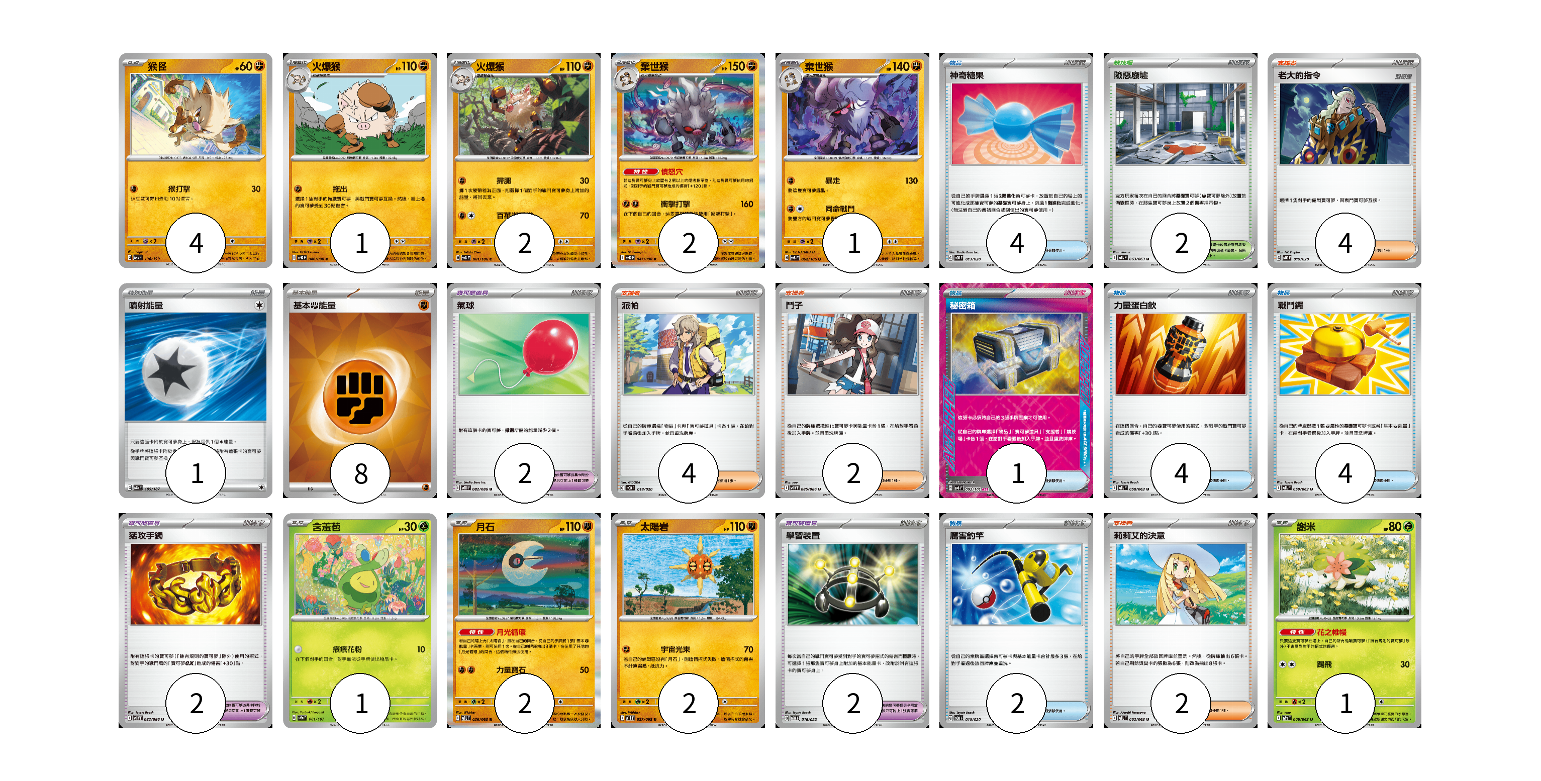 牌組構築方案 以此牌組為基礎新構築牌組 顯示卡面 顯示列表 寶可夢卡(16) 4 1 2 2 1 1 2 2 1 寶可夢道具(6) 2 2 2 物品卡(15) 4 1 4 4 2 支援者卡(12) 4 4 2 2 競技場卡(2) 2 能量卡(9) 1 8 寶可夢卡(16) 卡牌名稱 張數 卡牌名稱 張數 猴怪 SV4a 100/190 04 火爆猴 SV10 046/098 01 火爆猴 SV8 061/106 02 棄世猴 SV10 047/098 02 棄世猴 SV8 062/106 01 含羞苞 SV8a 001/187 01 月石 M1L 026/063 02 太陽岩 M1L 027/063 02 謝米 SV9a 006/063 01 寶可夢道具(6) 卡牌名稱 張數 卡牌名稱 張數 氣球 SV11B 082/086 02 猛攻手鐲 SV11W 082/086 02 學習裝置 SVTM 016/022 02 物品卡(15) 卡牌名稱 張數 卡牌名稱 張數 神奇糖果 SVOD 013/020 04 秘密箱 SV6 092/101 01 力量蛋白飲 M1L 058/063 04 戰鬥鑼 M1L 059/063 04 厲害釣竿 SVOD 010/020 02 支援者卡(12) 卡牌名稱 張數 卡牌名稱 張數 老大的指令 SVOD 019/020 04 派帕 SVOD 018/020 04 鬥子 SV11W 085/086 02 莉莉艾的決意 M1L 062/063 02 競技場卡(2) 卡牌名稱 張數 卡牌名稱 張數 險惡廢墟 M1L 063/063 02 能量卡(9) 卡牌名稱 張數 卡牌名稱 張數 噴射能量 SV8a 185/187 01 基本【鬥】能量 SVK FIG 08 以此牌組為基礎新構築牌組 牌組編碼 NlDAIA-RxWbzh-AnRFhr copy 列印牌組單 牌組編碼已複製 分享至SNS