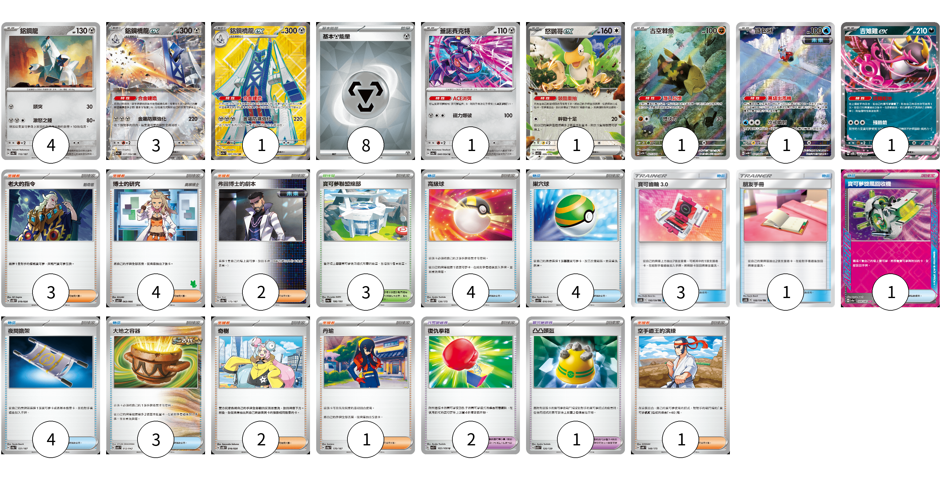 牌組構築方案 以此牌組為基礎新構築牌組 顯示卡面 顯示列表 寶可夢卡(13) 4 3 1 1 1 1 1 1 寶可夢道具(3) 2 1 物品卡(20) 4 4 3 1 1 4 3 支援者卡(13) 3 4 2 2 1 1 競技場卡(3) 3 能量卡(8) 8 寶可夢卡(13) 卡牌名稱 張數 卡牌名稱 張數 鋁鋼龍 SV8a 112/187 04 鋁鋼橋龍ex SV7a 037/064 03 鋁鋼橋龍ex SV7a 080/064 01 蓋諾賽克特 SV6a 040/064 01 怒鸚哥ex SVK 006/042 01 古空棘魚 SV5K 077/071 01 鐵包袱 SV4M 071/066 01 吉雉雞ex SVOD 004/020 01 寶可夢道具(3) 卡牌名稱 張數 卡牌名稱 張數 復仇拳箱 SV3 102/108 02 凸凸頭盔 SVD 126/139 01 物品卡(20) 卡牌名稱 張數 卡牌名稱 張數 高級球 SVM 134/175 04 巢穴球 SVK 016/042 04 寶可齒輪3.0 AS6b 190/194 03 朋友手冊 AS6b 188/194 01 寶可夢旋風回收機 SV8a 149/187 01 夜間擔架 SV8a 151/187 04 大地之容器 SVK 012/042 03 支援者卡(13) 卡牌名稱 張數 卡牌名稱 張數 老大的指令 SVOD 019/020 03 博士的研究 SVI 063/066 04 弗圖博士的劇本 SV8a 175/187 02 奇樹 SVOD 016/020 02 丹瑜 SV8a 170/187 01 空手道王的演練 SVM 148/175 01 競技場卡(3) 卡牌名稱 張數 卡牌名稱 張數 寶可夢聯盟總部 SV4a 186/190 03 能量卡(8) 卡牌名稱 張數 卡牌名稱 張數 基本【鋼】能量 SVOD MET 08 以此牌組為基礎新構築牌組 牌組編碼 NlUzIW-ZgEueQ-EWmkoQ copy 列印牌組單 牌組編碼已複製 分享至SNS