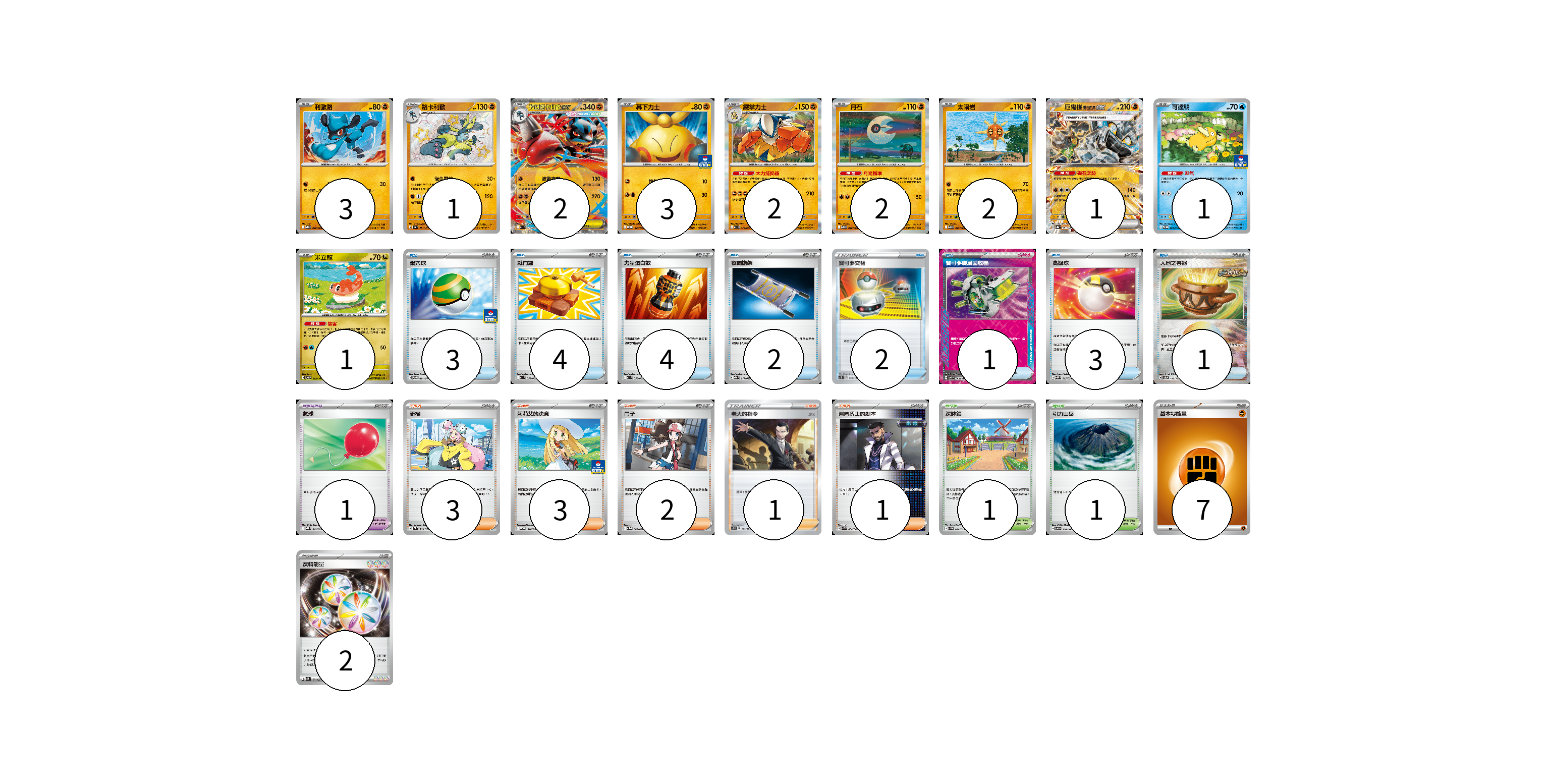 牌組構築方案 以此牌組為基礎新構築牌組 顯示卡面 顯示列表 寶可夢卡(18) 3 1 2 3 2 2 2 1 1 1 寶可夢道具(1) 1 物品卡(20) 3 4 4 2 2 1 3 1 支援者卡(10) 3 3 2 1 1 競技場卡(2) 1 1 能量卡(9) 7 2 寶可夢卡(18) 卡牌名稱 張數 卡牌名稱 張數 利歐路 M1L 028/063 03 路卡利歐 SV4a 281/190 01 超級路卡利歐ex M1L 029/063 02 幕下力士 M-P 015/M-P 03 鐵掌力士 M1L 025/063 02 月石 M1L 026/063 02 太陽岩 M1L 027/063 02 厄鬼椪 礎石面具ex SV8a 091/187 01 可達鴨 SV-P 220/SV-P 01 米立龍 SV6 082/101 01 寶可夢道具(1) 卡牌名稱 張數 卡牌名稱 張數 氣球 MBG 019/022 01 物品卡(20) 卡牌名稱 張數 卡牌名稱 張數 巢穴球 SV-P 091/SV-P 03 戰鬥鑼 M1L 059/063 04 力量蛋白飲 M1L 058/063 04 夜間擔架 MBG 017/022 02 寶可夢交替 SC1D 155/164 02 寶可夢旋風回收機 SV6 093/101 01 高級球 SVQP 015/023 03 大地之容器 SV8a 143/187 01 支援者卡(10) 卡牌名稱 張數 卡牌名稱 張數 奇樹 SV2D 069/071 03 莉莉艾的決意 M-P 018/M-P 03 鬥子 SV11W 085/086 02 老大的指令(坂木) SC1D 161/164 01 弗圖博士的劇本 SVK 034/042 01 競技場卡(2) 卡牌名稱 張數 卡牌名稱 張數 深缽鎮 SVF 036/038 01 引力山岳 SV8 106/106 01 能量卡(9) 卡牌名稱 張數 卡牌名稱 張數 基本【鬥】能量 SVAM FIG 07 反轉能量 SV2P 071/071 02 以此牌組為基礎新構築牌組 牌組編碼 NoWsCW-yqXqGE-jLZAga copy 列印牌組單 牌組編碼已複製 分享至SNS