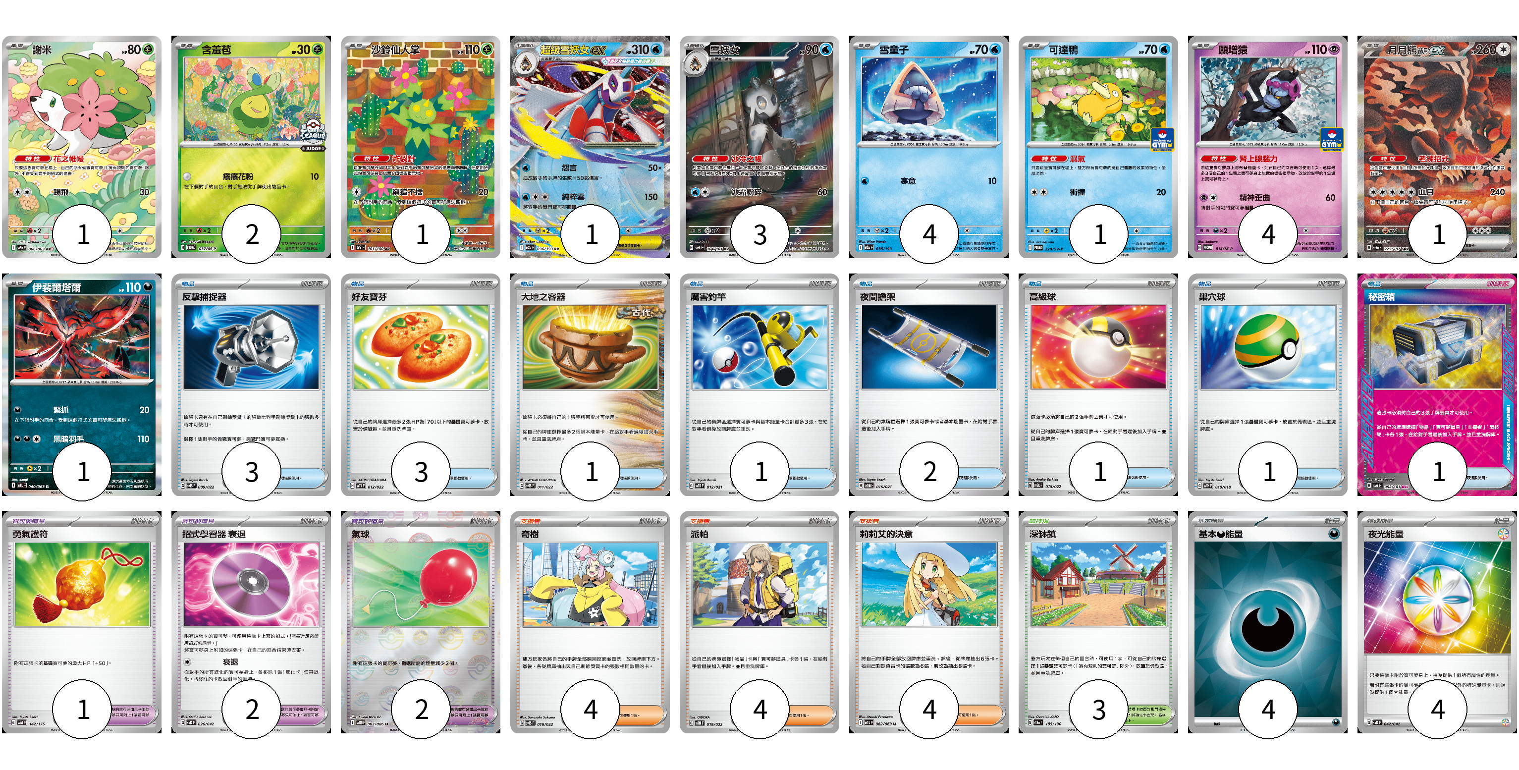 牌組構築方案 以此牌組為基礎新構築牌組 顯示卡面 顯示列表 寶可夢卡(19) 1 2 1 1 3 4 1 4 1 1 寶可夢道具(5) 1 2 2 物品卡(13) 3 3 1 1 2 1 1 1 支援者卡(12) 4 4 4 競技場卡(3) 3 能量卡(8) 4 4 寶可夢卡(19) 卡牌名稱 張數 卡牌名稱 張數 謝米 SV9a 066/063 01 含羞苞 M-P 037/M-P 02 沙鈴仙人掌 SV9 101/100 01 超級雪妖女ex M2a 036/193 01 雪妖女 SV6 104/101 03 雪童子 M2a 035/193 04 可達鴨 SV-P 220/SV-P 01 願增猿 M-P 014/M-P 04 月月熊 赫月ex SV8a 225/187 01 伊裴爾塔爾 M1L 040/063 01 寶可夢道具(5) 卡牌名稱 張數 卡牌名稱 張數 勇氣護符 SVM 142/175 01 招式學習器 衰退 SVK 026/042 02 氣球 SV11B 082/086 02 物品卡(13) 卡牌名稱 張數 卡牌名稱 張數 反擊捕捉器 SVTS 009/022 03 好友寶芬 SVTS 012/022 03 大地之容器 SVTS 011/022 01 厲害釣竿 SVTR 012/021 01 夜間擔架 SVOM 016/021 02 高級球 SVQL 015/022 01 巢穴球 SVTH 010/018 01 秘密箱 SV6 092/101 01 支援者卡(12) 卡牌名稱 張數 卡牌名稱 張數 奇樹 SVTS 018/022 04 派帕 SVTM 019/022 04 莉莉艾的決意 M1L 062/063 04 競技場卡(3) 卡牌名稱 張數 卡牌名稱 張數 深缽鎮 SV4a 185/190 03 能量卡(8) 卡牌名稱 張數 卡牌名稱 張數 基本【惡】能量 SVOM DAR 04 夜光能量 SVK 042/042 04 以此牌組為基礎新構築牌組 牌組編碼 NpDvZG-fzdktA-iAoEgF copy 列印牌組單 牌組編碼已複製 分享至SNS