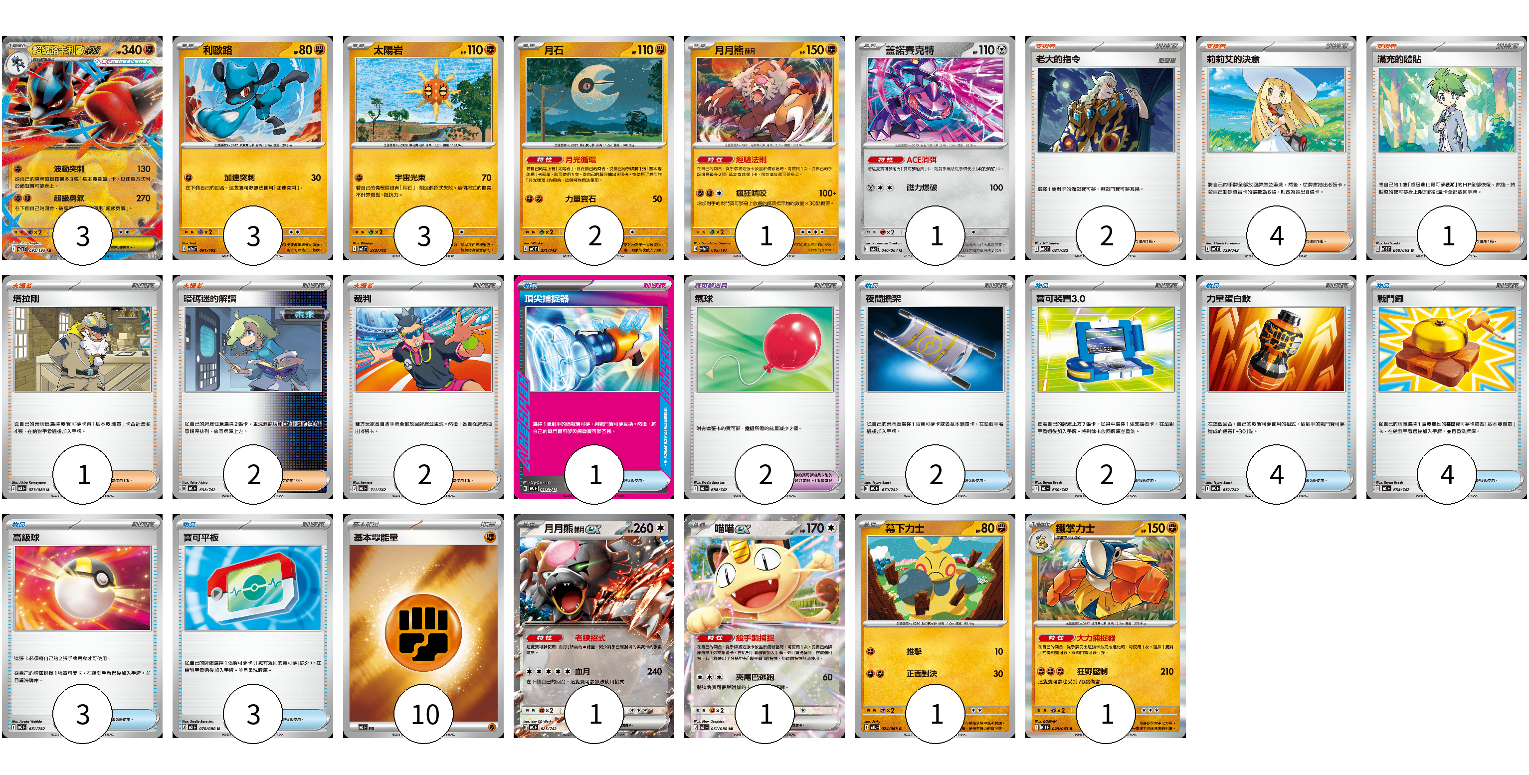 牌組構築方案 以此牌組為基礎新構築牌組 顯示卡面 顯示列表 寶可夢卡(17) 3 3 3 2 1 1 1 1 1 1 寶可夢道具(2) 2 物品卡(19) 1 2 2 4 4 3 3 支援者卡(12) 2 4 1 1 2 2 能量卡(10) 10 寶可夢卡(17) 卡牌名稱 張數 卡牌名稱 張數 超級路卡利歐ex M2a 092/193 03 利歐路 M2a 091/193 03 太陽岩 MC 372/742 03 月石 MC 371/742 02 月月熊 赫月 SV8a 085/187 01 蓋諾賽克特 SV6a 040/064 01 月月熊 赫月 ex MC 625/742 01 喵喵ex M3 061/080 01 幕下力士 M1L 024/063 01 鐵掌力士 M1L 025/063 01 寶可夢道具(2) 卡牌名稱 張數 卡牌名稱 張數 氣球 MC 688/742 02 物品卡(19) 卡牌名稱 張數 卡牌名稱 張數 頂尖捕捉器 MC 656/742 01 夜間擔架 MC 670/742 02 寶可裝置3.0 MC 660/742 02 力量蛋白飲 MC 652/742 04 戰鬥鑼 MC 654/742 04 高級球 MC 651/742 03 寶可平板 M3 070/080 03 支援者卡(12) 卡牌名稱 張數 卡牌名稱 張數 老大的指令 MBG 021/022 02 莉莉艾的決意 MC 729/742 04 滿充的體貼 M1S 060/063 01 塔拉剛 M3 073/080 01 暗碼迷的解讀 MC 698/742 02 裁判 MC 711/742 02 能量卡(10) 卡牌名稱 張數 卡牌名稱 張數 基本【鬥】能量 MC FIG 10 以此牌組為基礎新構築牌組 牌組編碼 NpzJOf-XVMuon-SeYyIB copy 列印牌組單 牌組編碼已複製 分享至SNS
