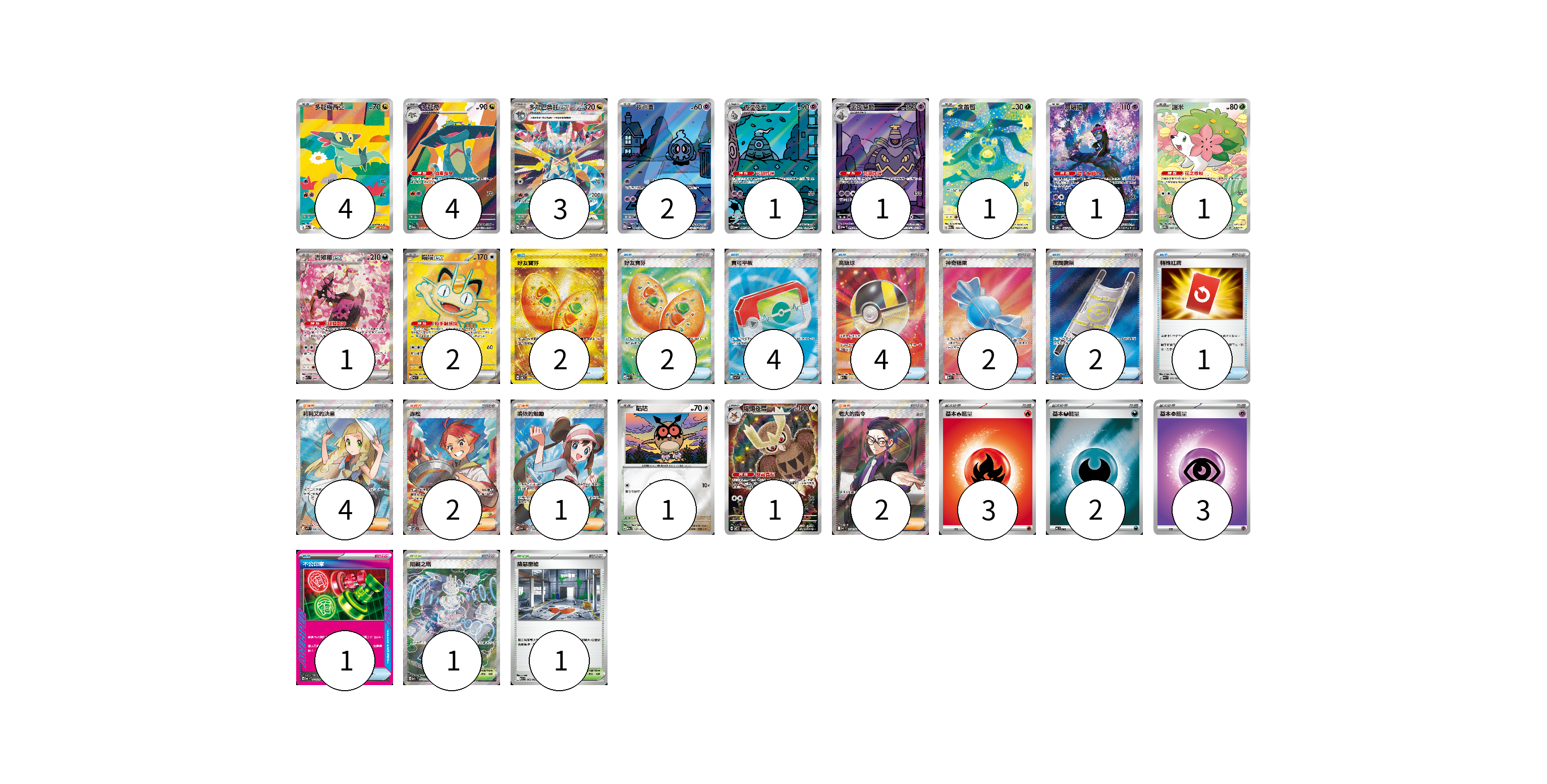 牌組構築方案 以此牌組為基礎新構築牌組 顯示卡面 顯示列表 寶可夢卡(23) 4 4 3 2 1 1 1 1 1 1 2 1 1 物品卡(18) 2 2 4 4 2 2 1 1 支援者卡(9) 4 2 1 2 競技場卡(2) 1 1 能量卡(8) 3 2 3 寶可夢卡(23) 卡牌名稱 張數 卡牌名稱 張數 多龍梅西亞 M2a 211/193 04 多龍奇 M2a 212/193 04 多龍巴魯托ex SV8a 221/187 03 夜巡靈 SV6a 068/064 02 彷徨夜靈 SV6a 069/064 01 黑夜魔靈 SV6a 070/064 01 含羞苞 M2a 196/193 01 願增猿 SV6 107/101 01 謝米 SV9a 066/063 01 吉雉雞ex M2a 244/193 01 喵喵ex M3 100/080 02 咕咕 M2a 137/193 01 貓頭夜鷹 SV7 114/102 01 物品卡(18) 卡牌名稱 張數 卡牌名稱 張數 好友寶芬 SV6 133/101 02 好友寶芬 M1S 081/063 02 寶可平板 M3 103/080 04 高級球 M2a 216/193 04 神奇糖果 M1S 082/063 02 夜間擔架 M1L 083/063 02 特殊紅牌 M4 072/083 01 不公印章 MC 633/742 01 支援者卡(9) 卡牌名稱 張數 卡牌名稱 張數 莉莉艾的決意 M1L 086/063 04 赤松 SV7 123/102 02 鳴依的勉勵 M3 107/080 01 老大的指令(烏羽) MC 760/742 02 競技場卡(2) 卡牌名稱 張數 卡牌名稱 張數 阻礙之塔 M2a 222/193 01 險惡廢墟 M1L 063/063 01 能量卡(8) 卡牌名稱 張數 卡牌名稱 張數 基本【火】能量 MC FIR 03 基本【惡】能量 MC DAR 02 基本【超】能量 M-P PSY 03 以此牌組為基礎新構築牌組 牌組編碼 NqEVZK-JgQZXi-PnKyki copy 列印牌組單 牌組編碼已複製 分享至SNS