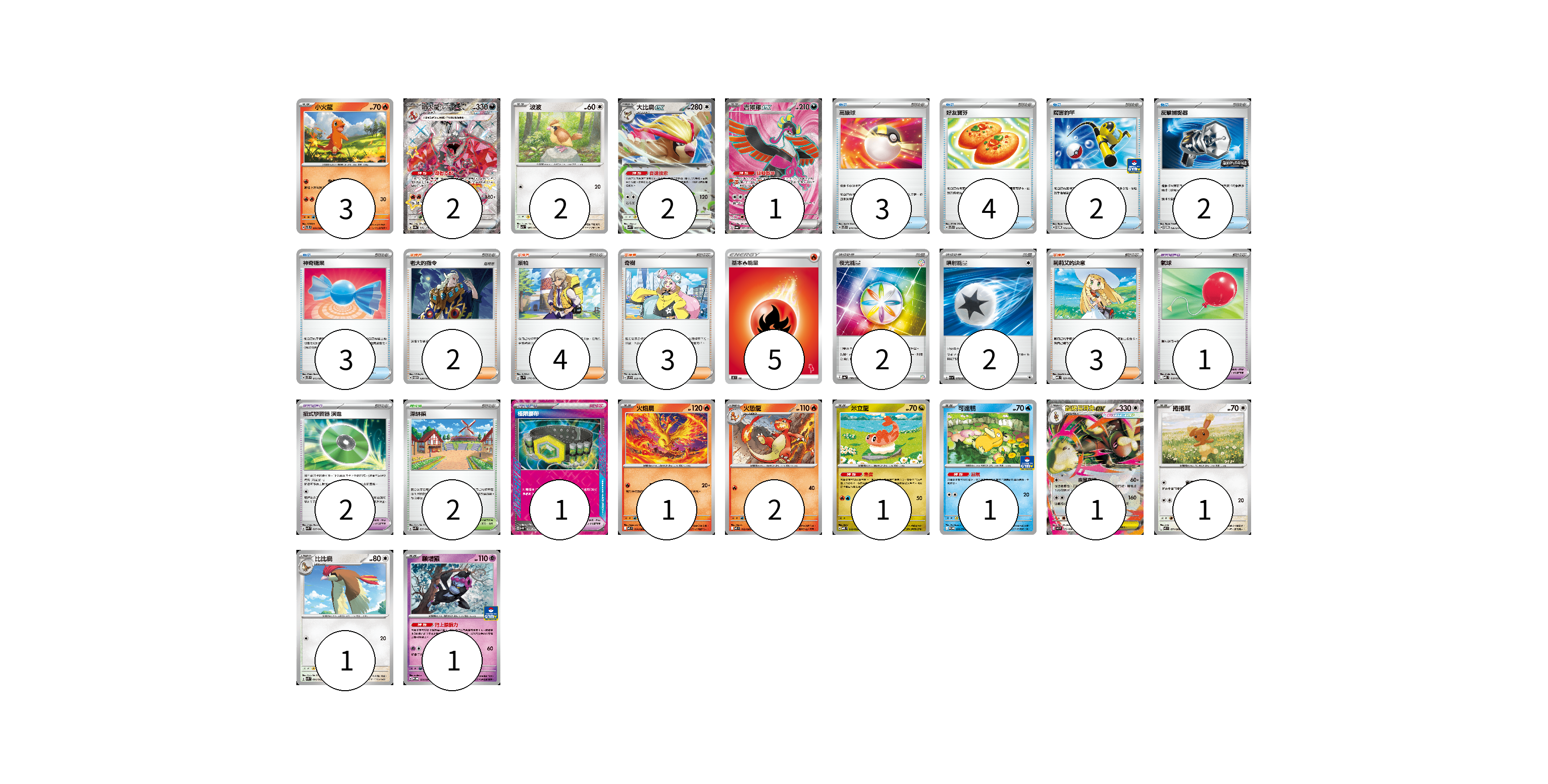 牌組構築方案 以此牌組為基礎新構築牌組 顯示卡面 顯示列表 寶可夢卡(19) 3 2 2 2 1 1 2 1 1 1 1 1 1 寶可夢道具(4) 1 2 1 物品卡(14) 3 4 2 2 3 支援者卡(12) 2 4 3 3 競技場卡(2) 2 能量卡(9) 5 2 2 寶可夢卡(19) 卡牌名稱 張數 卡牌名稱 張數 小火龍 SVTL 001/021 03 噴火龍ex SV4a 331/190 02 波波 SV3 087/108 02 大比鳥ex SVK 005/042 02 吉雉雞ex SV6a 081/064 01 火焰鳥 M2 014/080 01 火恐龍 M2 012/080 02 米立龍 MBD 010/022 01 可達鴨 SV-P 220/SV-P 01 超級長耳兔ex M2 072/080 01 捲捲耳 M2 071/080 01 比比鳥 SVK 004/042 01 願增猿 M-P 014/M-P 01 寶可夢道具(4) 卡牌名稱 張數 卡牌名稱 張數 氣球 MBD 018/022 01 招式學習器 演進 SVK 025/042 02 極限腰帶 SV5K 066/071 01 物品卡(14) 卡牌名稱 張數 卡牌名稱 張數 高級球 SVTS 014/022 03 好友寶芬 SVTS 012/022 04 厲害釣竿 SV-P 112/SV-P 02 反擊捕捉器 SV-P 136/SV-P 02 神奇糖果 SVTS 015/022 03 支援者卡(12) 卡牌名稱 張數 卡牌名稱 張數 老大的指令 SVTM 020/022 02 派帕 SV1V 076/078 04 奇樹 SVF 029/038 03 莉莉艾的決意 MBD 021/022 03 競技場卡(2) 卡牌名稱 張數 卡牌名稱 張數 深缽鎮 SVK 039/042 02 能量卡(9) 卡牌名稱 張數 卡牌名稱 張數 基本火能量 SH FIR 05 夜光能量 SV4a 190/190 02 噴射能量 SV1a 072/073 02 以此牌組為基礎新構築牌組 牌組編碼 NqeFqn-cMQVOB-AnjEpA copy 列印牌組單 牌組編碼已複製 分享至SNS