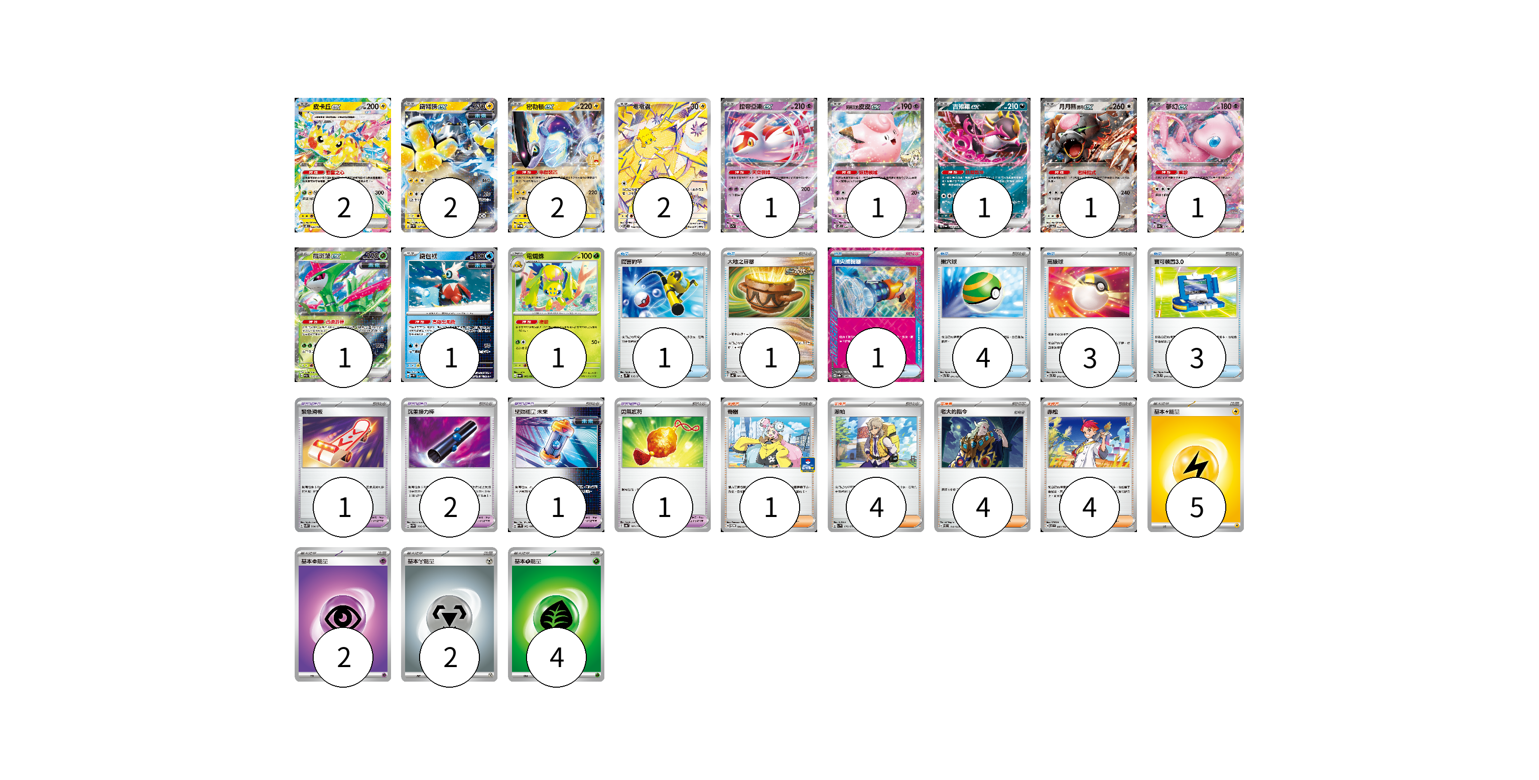 牌組構築方案 以此牌組為基礎新構築牌組 顯示卡面 顯示列表 寶可夢卡(16) 2 2 2 2 1 1 1 1 1 1 1 1 寶可夢道具(5) 1 2 1 1 物品卡(13) 1 1 1 4 3 3 支援者卡(13) 1 4 4 4 能量卡(13) 5 2 2 4 寶可夢卡(16) 卡牌名稱 張數 卡牌名稱 張數 皮卡丘ex SV8 033/106 02 鐵臂膀ex SV4M 027/066 02 密勒頓ex SV-P 164/SV-P 02 電電蟲 SV7 108/102 02 拉帝亞斯ex SV7a 019/064 01 莉莉艾的皮皮ex SV9 033/100 01 吉雉雞ex SV6a 038/064 01 月月熊 赫月 ex SV5a 052/066 01 夢幻ex SV4a 076/190 01 鐵斑葉ex SV5M 016/071 01 鐵包袱 SV4M 020/066 01 電蜘蛛 SV6a 002/064 01 寶可夢道具(5) 卡牌名稱 張數 卡牌名稱 張數 緊急滑板 SV5K 064/071 01 沉重接力棒 SV5M 066/071 02 驅勁能量 未來 SV4M 062/066 01 勇氣護符 SV4a 169/190 01 物品卡(13) 卡牌名稱 張數 卡牌名稱 張數 厲害釣竿 SV2P 066/071 01 大地之容器 SV4K 060/066 01 頂尖捕捉器 SV8a 148/187 01 巢穴球 SVTL 011/021 04 高級球 SVTL 012/021 03 寶可裝置3.0 SVTL 014/021 03 支援者卡(13) 卡牌名稱 張數 卡牌名稱 張數 奇樹 SV-P 106/SV-P 01 派帕 SV1V 076/078 04 老大的指令 SVEL 019/020 04 赤松 SV7 097/102 04 能量卡(13) 卡牌名稱 張數 卡牌名稱 張數 基本雷能量 sv-p LIG 05 基本超能量 sv-p PSY 02 基本鋼能量 sv-p MET 02 基本草能量 sv-p GRA 04 以此牌組為基礎新構築牌組 牌組編碼 NryPBw-eiwQCb-dlMfnG copy 列印牌組單 牌組編碼已複製 分享至SNS
