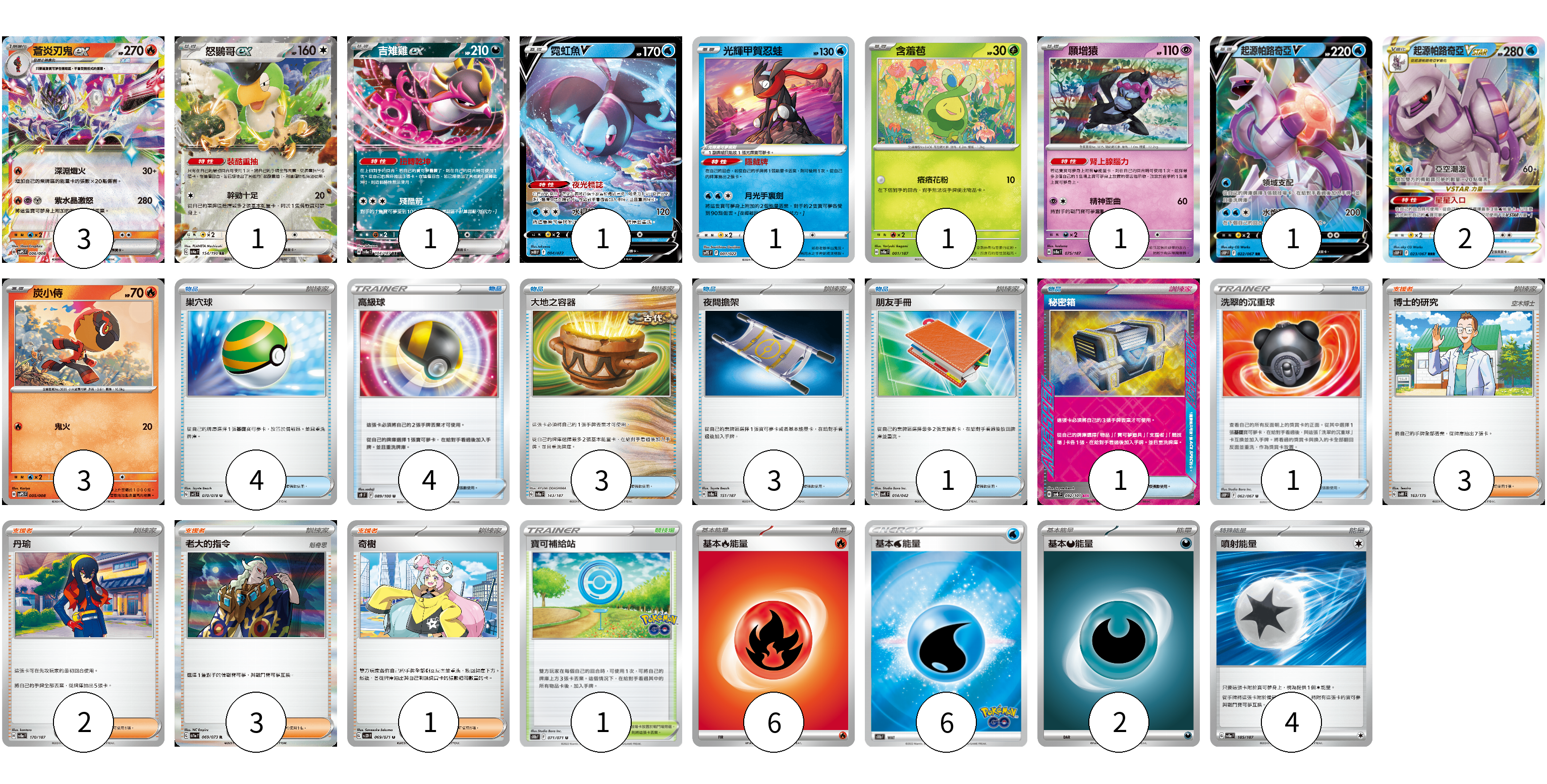 牌組構築方案 以此牌組為基礎新構築牌組 顯示卡面 顯示列表 寶可夢卡(15) 3 1 1 1 1 1 1 1 2 3 物品卡(17) 4 4 3 3 1 1 1 支援者卡(9) 3 2 3 1 競技場卡(1) 1 能量卡(18) 6 6 2 4 寶可夢卡(15) 卡牌名稱 張數 卡牌名稱 張數 蒼炎刃鬼ex SVPS 006/008 03 怒鸚哥ex SV4a 154/190 01 吉雉雞ex SV8a 104/187 01 霓虹魚V SVHK 004/022 01 光輝甲賀忍蛙 SVTS 001/022 01 含羞苞 SV8a 001/187 01 願增猿 SV8a 075/187 01 起源帕路奇亞V S10P 022/067 01 起源帕路奇亞VSTAR S10P 023/067 02 炭小侍 SVPS 005/008 03 物品卡(17) 卡牌名稱 張數 卡牌名稱 張數 巢穴球 SV1S 070/078 04 高級球 S9 089/100 04 大地之容器 SV8a 143/187 03 夜間擔架 SV8a 151/187 03 朋友手冊 SVK 014/042 01 秘密箱 SV6 092/101 01 洗翠的沉重球 S10P 062/067 01 支援者卡(9) 卡牌名稱 張數 卡牌名稱 張數 博士的研究 SVM 163/175 03 丹瑜 SV8a 170/187 02 老大的指令 SV1a 069/073 03 奇樹 SV2D 069/071 01 競技場卡(1) 卡牌名稱 張數 卡牌名稱 張數 寶可補給站 S10b 071/071 01 能量卡(18) 卡牌名稱 張數 卡牌名稱 張數 基本【火】能量 SVEL FIR 06 基本水能量 S10b WAT 06 基本【惡】能量 SVF DAR 02 噴射能量 SV8a 185/187 04 以此牌組為基礎新構築牌組 牌組編碼 NsfURc-ggjsxe-oSueWN copy 列印牌組單 牌組編碼已複製 分享至SNS