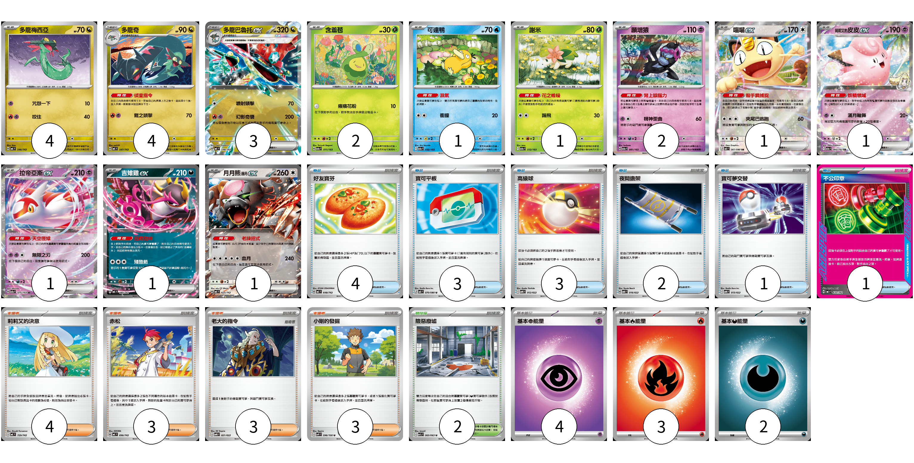 牌組構築方案 以此牌組為基礎新構築牌組 顯示卡面 顯示列表 寶可夢卡(22) 4 4 3 2 1 1 2 1 1 1 1 1 物品卡(14) 4 3 3 2 1 1 支援者卡(13) 4 3 3 3 競技場卡(2) 2 能量卡(9) 4 3 2 寶可夢卡(22) 卡牌名稱 張數 卡牌名稱 張數 多龍梅西亞 MC 546/742 04 多龍奇 MC 547/742 04 多龍巴魯托ex MC 548/742 03 含羞苞 M2a 011/193 02 可達鴨 M2a 032/193 01 謝米 M2a 012/193 01 願增猿 M2a 081/193 02 喵喵ex M3 061/080 01 莉莉艾的皮皮ex M2a 060/193 01 拉帝亞斯ex M2a 075/193 01 吉雉雞ex MC 489/742 01 月月熊 赫月 ex MC 625/742 01 物品卡(14) 卡牌名稱 張數 卡牌名稱 張數 好友寶芬 MC 648/742 04 寶可平板 M3 070/080 03 高級球 MBG 012/022 03 夜間擔架 MBD 016/022 02 寶可夢交替 MBG 015/022 01 不公印章 MC 633/742 01 支援者卡(13) 卡牌名稱 張數 卡牌名稱 張數 莉莉艾的決意 MC 729/742 04 赤松 MC 696/742 03 老大的指令 MBG 021/022 03 小剛的發掘 SV9 096/100 03 競技場卡(2) 卡牌名稱 張數 卡牌名稱 張數 險惡廢墟 M1L 063/063 02 能量卡(9) 卡牌名稱 張數 卡牌名稱 張數 基本【超】能量 MC PSY 04 基本【火】能量 MC FIR 03 基本【惡】能量 MC DAR 02 以此牌組為基礎新構築牌組 牌組編碼 NtkHsy-KTcKAc-uKKsfM copy 列印牌組單 牌組編碼已複製 分享至SNS