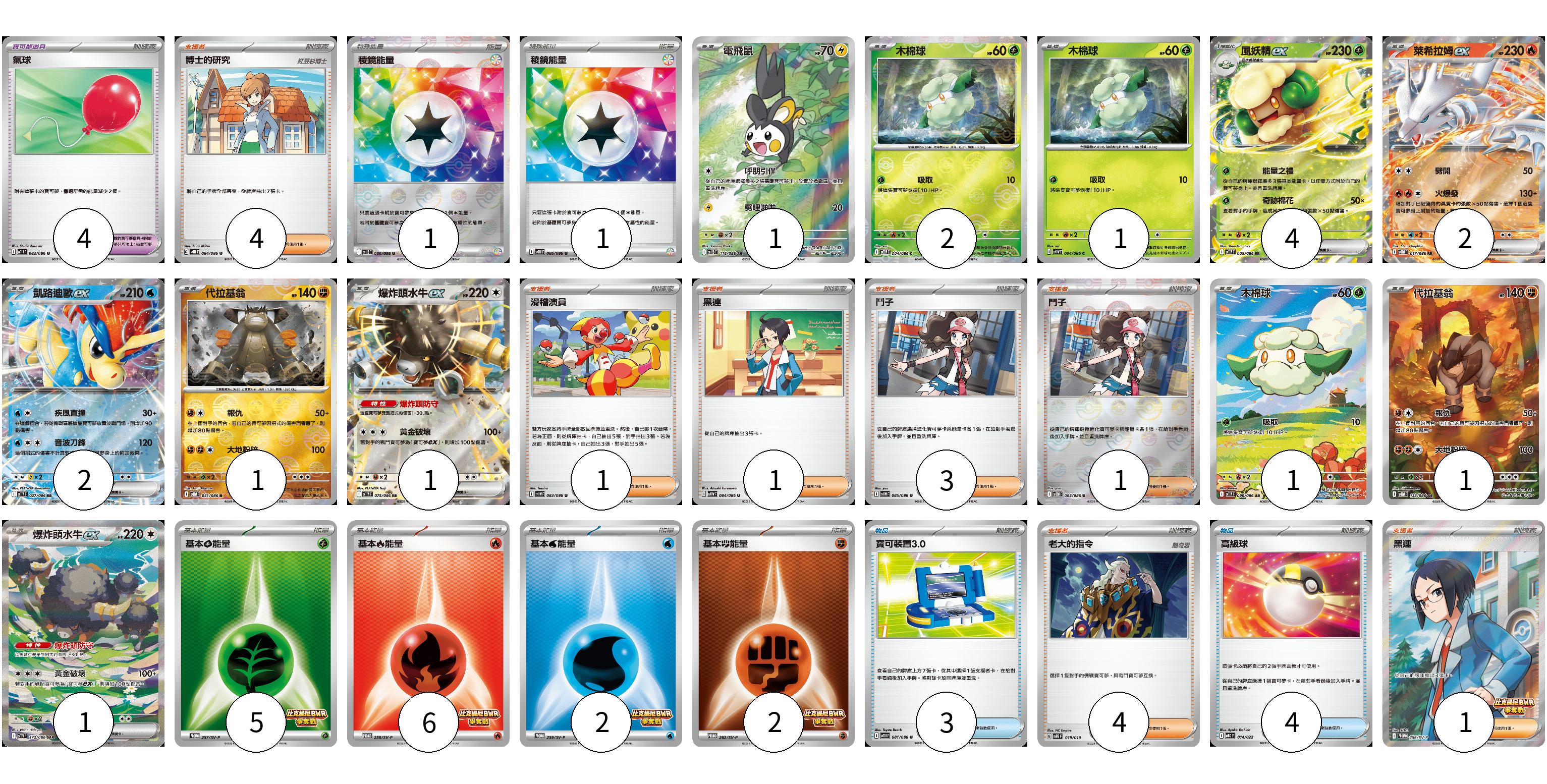 牌組構築方案 以此牌組為基礎新構築牌組 顯示卡面 顯示列表 寶可夢卡(17) 1 2 1 4 2 2 1 1 1 1 1 寶可夢道具(4) 4 物品卡(7) 3 4 支援者卡(15) 4 1 1 3 1 4 1 能量卡(17) 1 1 5 6 2 2 寶可夢卡(17) 卡牌名稱 張數 卡牌名稱 張數 電飛鼠 SV11B 116/086 01 木棉球 SV11W 004/086 02 木棉球 SV11W 004/086 01 風妖精ex SV11W 005/086 04 萊希拉姆ex SV11W 017/086 02 凱路迪歐ex SV11W 027/086 02 代拉基翁 SV11W 051/086 01 爆炸頭水牛ex SV11W 075/086 01 木棉球 SV11W 090/086 01 代拉基翁 SV11W 133/086 01 爆炸頭水牛ex SV11W 172/086 01 寶可夢道具(4) 卡牌名稱 張數 卡牌名稱 張數 氣球 SV11B 082/086 04 物品卡(7) 卡牌名稱 張數 卡牌名稱 張數 寶可裝置3.0 SV11B 081/086 03 高級球 MBD 014/022 04 支援者卡(15) 卡牌名稱 張數 卡牌名稱 張數 博士的研究 SV11B 084/086 04 滑稽演員 SV11W 083/086 01 黑連 SV11W 084/086 01 鬥子 SV11W 085/086 03 鬥子 SV11W 085/086 01 老大的指令 SVTG 019/019 04 黑連 SV-P 256/SV-P 01 能量卡(17) 卡牌名稱 張數 卡牌名稱 張數 稜鏡能量 SV11B 086/086 01 稜鏡能量 SV11B 086/086 01 基本【草】能量 SV-P 257/SV-P 05 基本【火】能量 SV-P 258/SV-P 06 基本【水】能量 SV-P 259/SV-P 02 基本【鬥】能量 SV-P 262/SV-P 02 以此牌組為基礎新構築牌組 牌組編碼 NtyjZU-OeMFfD-BjOJPP copy 列印牌組單 牌組編碼已複製 分享至SNS